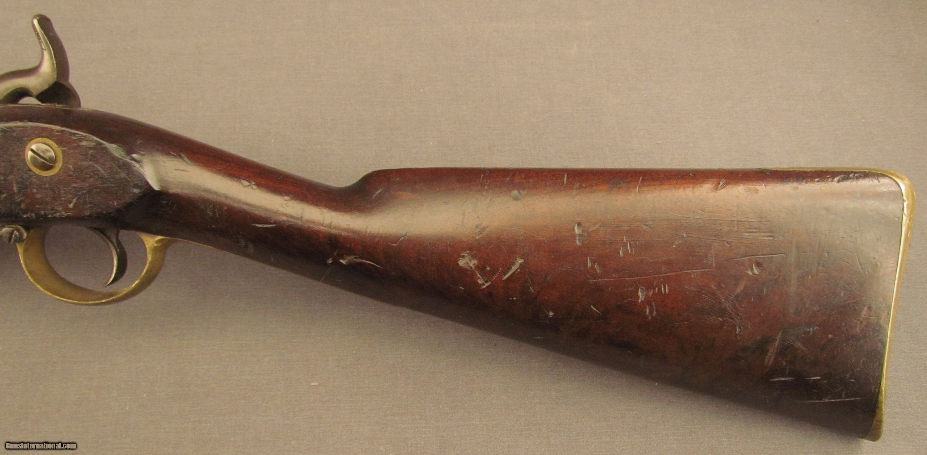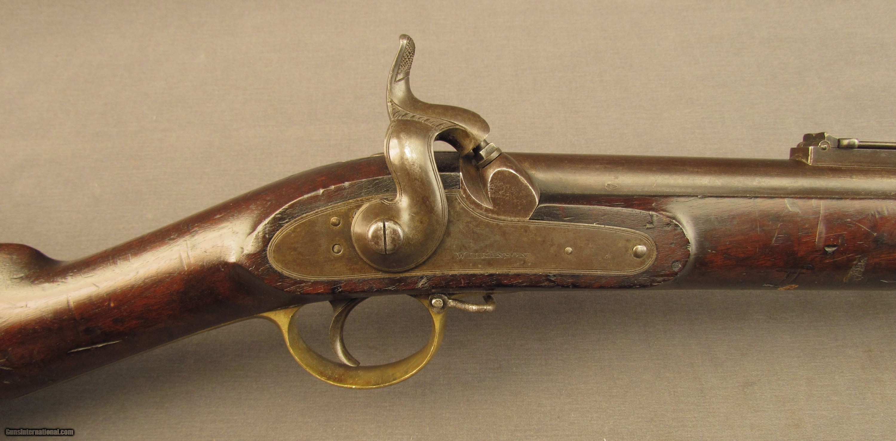 Description: Wilkinson reduced bore rifle from the 1852 British trials. This Wilkinson rifle is basically a scaled down Patt 51 rifled musket in 0.530 bore. The barrel is 39", 5 groove with ratchet rifling with a bright excellent bore. For reference see "The British Soldier's Firearm 1850-1864 by C.H. roads pages 48-53 . This example retains its' original rear sight and the front sight is a dovetailed replacement as is the rammer. The barrel retains about 70% of its' original finish. The wood is very sound showing only minor usage and storage marks. The brass fittings show no evidence of polishing and have a mellow patina. This example is mechanically sound and is a very scarce item for any serious British Military Collector. being a trials rifle there were very few examples built. Most surviving examples are in military institutions and few in private hands. A scarce item. SOLD Antique: Yes Manufacturer: Wilkinson Model: 1852 Serial Number: NSN Caliber Info: .530 Gauge Info: .530 |
