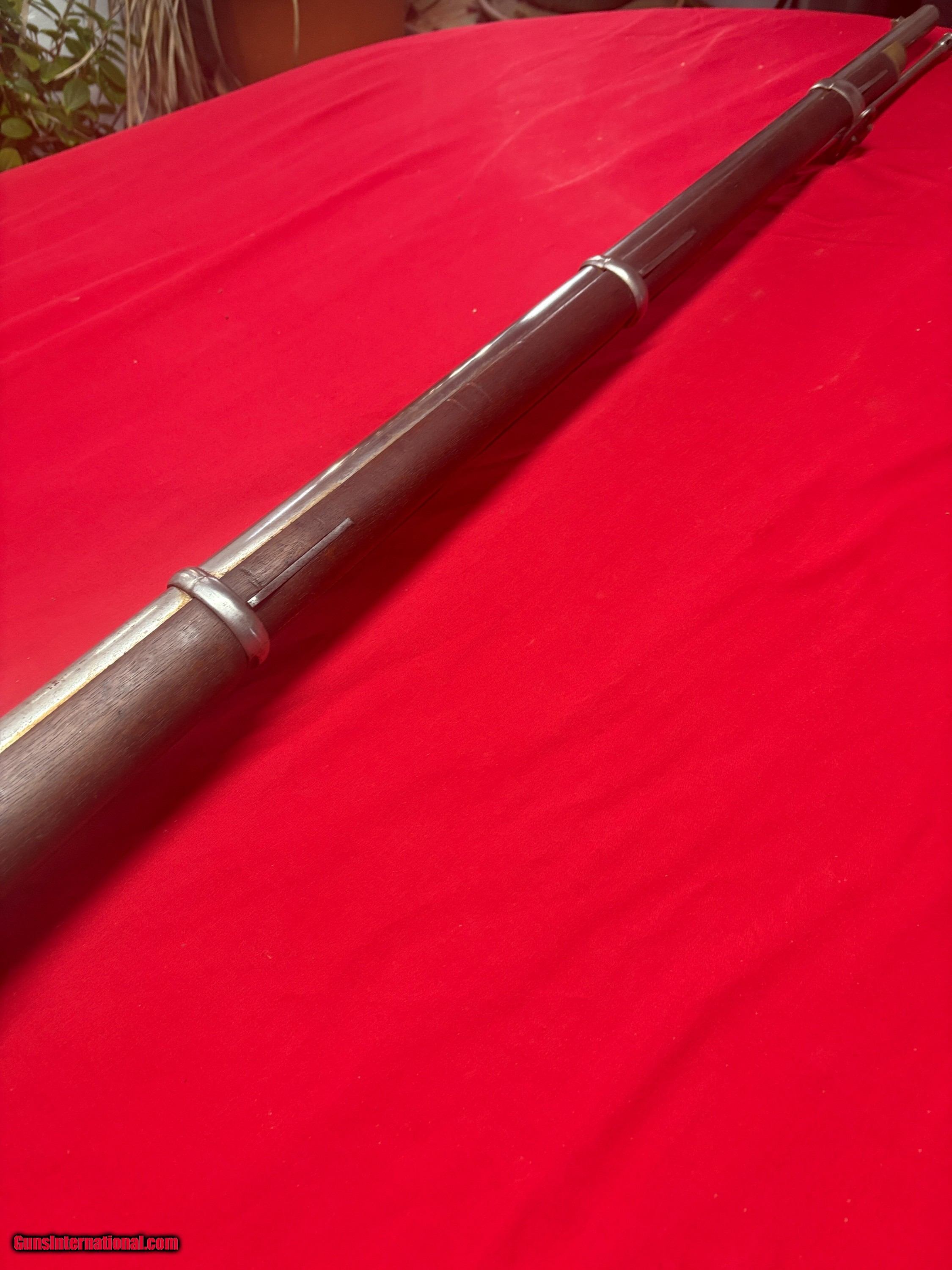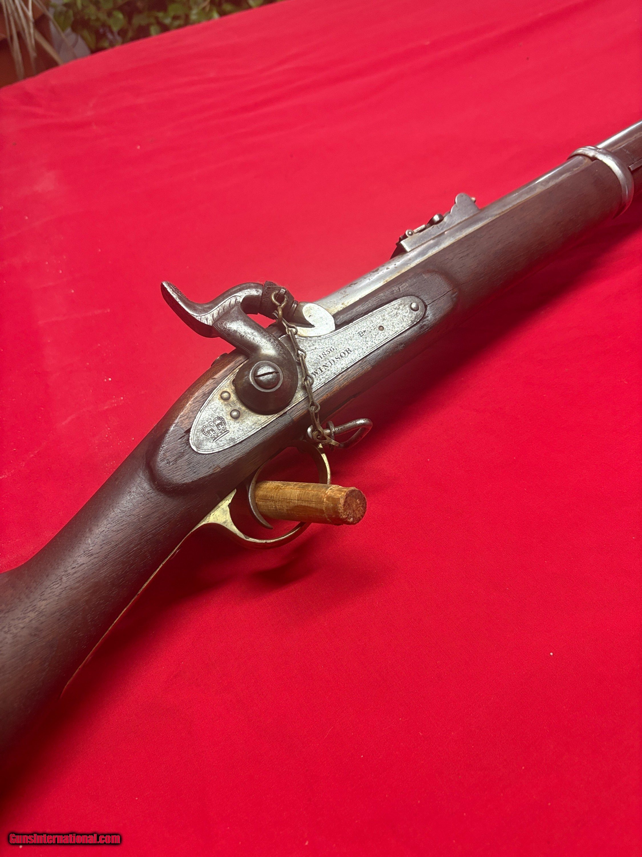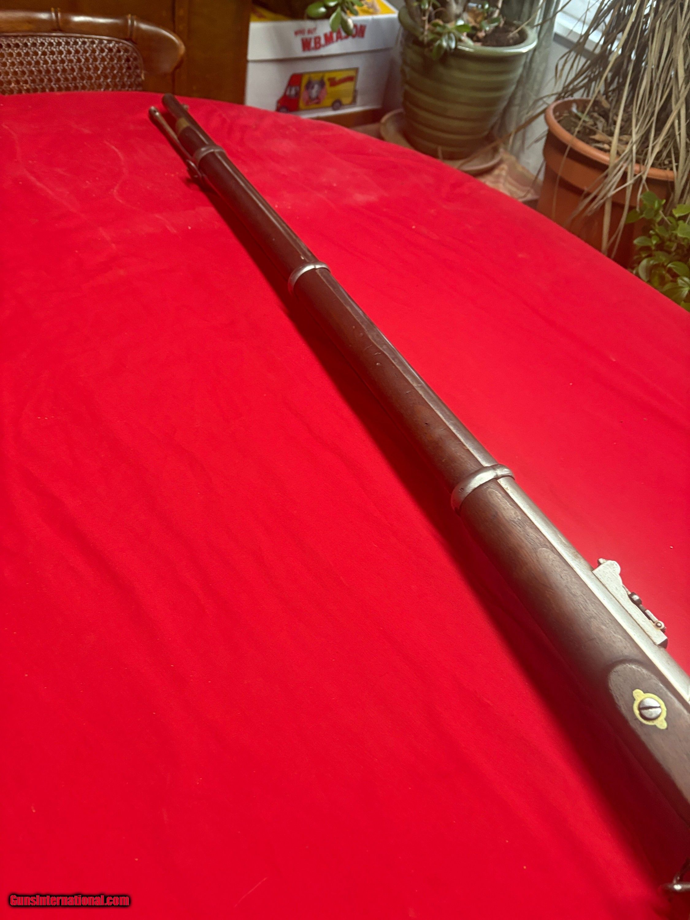 Description: Pattern 1853 Enfield .577 inch Percussion Rifle Musket, Windsor Pattern, 1856 Manufactured under contract to British War Department by Robbins and Lawrence, Windsor, Vermont, USA, 1856. During the Crimean War (1854-1856) there was a shortfall of Enfield rifle muskets. Insufficient numbers were being produced in the United Kingdom. An American contact was swiftly set up in February 1855 for 25,000 US rifle muskets, altered to the Enfield bore, to be made by Robbins and Lawrence of Windsor, Vermont. The American produced Enfields were stamped with 'WINDSOR' on the lock. Unforeseen financial difficulties at the company and complaints in Britain that the American Enfields were of inferior quality resulted in a total of only some 16,000 rifle muskets being produced in the US for the British Army... Later, a quantity of these so called Windsor Enfields were reimported back into the United States and were used by both sides during the Civil War... This one is in fine condition, complete and with all originial parts...39" barrel, with shallow groove rifling...Barrel is burnished bright, which was military custom at the time...Lock plate and barrel proof marks are correct for this piece...Brass butt plate is stamped with British military unit markings...Nice example of a rare rifled musket, made up here for use by the British in The Crimeian War and later brougtht back for our own internal conflict... Antique: Yes Price: $1,795.00 Contact Seller |