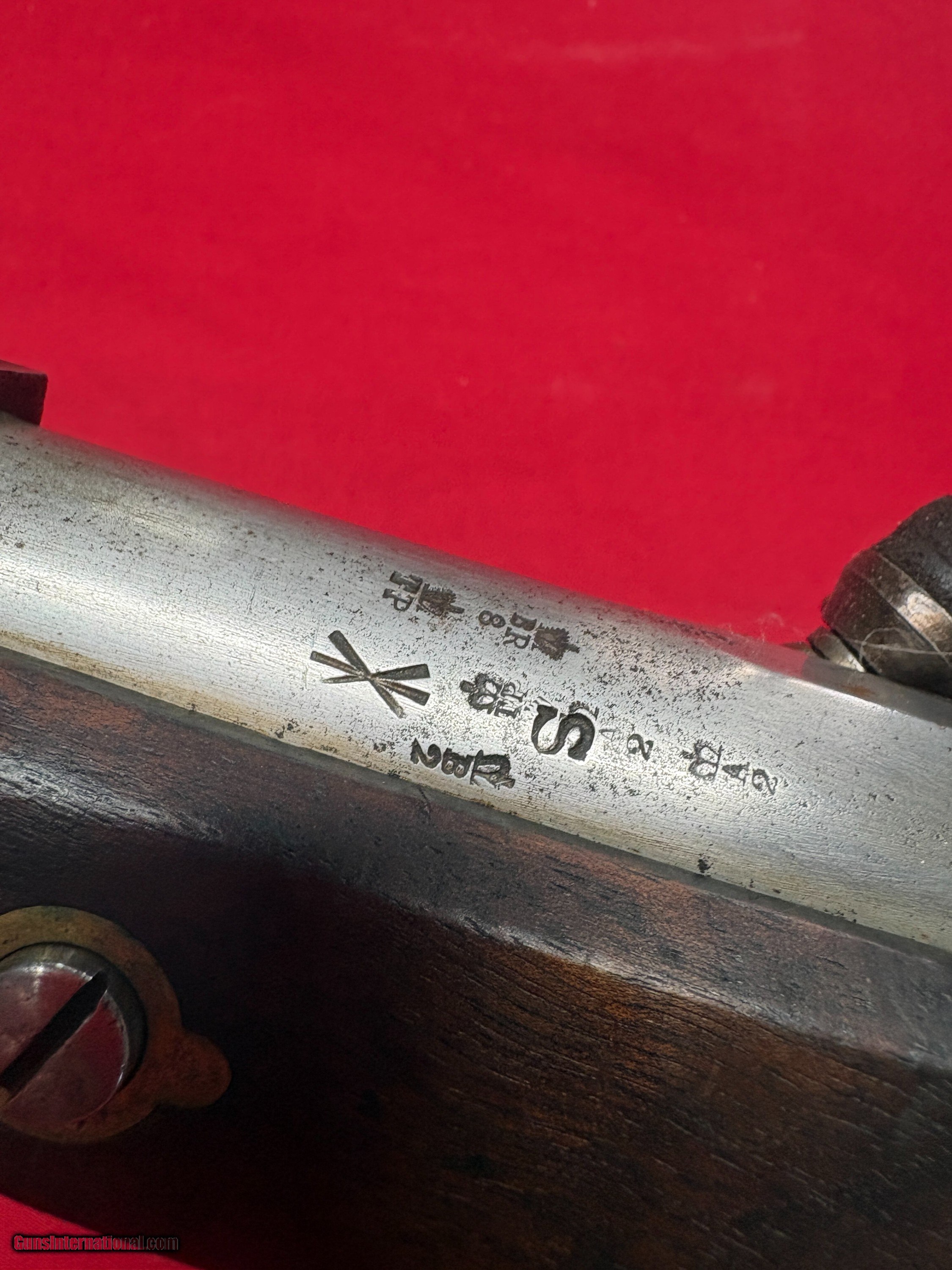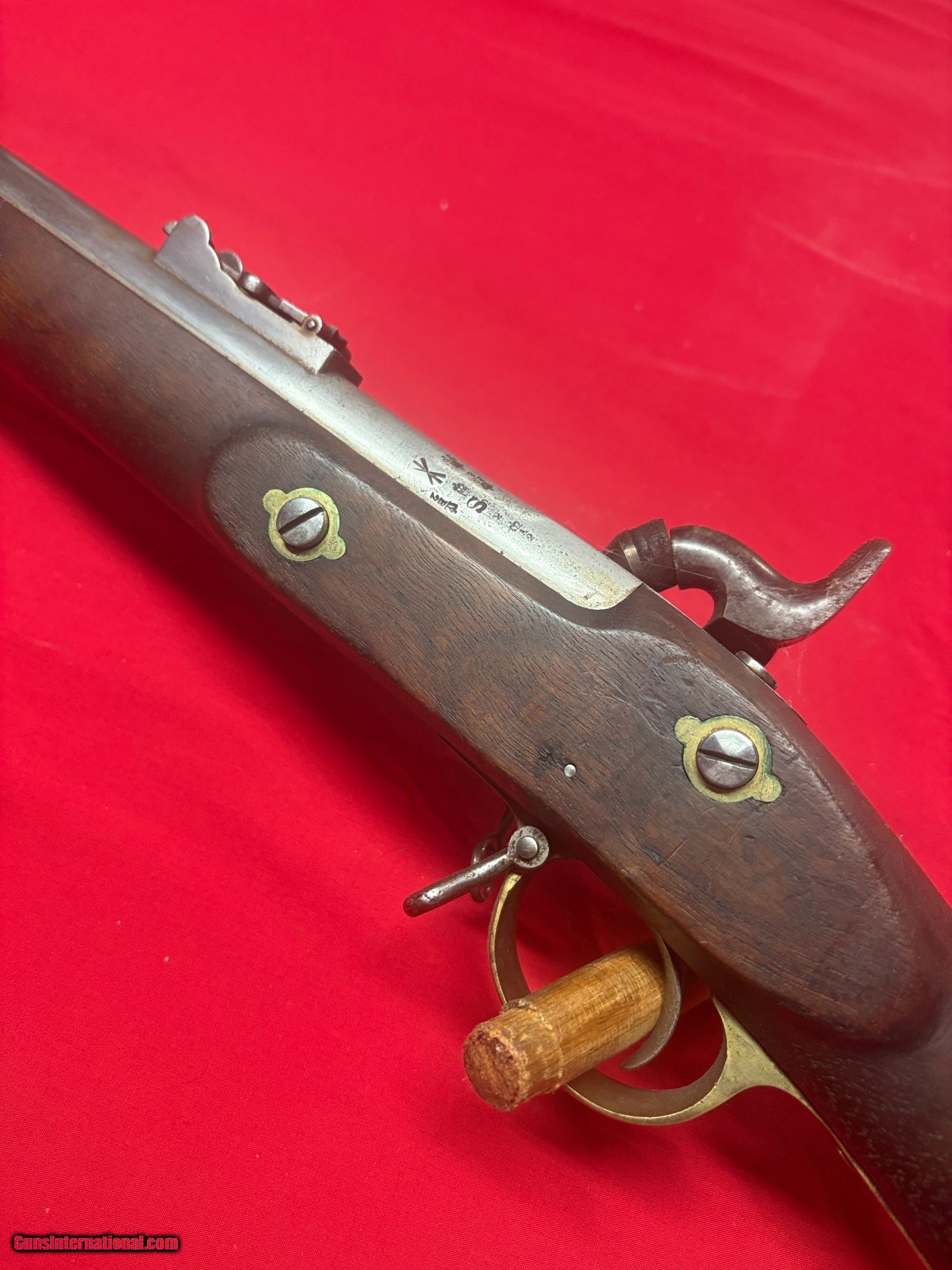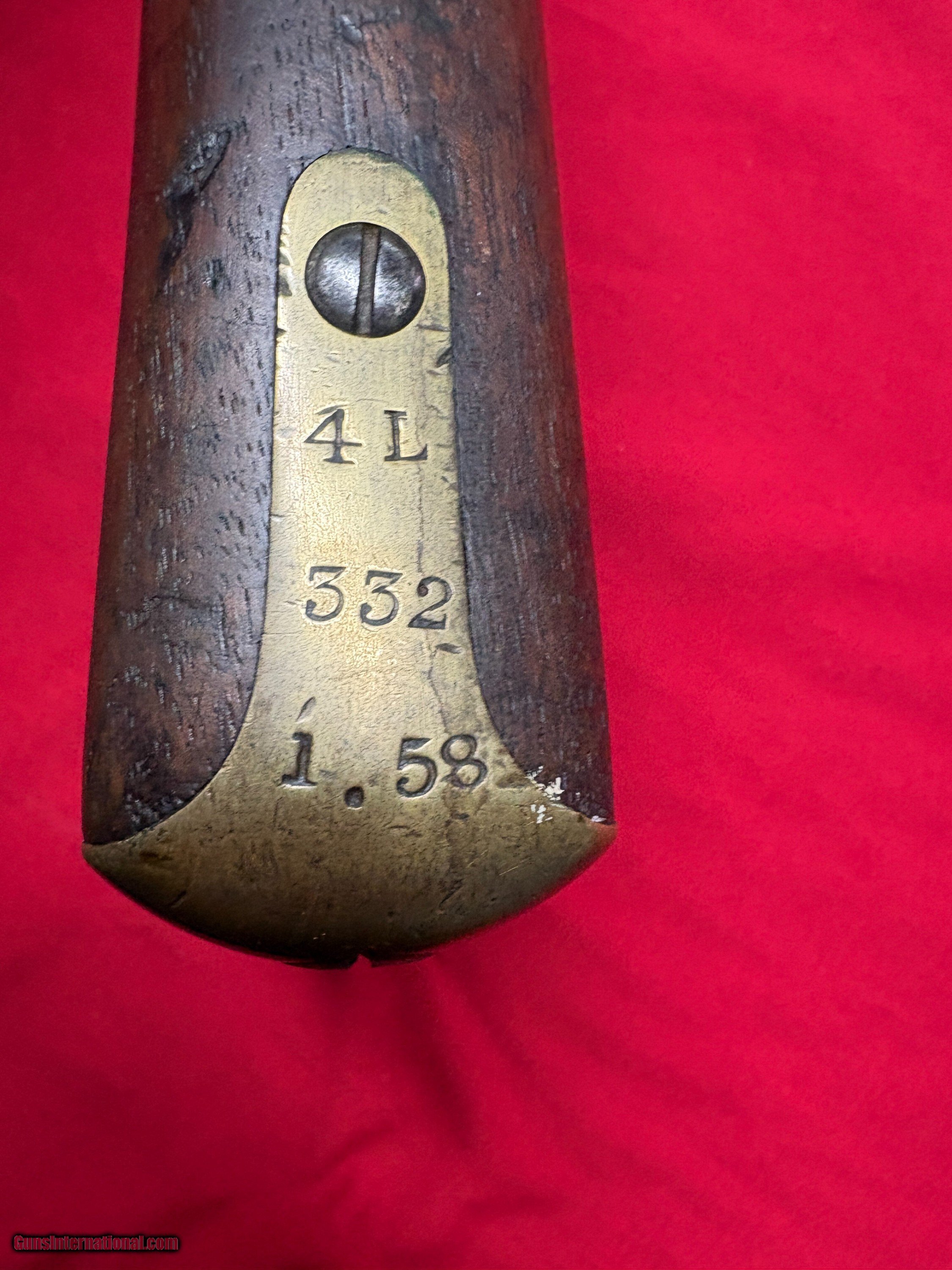 Description: Pattern 1853 Enfield .577 inch Percussion Rifle Musket, Windsor Pattern, 1856 Manufactured under contract to British War Department by Robbins and Lawrence, Windsor, Vermont, USA, 1856. During the Crimean War (1854-1856) there was a shortfall of Enfield rifle muskets. Insufficient numbers were being produced in the United Kingdom. An American contact was swiftly set up in February 1855 for 25,000 US rifle muskets, altered to the Enfield bore, to be made by Robbins and Lawrence of Windsor, Vermont. The American produced Enfields were stamped with 'WINDSOR' on the lock. Unforeseen financial difficulties at the company and complaints in Britain that the American Enfields were of inferior quality resulted in a total of only some 16,000 rifle muskets being produced in the US for the British Army... Later, a quantity of these so called Windsor Enfields were reimported back into the United States and were used by both sides during the Civil War... This one is in fine condition, complete and with all originial parts...39" barrel, with shallow groove rifling...Barrel is burnished bright, which was military custom at the time...Lock plate and barrel proof marks are correct for this piece...Brass butt plate is stamped with British military unit markings...Nice example of a rare rifled musket, made up here for use by the British in The Crimeian War and later brougtht back for our own internal conflict... Antique: Yes Price: $1,795.00 Contact Seller |