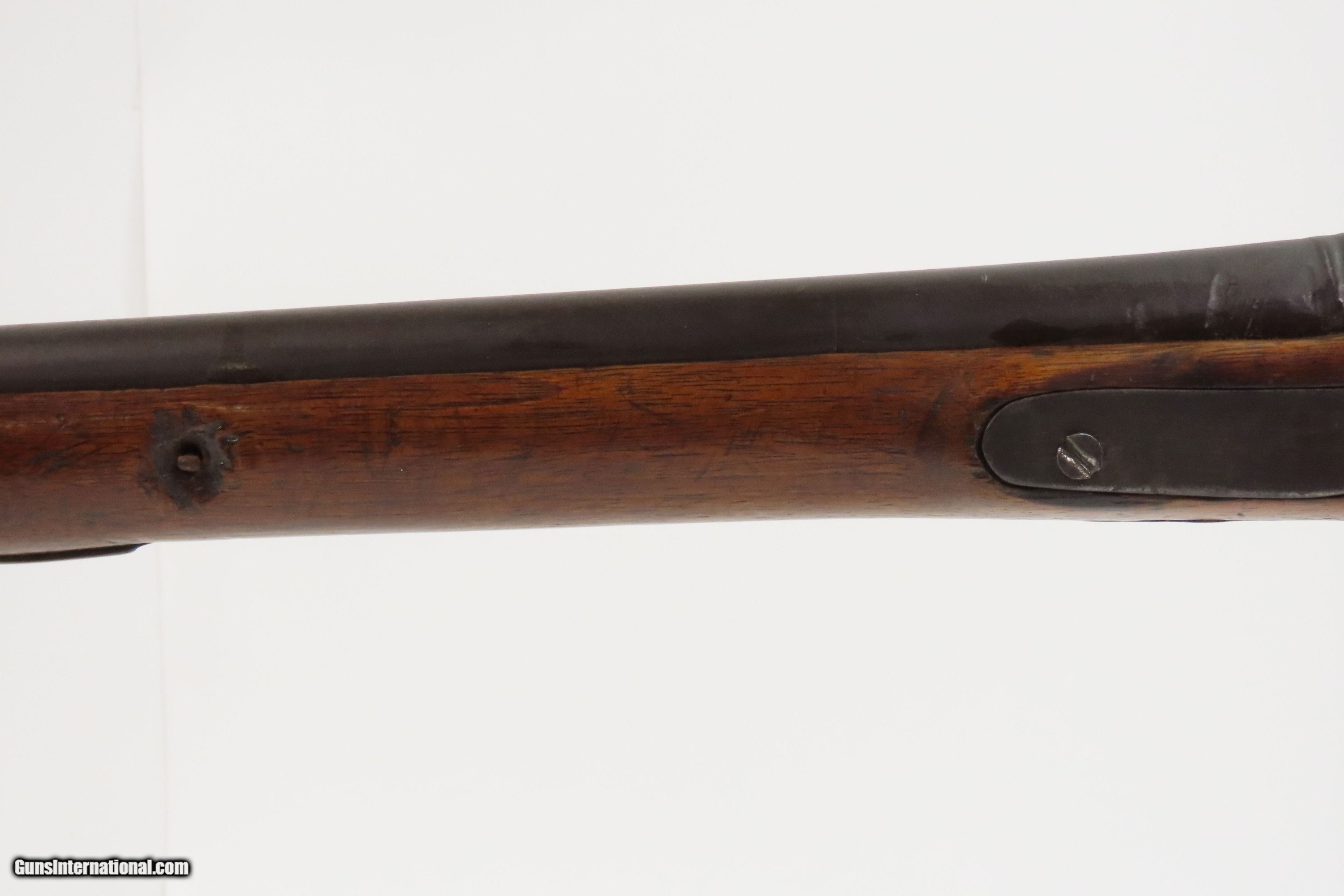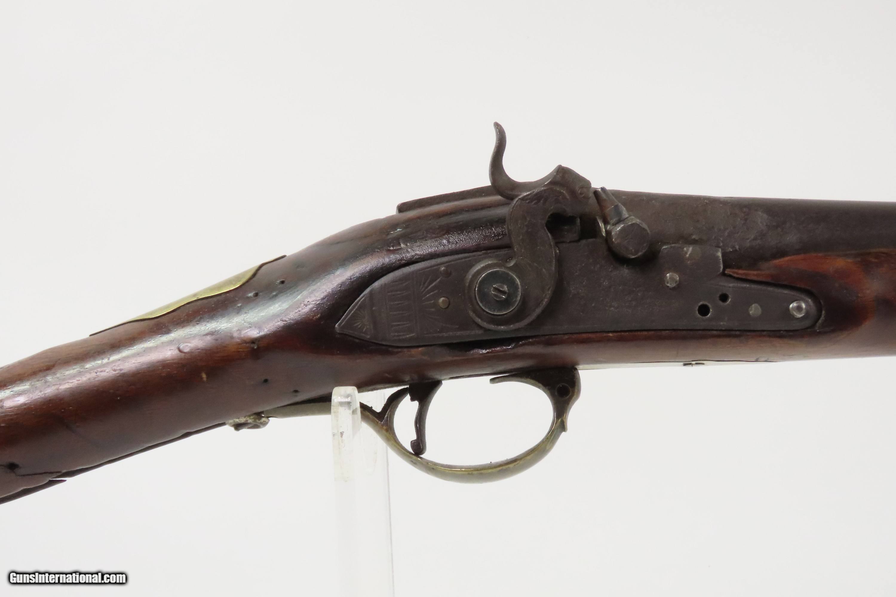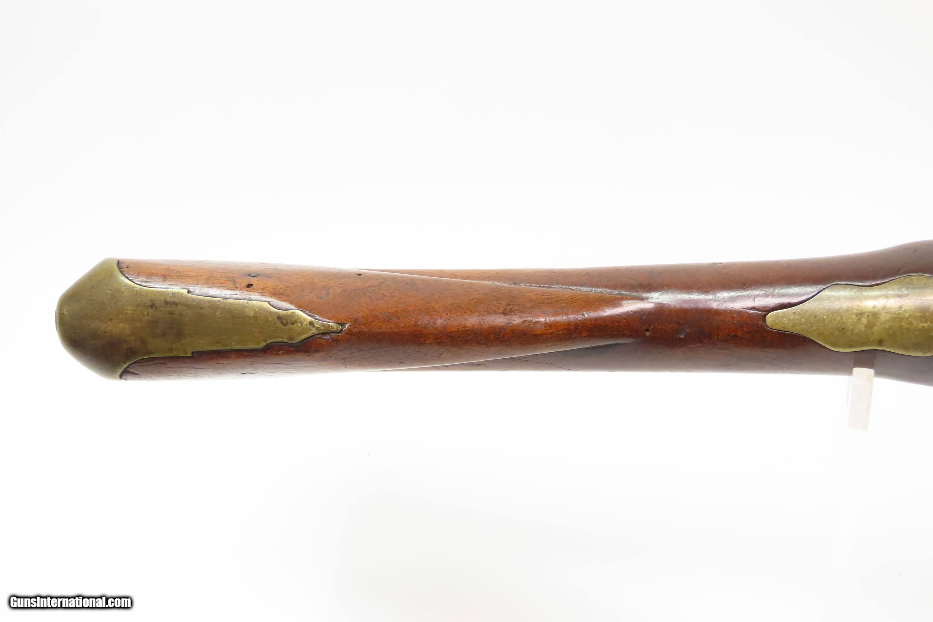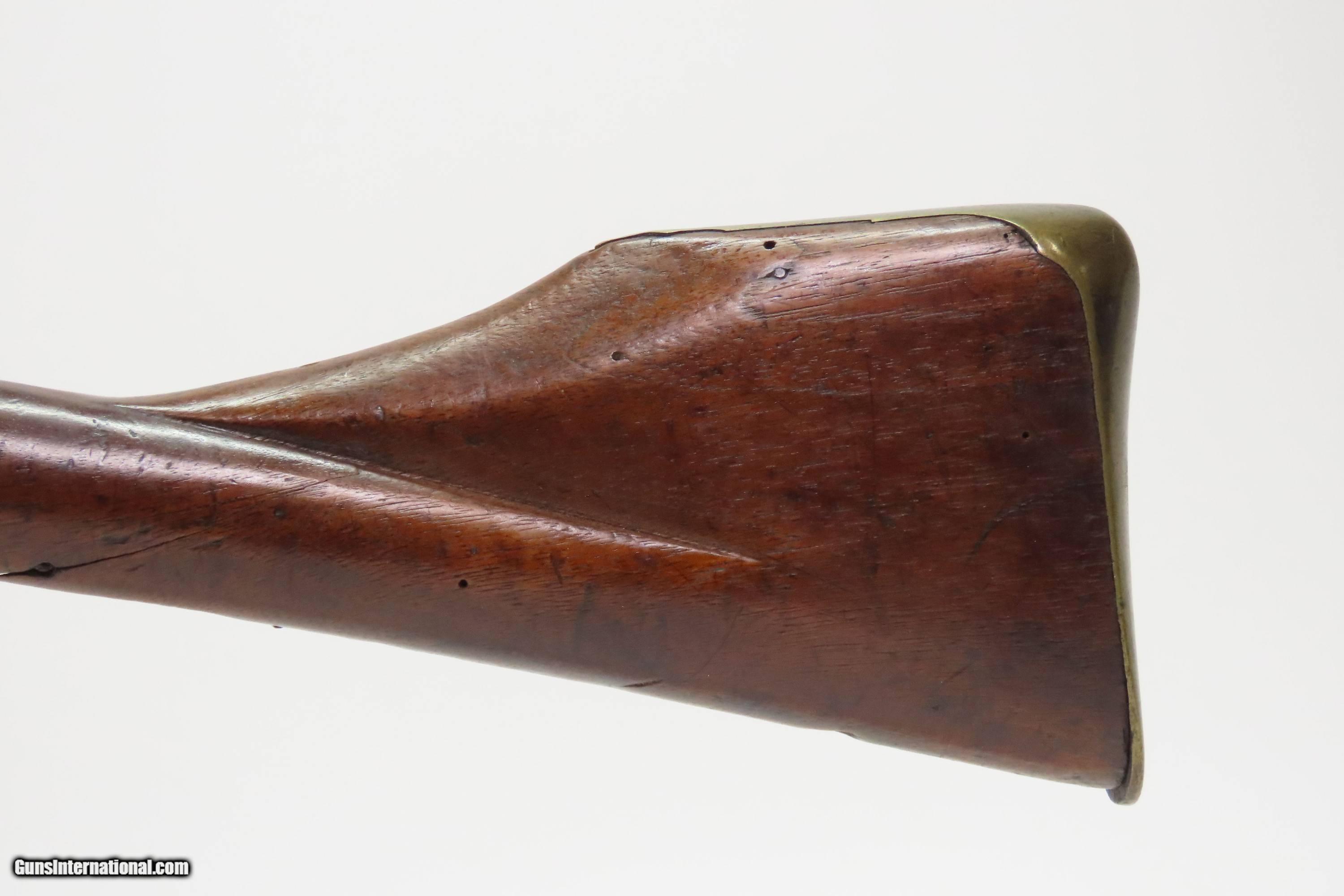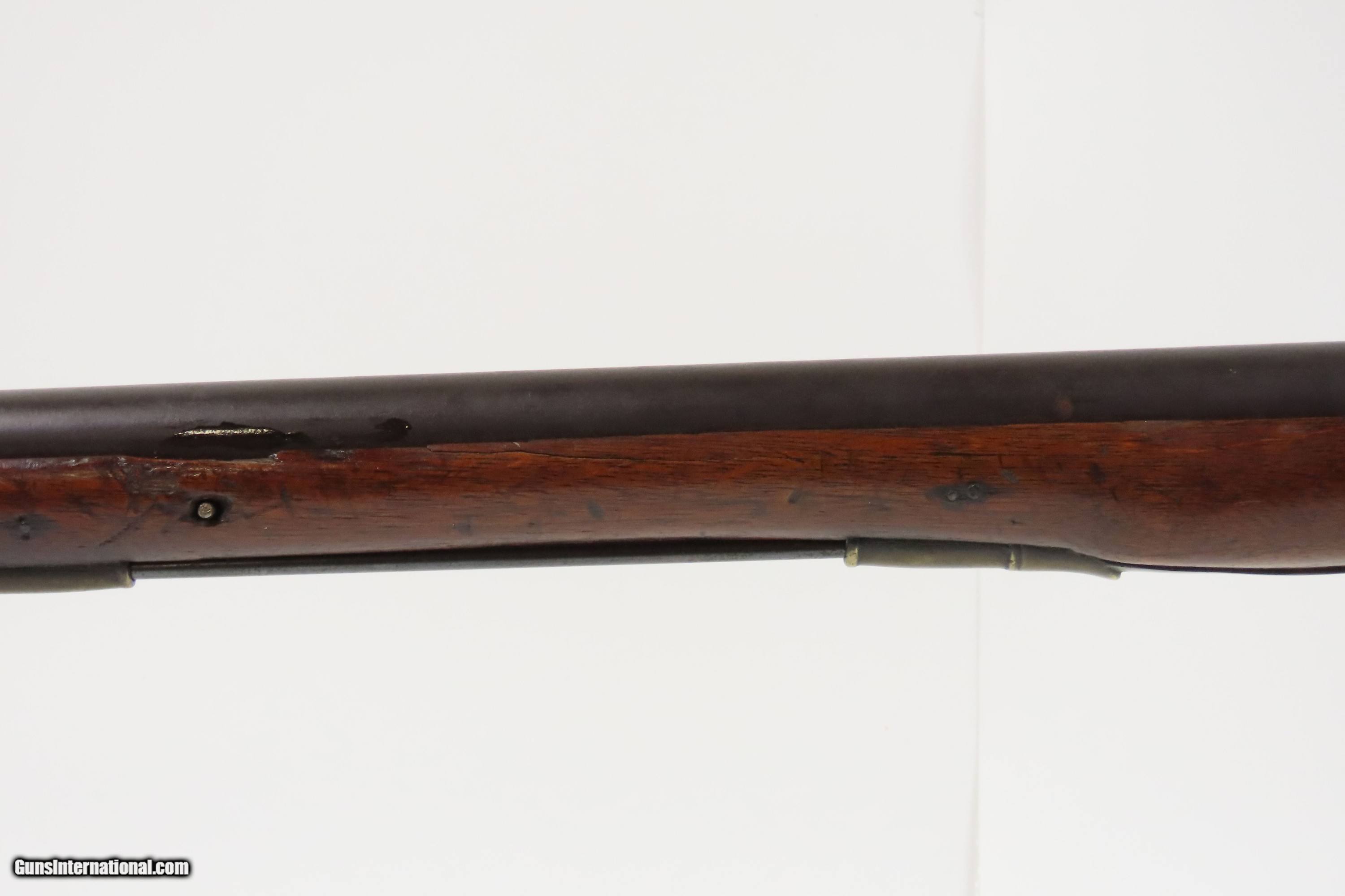 Description: BRITISH Antique India Pattern BROWN BESS .70 Percussion Conversion MUSKET BRITISH MILITARY Pattern Napoleonic Wars Musket Here we present an antique English India Pattern Brown Bess Percussion Conversion Musket made circa 1795 to 1815. This pattern is the same that fought Napoleon Bonaparte in numerous iconic battles, as well as the United States and their American Indian Allies during the War of 1812. This pattern may also correctly be called the “India Pattern” since the Honorable East India Company was the entity responsible for this update to the gun that had been around since 1722. When war with France loomed on the horizon, the British Board of Ordnance diverted these muskets from the EIC contract to supply the war effort. The success of this model can be gauged by the fact that between 1795 and 1815, nearly 3,000,000 guns were produced. Although the Birmingham gun trade was responsible for the majority of the production, the London gun trade played a part, through gun makers such as Ezekial Baker, William Parker, Thomas Reynolds, and Durs Egg. According to the London proof-house records, they and others in London were responsible for producing 845,477 muskets. The overall condition is good. Original brown patina. Good bore for its age. The action does not function as the hammer does not cock and there is no spring tension. The buttstock has been shortened, but overall remains in good shape. A portion of the trigger guard is missing. The barrel retaining screw is missing. Markings are worn. Own the original! This is a legitimate antique and not a reproduction. Barrel is 41-3/8 inches. Caliber: .70 Percussion Overall condition as seen in photos. Very Fast. Very Safe. FREE SHIPPINGWORLDWIDE. Delivered directly to your door by express mail! Guaranteed AUTHENTIC & Includes CERTIFICATE OF AUTHENTICITY. ancestryguns $1200 #250382 SOLD Antique: Yes |