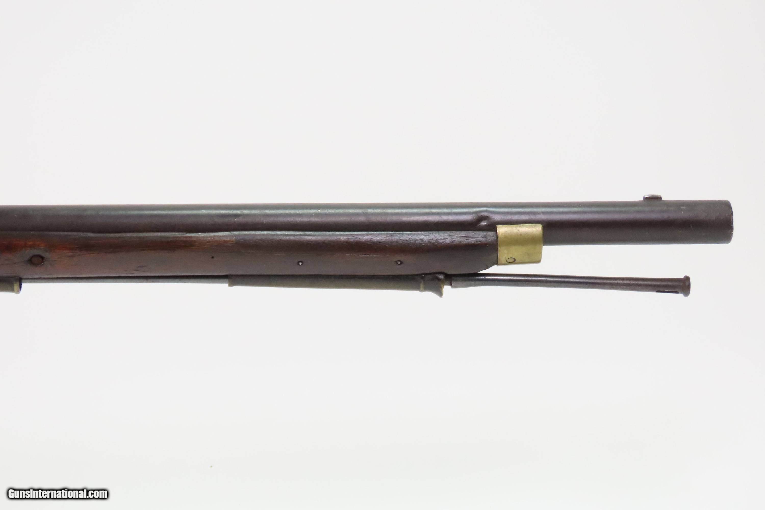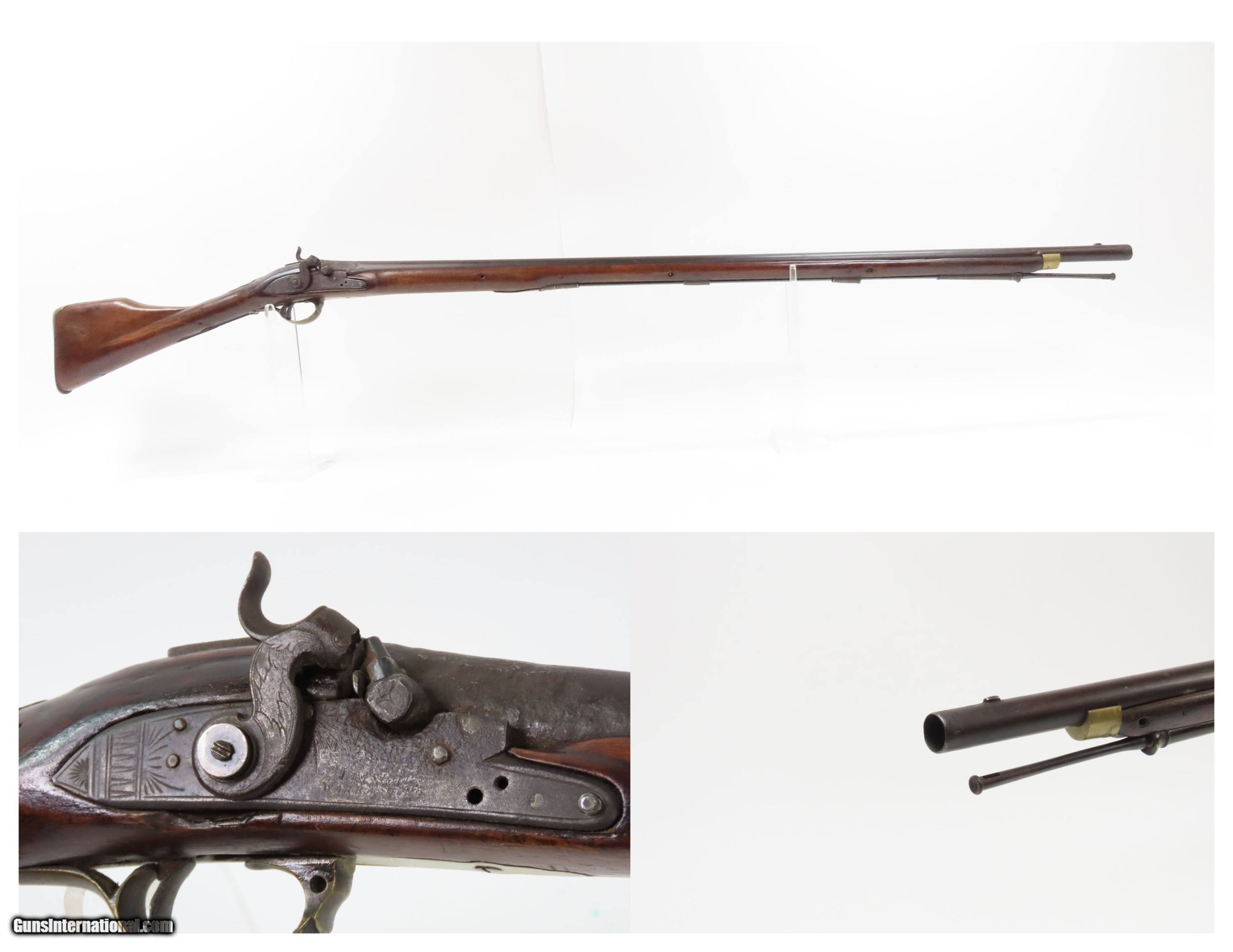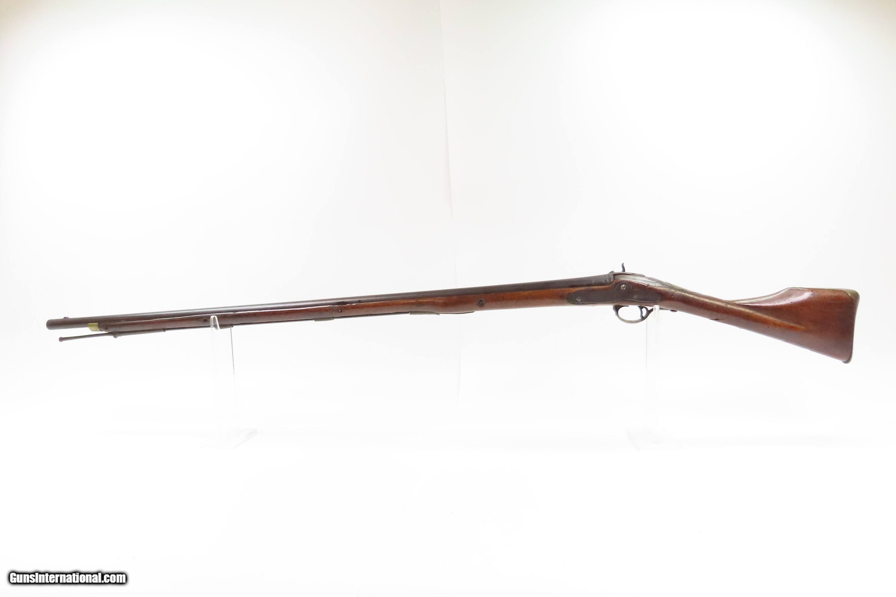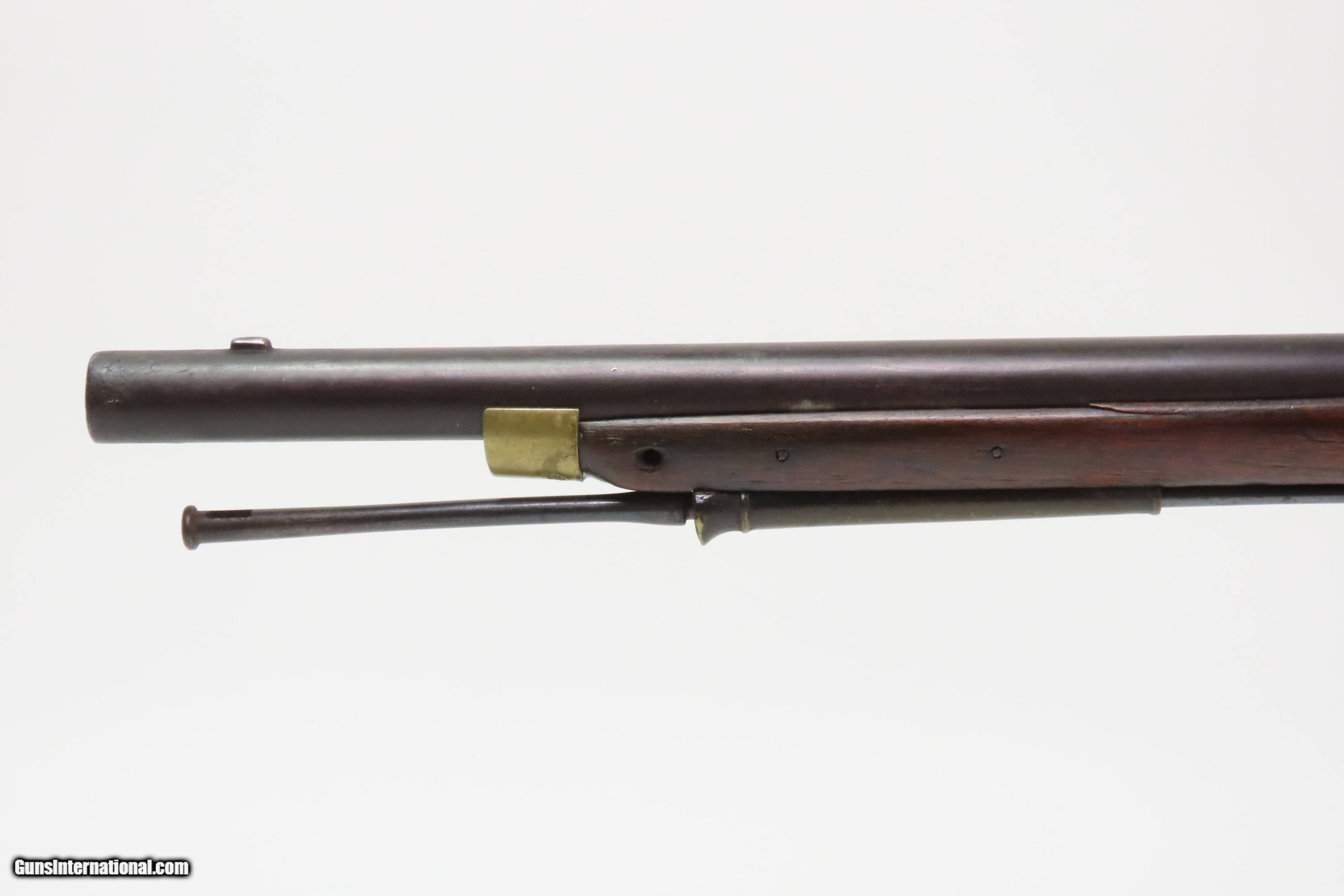 Description: BRITISH Antique India Pattern BROWN BESS .70 Percussion Conversion MUSKET BRITISH MILITARY Pattern Napoleonic Wars Musket Here we present an antique English India Pattern Brown Bess Percussion Conversion Musket made circa 1795 to 1815. This pattern is the same that fought Napoleon Bonaparte in numerous iconic battles, as well as the United States and their American Indian Allies during the War of 1812. This pattern may also correctly be called the “India Pattern” since the Honorable East India Company was the entity responsible for this update to the gun that had been around since 1722. When war with France loomed on the horizon, the British Board of Ordnance diverted these muskets from the EIC contract to supply the war effort. The success of this model can be gauged by the fact that between 1795 and 1815, nearly 3,000,000 guns were produced. Although the Birmingham gun trade was responsible for the majority of the production, the London gun trade played a part, through gun makers such as Ezekial Baker, William Parker, Thomas Reynolds, and Durs Egg. According to the London proof-house records, they and others in London were responsible for producing 845,477 muskets. The overall condition is good. Original brown patina. Good bore for its age. The action does not function as the hammer does not cock and there is no spring tension. The buttstock has been shortened, but overall remains in good shape. A portion of the trigger guard is missing. The barrel retaining screw is missing. Markings are worn. Own the original! This is a legitimate antique and not a reproduction. Barrel is 41-3/8 inches. Caliber: .70 Percussion Overall condition as seen in photos. Very Fast. Very Safe. FREE SHIPPINGWORLDWIDE. Delivered directly to your door by express mail! Guaranteed AUTHENTIC & Includes CERTIFICATE OF AUTHENTICITY. ancestryguns $1200 #250382 SOLD Antique: Yes |