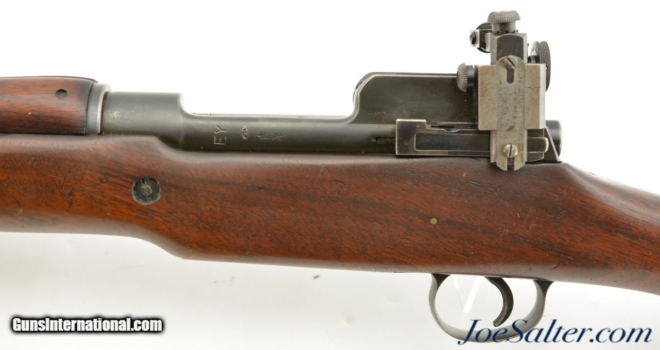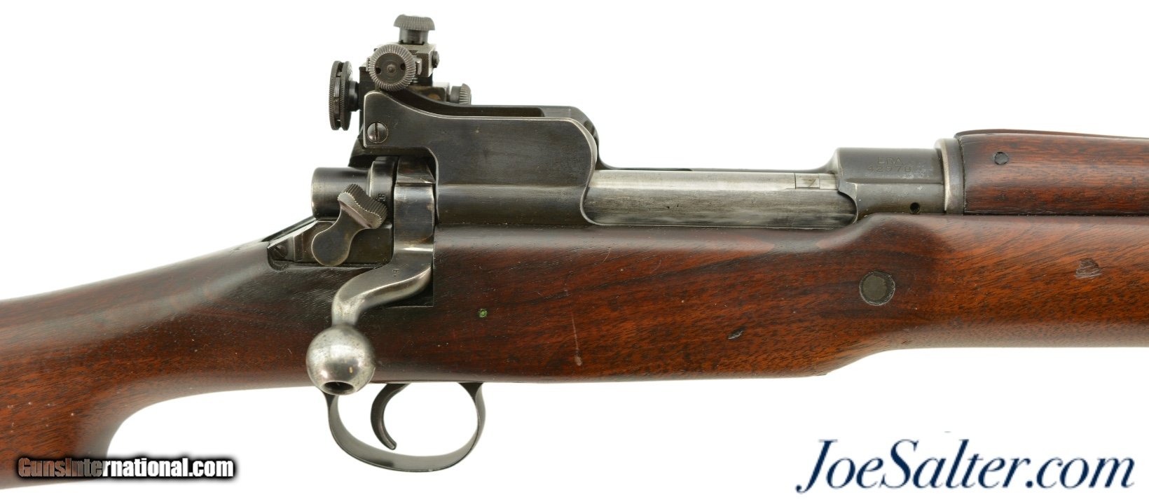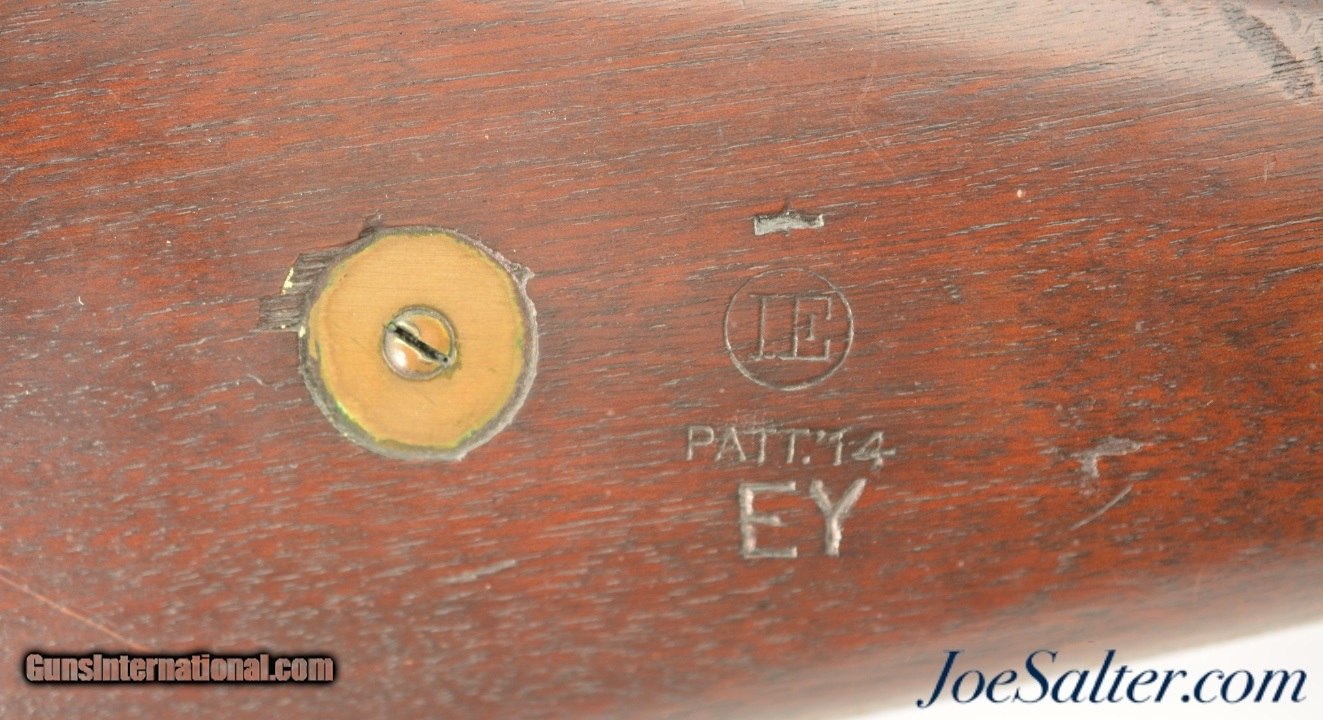 Description: Serial #42978, .303 British, 26" barrel with an excellent, bright bore. This is an "ERA" marked rifle that has the post-1922 modification (removal of the volley sights), and has "EY" (Emergency Use) markings added to the left side of the receiver, right side of the buttstock, and on the barrel breech under the rear handguard. P-14 Mk. I rifles were often marked with the "EY" stamp due to a lack of parts interchangeability between rifles made by different makers (Remington, Winchester, and Eddystone). Matching numbers are present on the receiver, barrel, and bolt with the metal retaining 95-97% of the armory blue finish that has silvering at the muzzle, and on the bolt body and bearing bearing surfaces. The walnut stock and handguards are in fine shape with only some minor handling marks and blemishes scattered about the surface, and the original Eddystone Mk. I markings are still crisp and clear on the right side of the butt: "(defaced Broad Arrow) / IE (in circle) / PATT.’14" The original rear ladder sight was removed and replaced with a period Parker-Hale No. 5B rear sight with adjustable aperture disk. This is a splendid Pattern 1914 Mk. I rifle, with a great period target sight mounted, and is in fine-near excellent condition overall. FFL or C&R SOLD Curio/Relic: Yes |