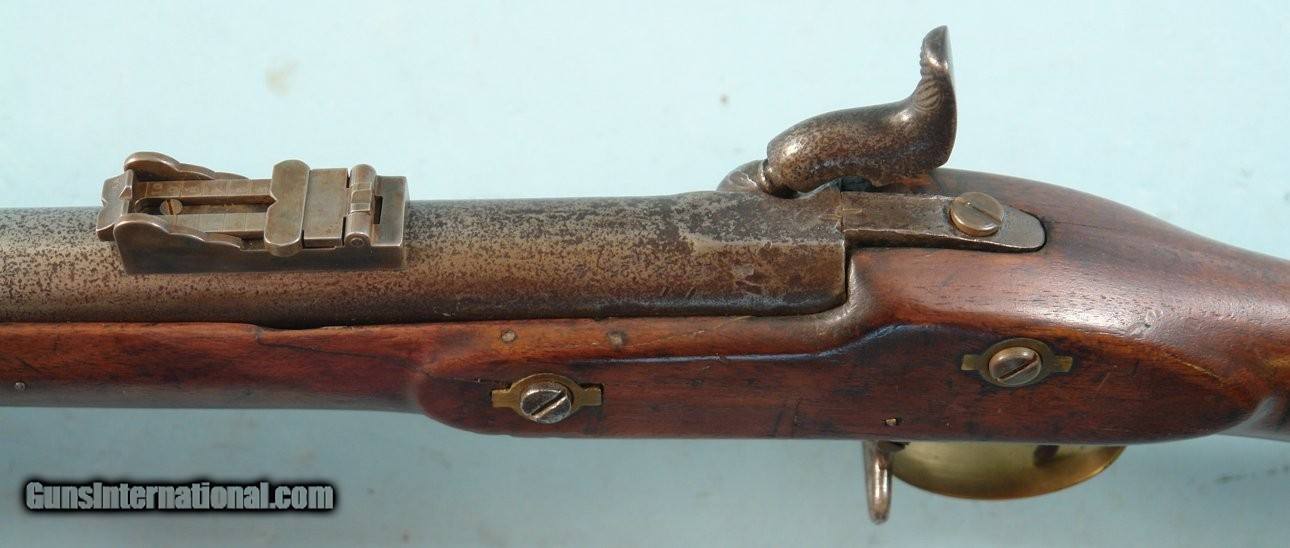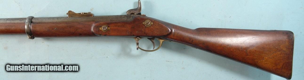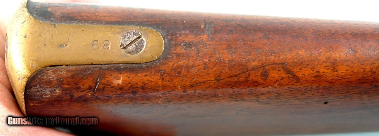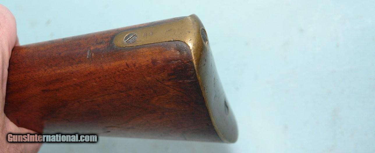 Description: CIVIL WAR BRITISH TOWER ENFIELD PATTERN 1853 .577 CAL. RIFLE MUSKET. All original and complete including ramrod. Lock plate dated 1862 and stamped “TOWER” with the Victoria Crown. Possible Confederate used with number “89” stamped on tang of butt plate. 40” barrel with export proofs at left breech. Original long range rear sight. Very good overall with dark grey original patina. Stock with nice handling wear and small old wood patch on side panel done during the period of use. Working order and very good bore. Nice original example at a reasonable price. SOLD Antique: Yes |