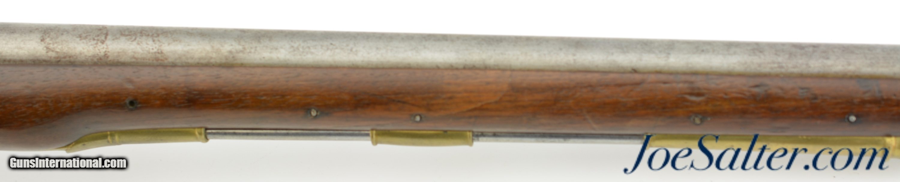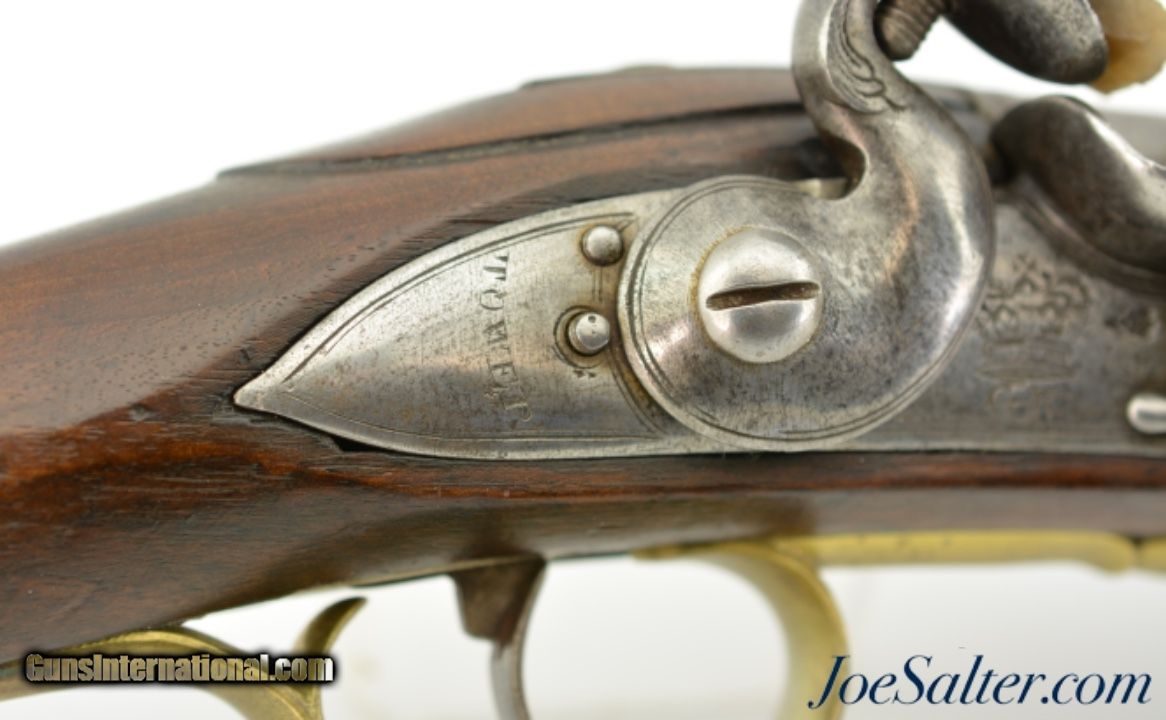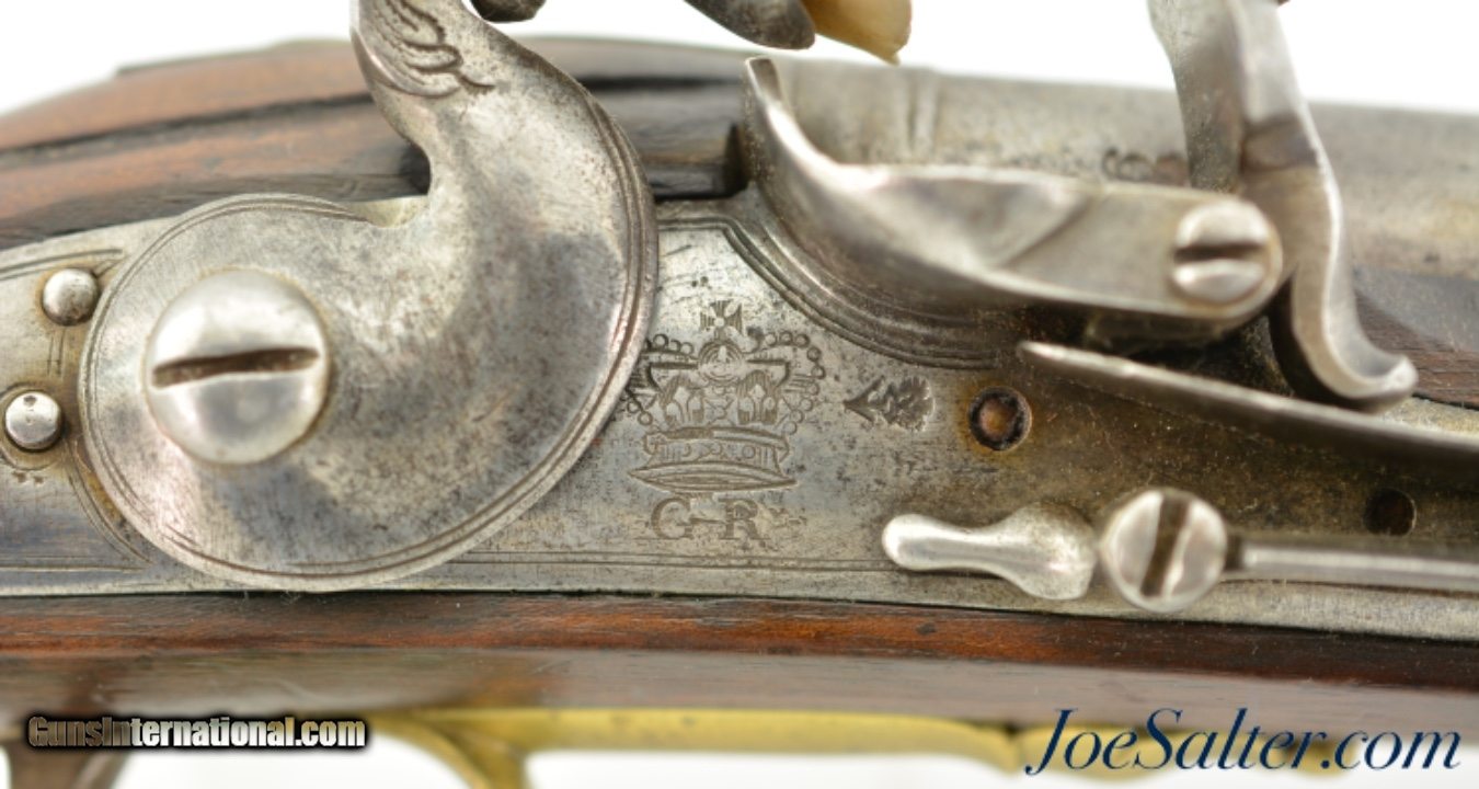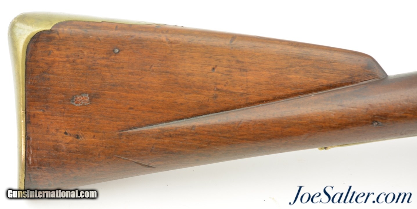 Description: NSN, .68 Caliber, 28" barrel with a very good, lightly pitted bore. This is a rare British carbine, originally born from a design made for the troops of the 15th Light Dragoons under George Augustus Eliott, 1st Baron Heathfield, and later Governor of Gibraltar during the Great Siege of 1779 & 1783. The carbine has a "Crown / GR" lock with "TOWER" at the rear point, as well as British military proofs on the barrel breech. The barrel and lock have an overall mottled pewter gray patina with moderate pitting around the touchhole, as well as on the edges of the pan. The walnut stock is in fine shape with scattered handling marks and minor blemishes throughout the old military oil finish. A small crown proof stamp is present on the right side of the butt, as well as a small rack number stamped into the comb just ahead of the buttplate tang: "41." The carbine has a correct steel ramrod, and the original sling bar and ring are still present. This is a splendid example of a rarely encountered late 18th & early 19th century British carbine, and is in fine-near excellent condition overall. Antique; SOLD Antique: Yes |
