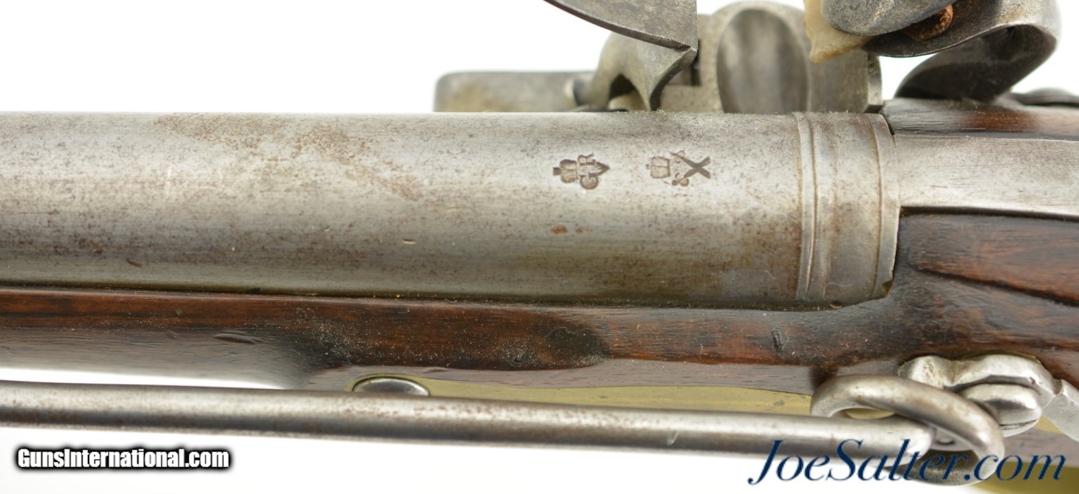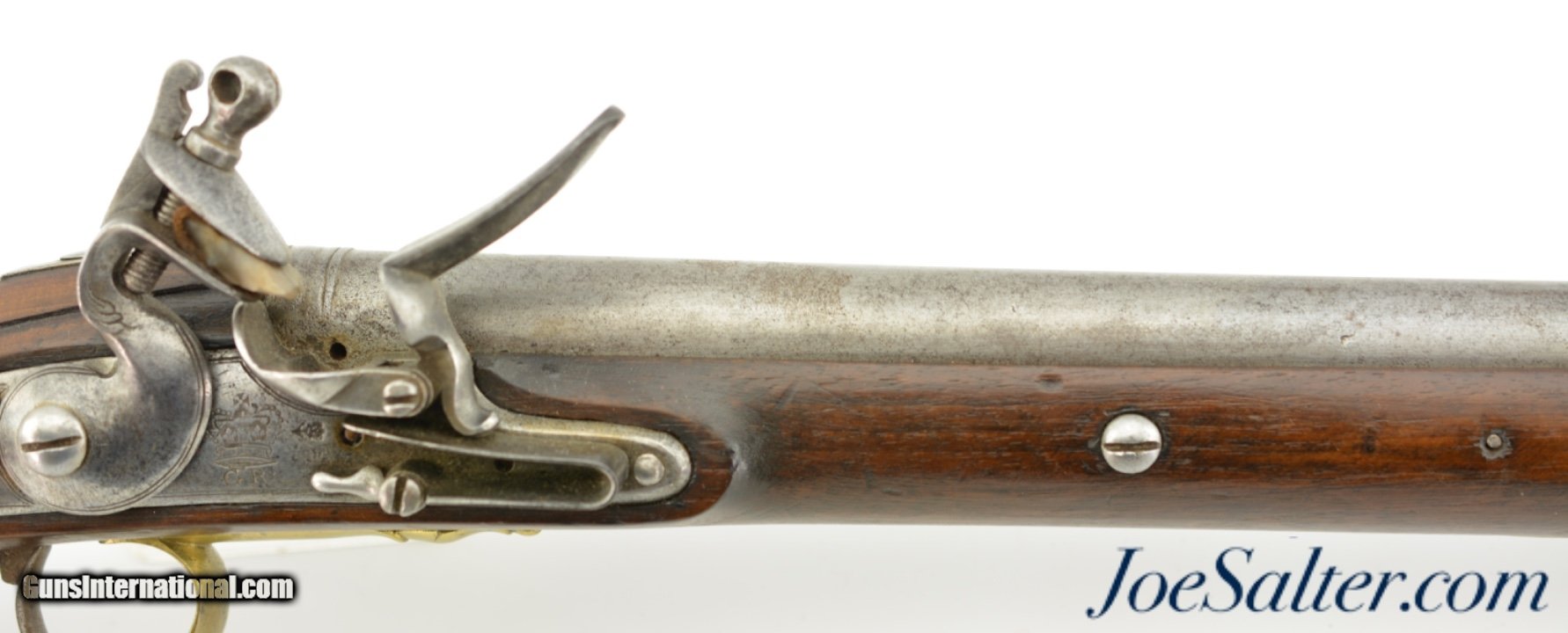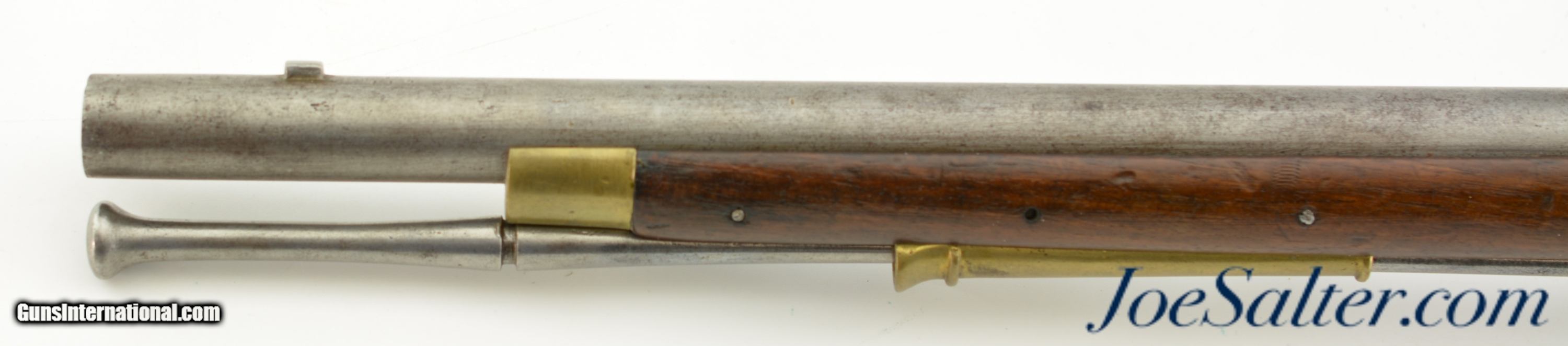 Description: NSN, .68 Caliber, 28" barrel with a very good, lightly pitted bore. This is a rare British carbine, originally born from a design made for the troops of the 15th Light Dragoons under George Augustus Eliott, 1st Baron Heathfield, and later Governor of Gibraltar during the Great Siege of 1779 & 1783. The carbine has a "Crown / GR" lock with "TOWER" at the rear point, as well as British military proofs on the barrel breech. The barrel and lock have an overall mottled pewter gray patina with moderate pitting around the touchhole, as well as on the edges of the pan. The walnut stock is in fine shape with scattered handling marks and minor blemishes throughout the old military oil finish. A small crown proof stamp is present on the right side of the butt, as well as a small rack number stamped into the comb just ahead of the buttplate tang: "41." The carbine has a correct steel ramrod, and the original sling bar and ring are still present. This is a splendid example of a rarely encountered late 18th & early 19th century British carbine, and is in fine-near excellent condition overall. Antique; SOLD Antique: Yes |