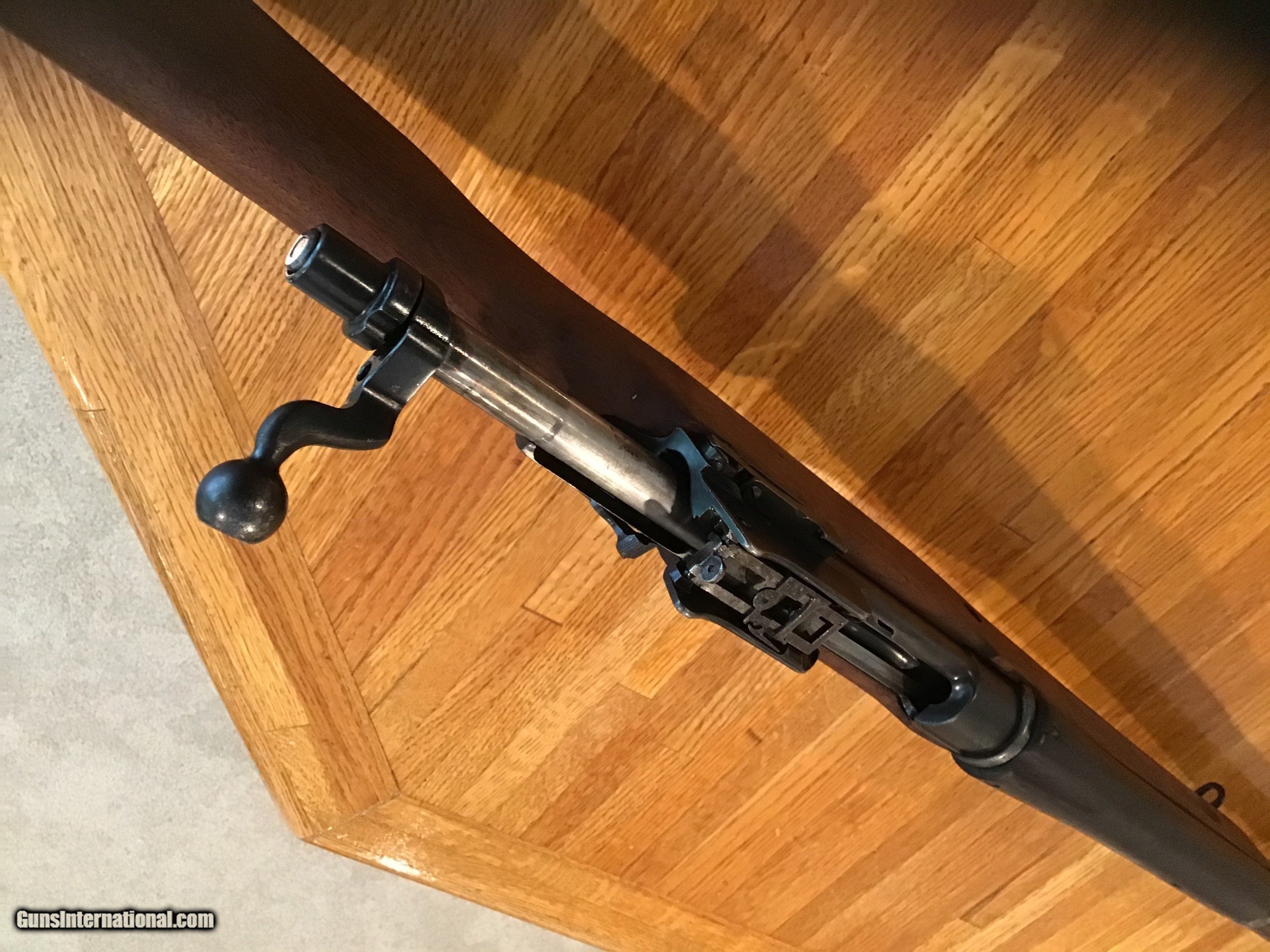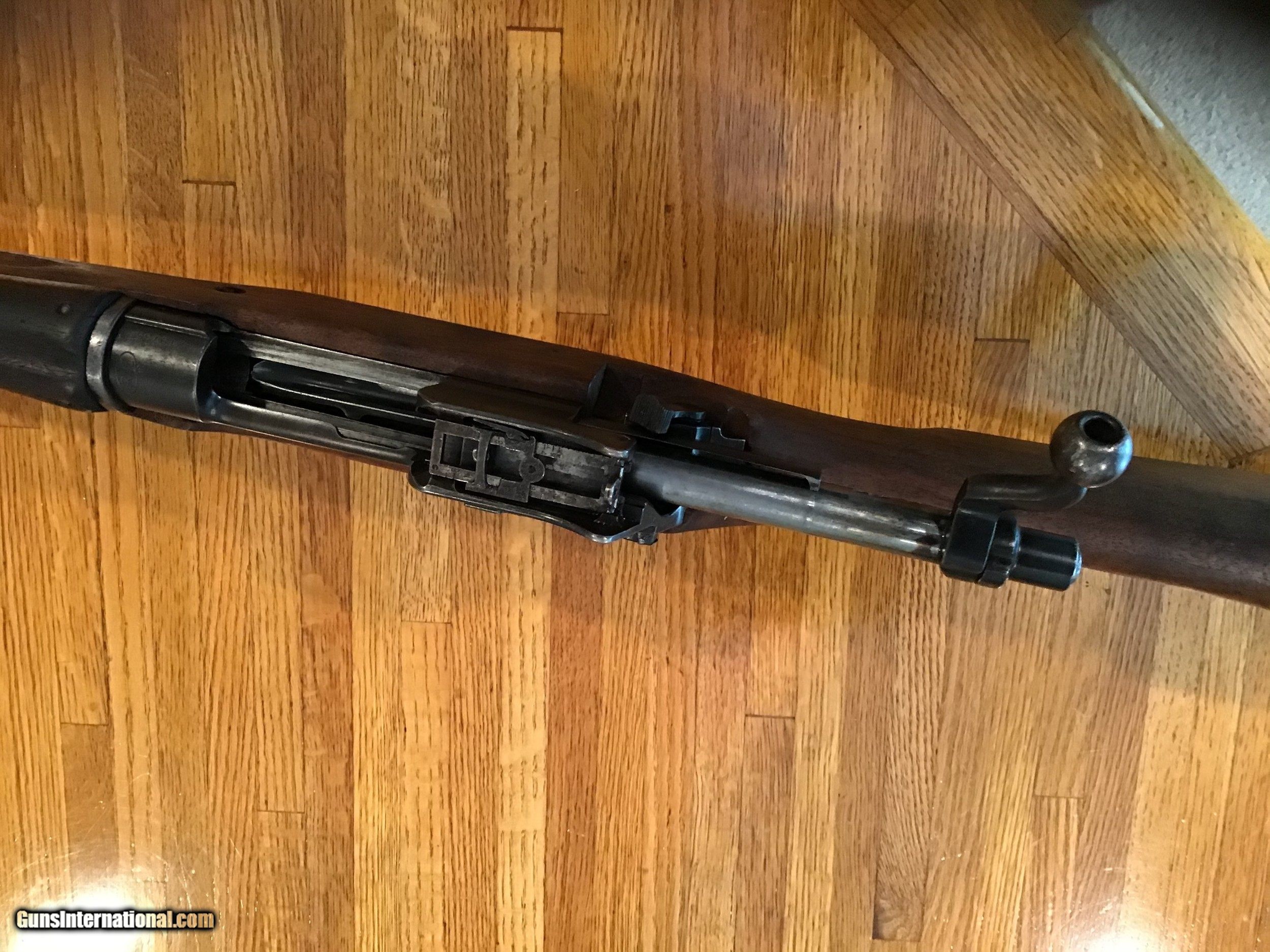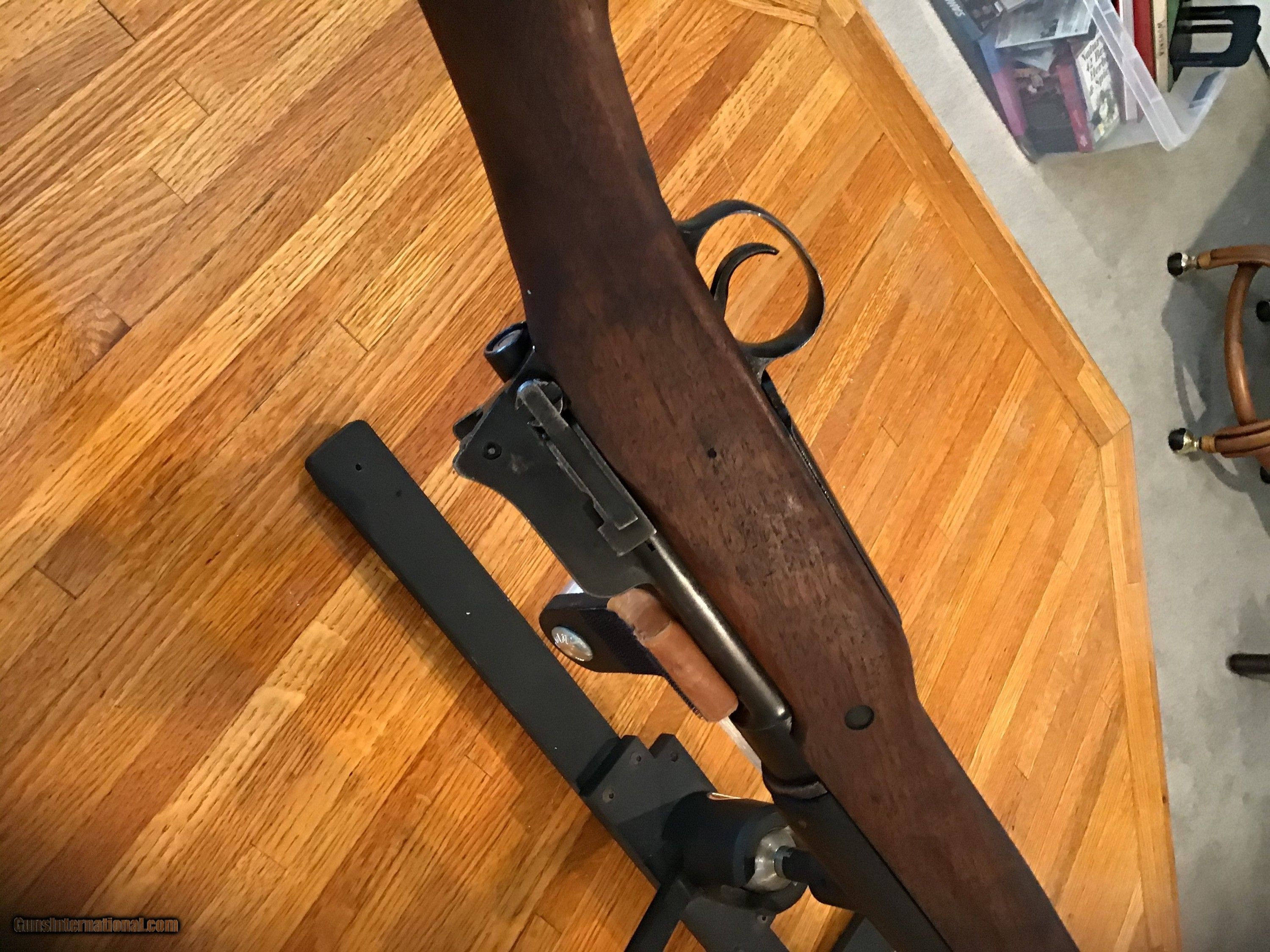 Description: This rifle is a excellent example of a Remington Model P-14 in .303 British. The original blue metal finish remains intact on the receiver and barrel with minor wear. The receiver is stamped RE inside an oval. The bore appears bright with defined rifling. The wood stock is solid without cracks and bruising. The barrel is stamped "P-14 USA behind the front sight. The serial number of this rifle indicates a 1918 build date. SOLD |