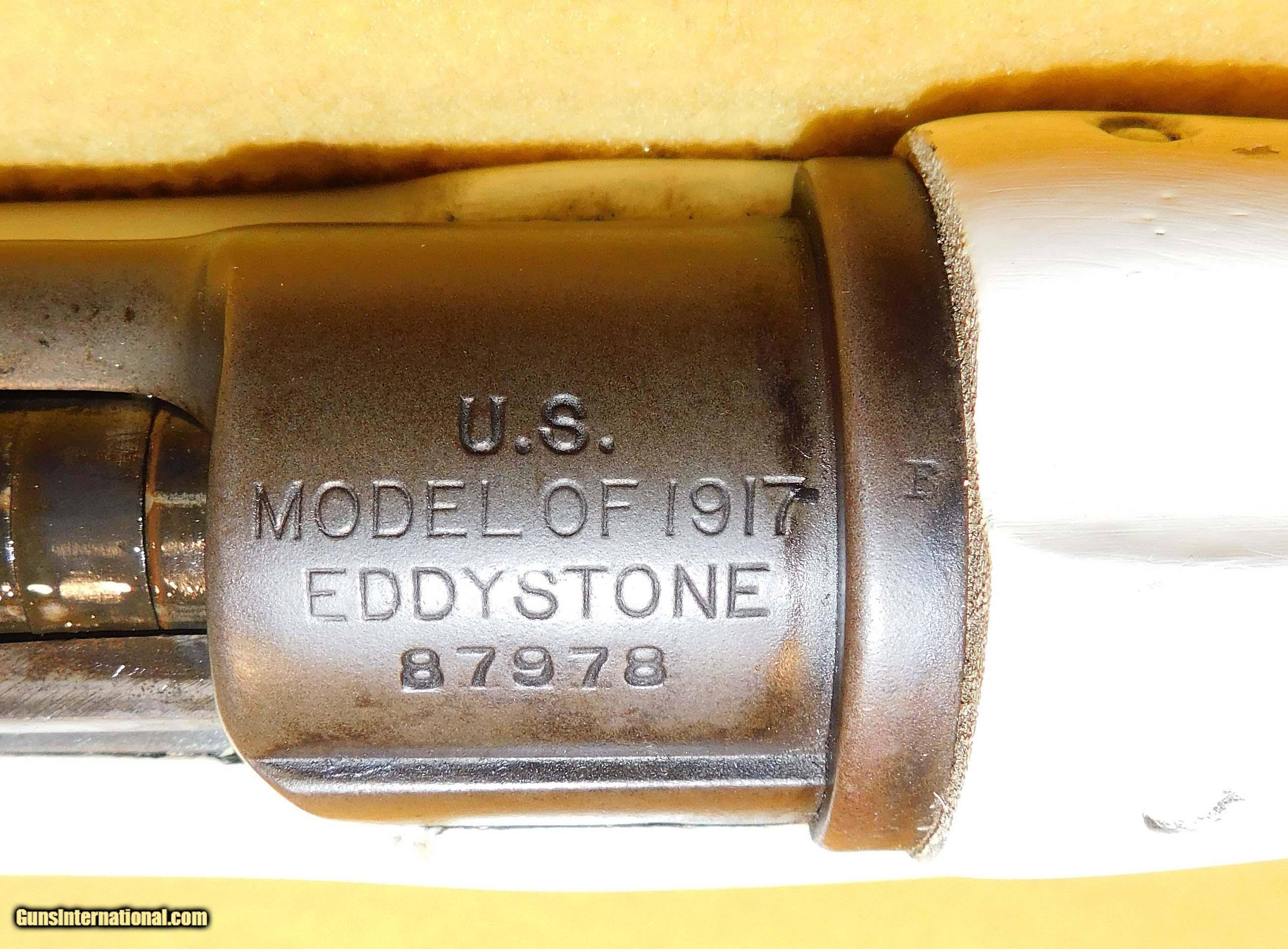 Description: U.S. EDDYSTONE 1917 IN .30/06 CAL., WITH 26" BARREL. COLOR BLUE. CONDITION 85%?. SERIAL NUMBER 87978. U.S. EDDYSTONE MODEL 1917 PARADE GUN IN .30-06 CALIBER, DARK BORE WITH STRONG RIFLING, EDDYSTONE BOLT, REMINGTON DATED (2-18) BARREL, THIS MOST LIKELY WAS A V.F.W. POST FIRE ARM, GOOD SHOOTER, 85%? OVERALL CONDITION. OUR STOCK # D1939 SOLD |