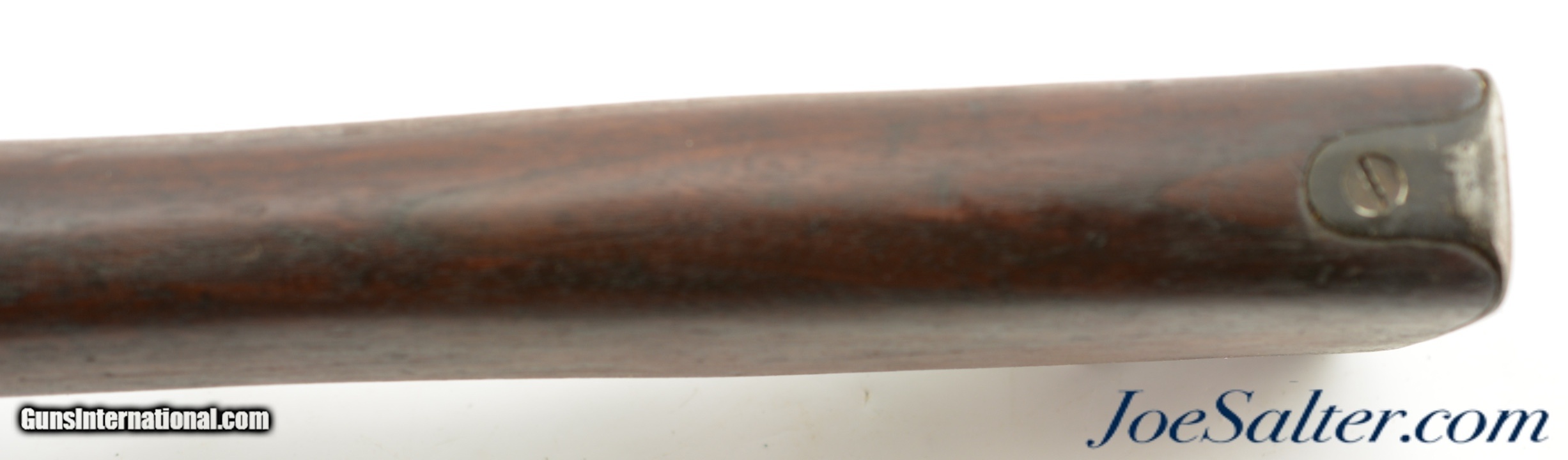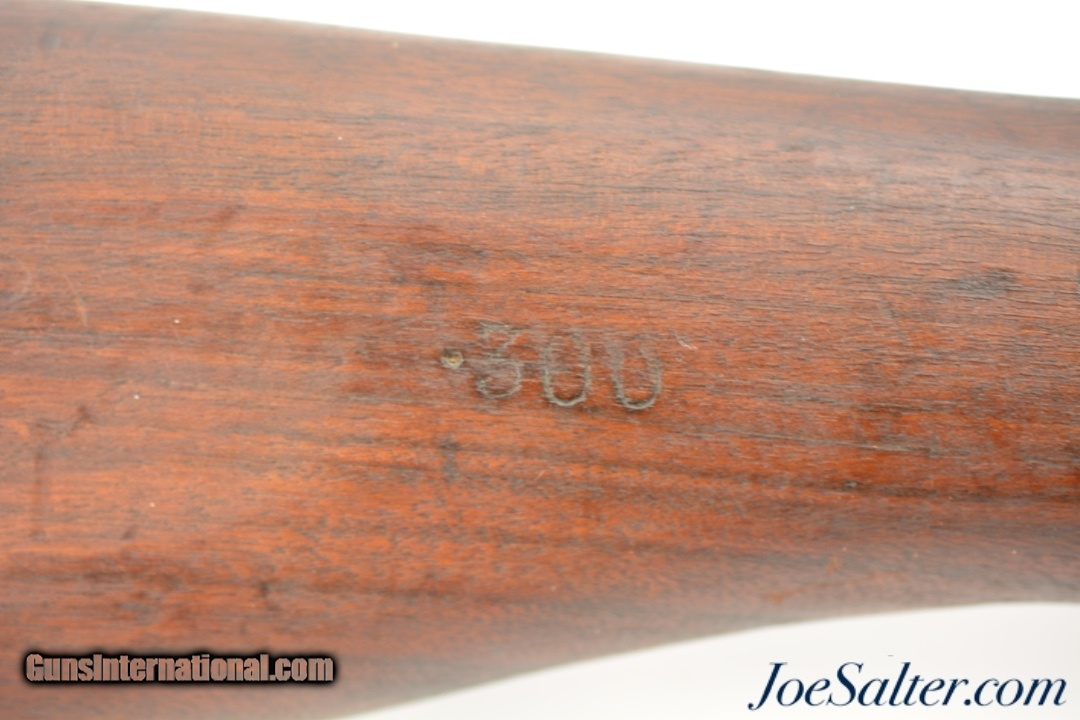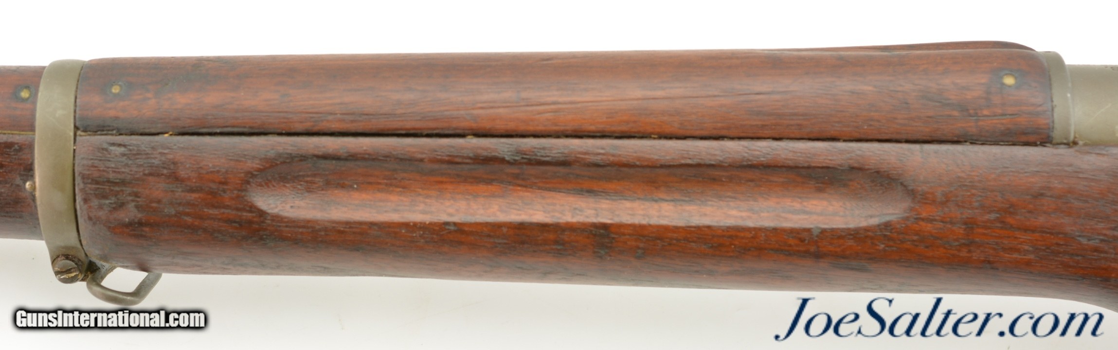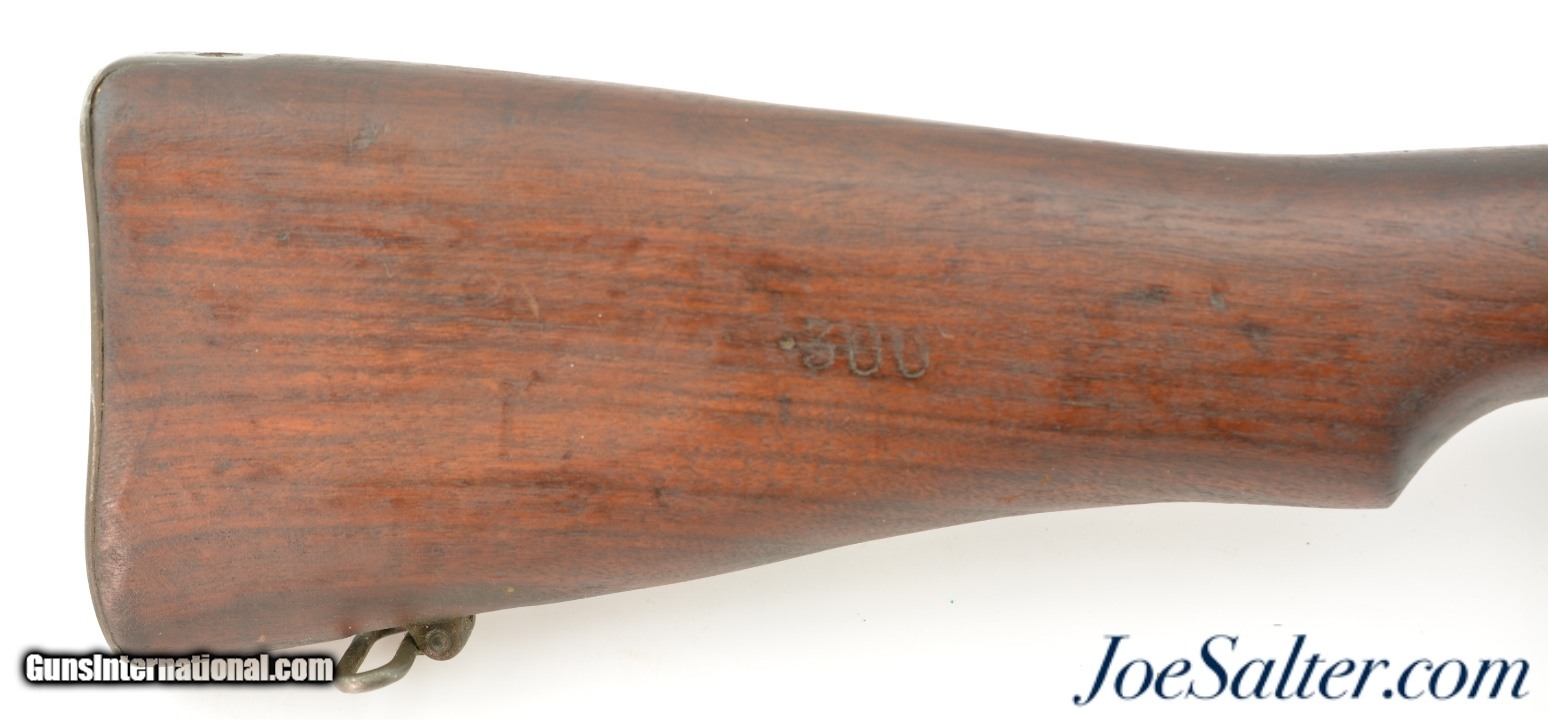 Description: Serial #230683, .30-06, 26" barrel with a very good, bright bore that has some dark freckling within the grooves. This is a handsome rifle that has a 12-17 dated, "E" marked barrel and mostly "E" marked parts, although the rear sight slider is marked "W" on the back. The metal has retained 92-95% of the armory-applied parkerized finish, with silvering at the muzzle, and gray fading along the raised edges and contact points. The bolt has a commensurate amount of a darker, period correct Du-Lite blue finish remaining. The markings are still fairly crisp and clear, and the "E" marked stock and handguard are in fine condition, with minor handling marks and blemishes scattered about the added varnish finish. This rifle may have been a lend lease. While the rifle has no visible British commercial proofs, nor any remnants of red or white painted striping, the right side of the butt has a large British-style ".300" caliber stamp. This is a nice example of a Model 1917 Enfield, and is in very good condition overall. FFL or C&R; SOLD Curio/Relic: Yes |