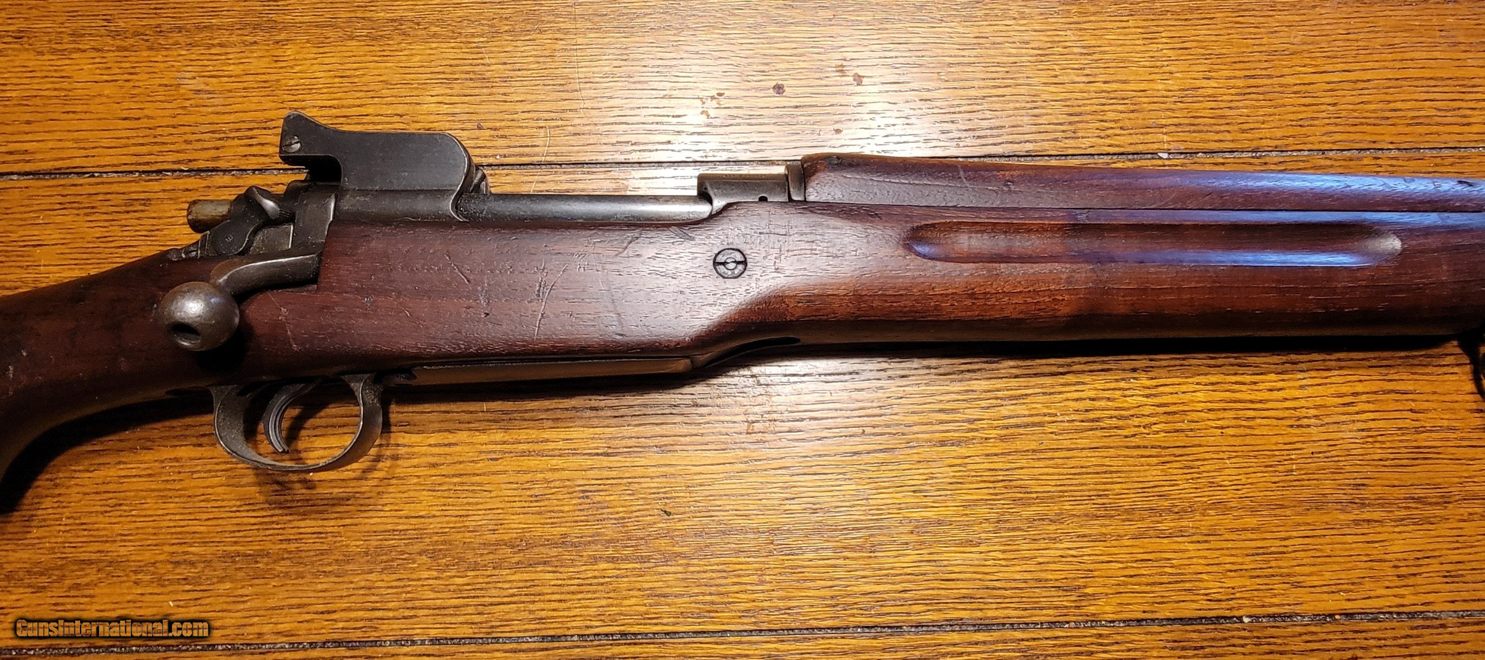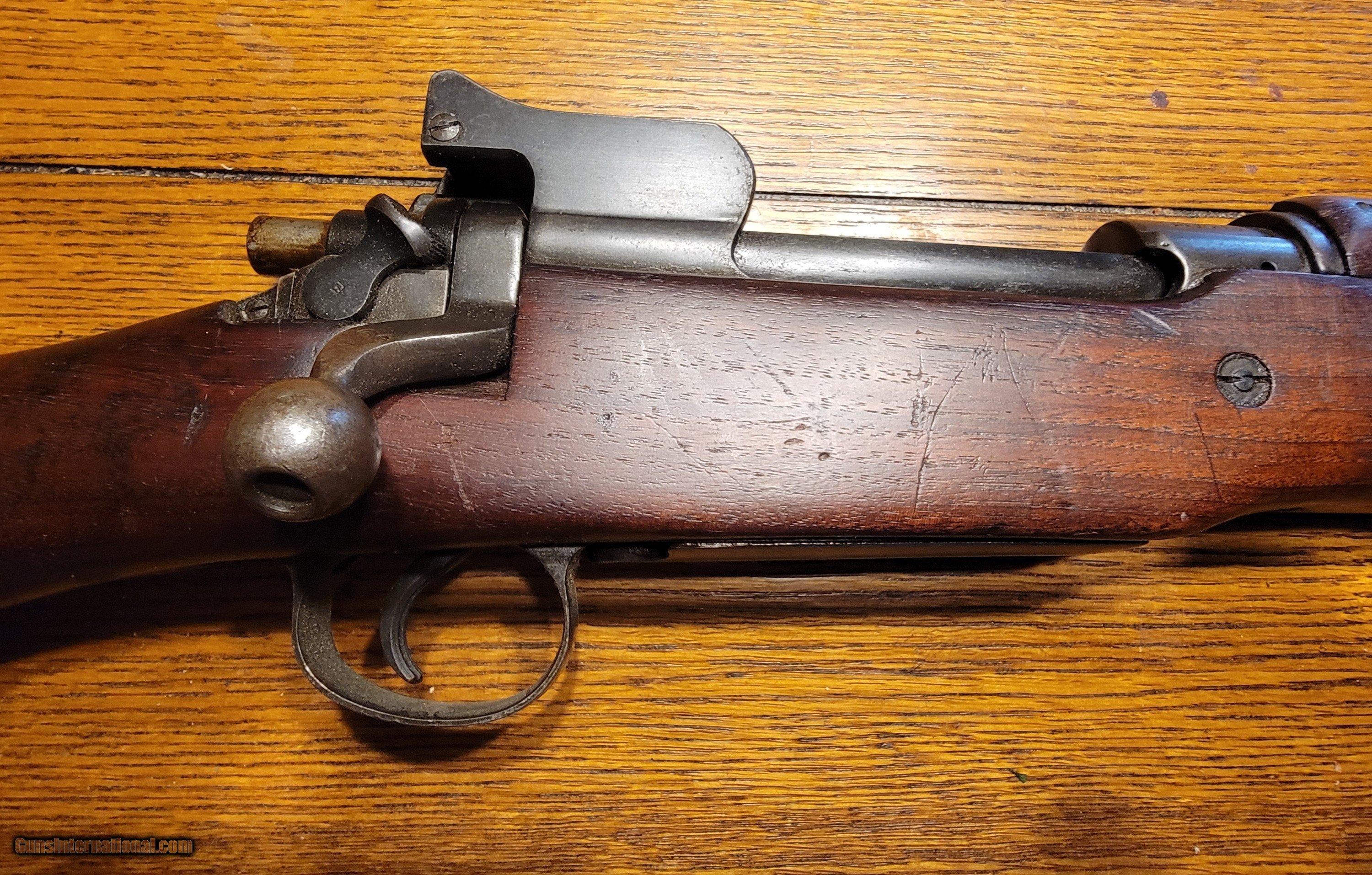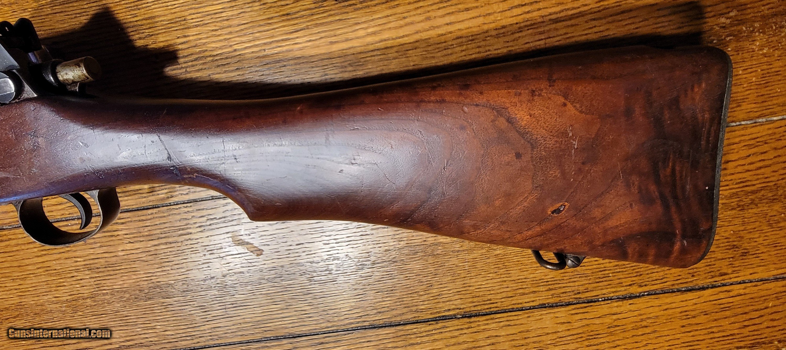 Description: SOLD This is a nice example of a US WWI Battle Rifle. According to historical records, Sgt. Alvin York used a 1917 Enfield, but not this one! I purchased this rifle in 1974. I shot it shortly after the purchase and found it very accurate. I cleaned it; it has been in my gun room for 50 years. The rifle is in the original issue configuration with no known alterations. The barrel is dated Flaming Bomb1-18. The walnut stock is very nice and has a great grain pattern. Retains 90-95%+ original blued finish, and all metal is in good condition, with no pitting or corrosion. Mechanically, it is perfect. The bore is good with distinct rifling. The stock is marked E for Eddystone, and the rifle has multiple eagle head inspector marks from Eddystone assembly. I would consider a full or partial trade for a Colt or S&W 1917 ACP revolver, Early Colt New Service .4 Colt, Enfield or Webley WWII revolvers, Remington 51 7.65, German-manufactured Walther PP or PPK 7.65, Colt 1903 7.65, WWII Walther P38 or other interesting historical pieces in comparable condition. SOLD Curio/Relic: Yes Rifle Caliber: .30-06 Springfield Manufacturer: US GOVERNMENT EDYSTONE Model: US MODEL1917 Serial Number: 30756X Condition: Very Good -Excellent Metal Condition: Very Good-Excellent Wood Condition: Very-Good-Excellent Bore Condition: Clean Sharp Rifling Action: Bolt Action Triggers: Grooved Stock: Walnut Semi pistol grip Butt Pad: Metal LOP: 13 Finish: Bluing 90-95%+ Weight: 9.2 lbs Sights: Rear aperture/ladder Manufacture Date: 1918 |