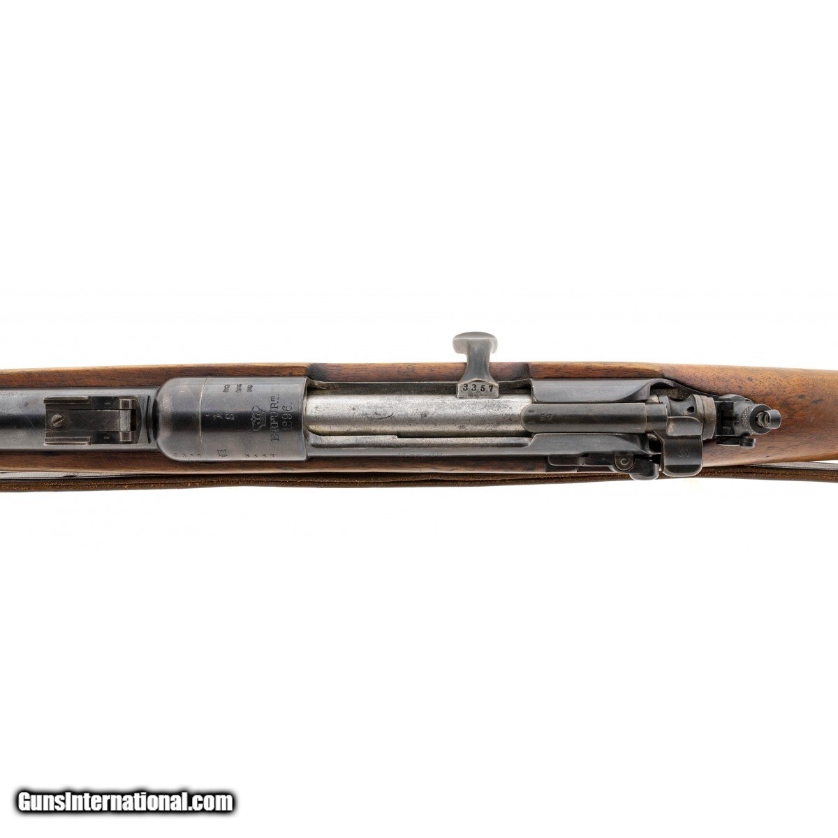 Serial No. 3357, made in 1896 by Erfurt, 8x57mm,18"" barrel. Receiver has been upgraded for the spitzer round noted by the ""S"". Bore is bright with some minor frosting visible in the grooves. Serial numbers are matching, stock has been lightly sanded down at some point. A peep sight has been added to the bolts rear. The front band has a regimental stamp ""U.12.2.74"", these carbines saw action up until the end of the War!