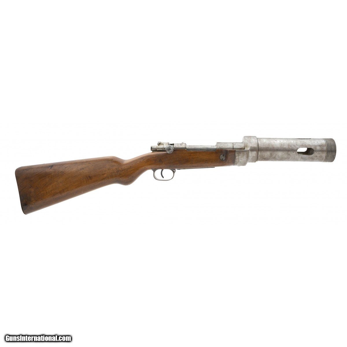 Rare German WWI issue line throwing gun. Bore is approximately 53MM and shoots a blank cartridge. Bottom of stock is numbered A. 196. Top of receiver has a faint 1914 date and Obendorf markings. A very interesting and unique device!