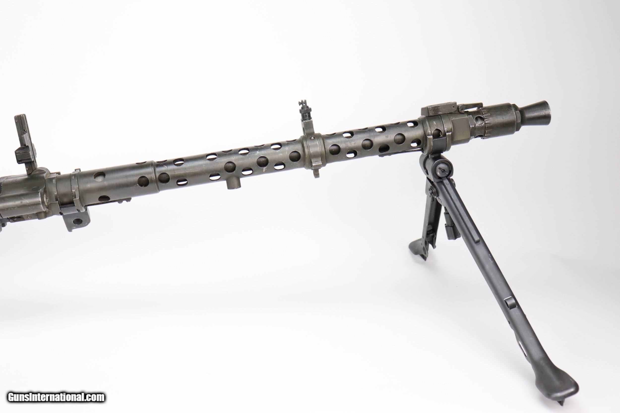 Description: This is a very nice example of a dummy, non-operable example of an MG-34 that was issued to the Nazi Army in 1943. The gun is not matching and has a decommissioned receiver with the barrel removed. The rest of the gun is comprised of period-correct German parts. Nazi proofs throughout. The serial on the receiver is crossed out and renumbered. The receiver is also torch-cut. The bipod is operable. Excellent blued finish overall with minor edge wear and patina but no major areas of bluing loss. Nice wood stock with only minor handling wear. Comes with the original barrel, which generally has strong rifling with only minor freckling in the grooves. Also comes with most of the internals, like the bolt and firing pin. This would make an awesome display piece. SOLD Manufacturer: Waffen-Werke Bore: 7.5/10 Condition: 90% Manufacture Date: 1943 |