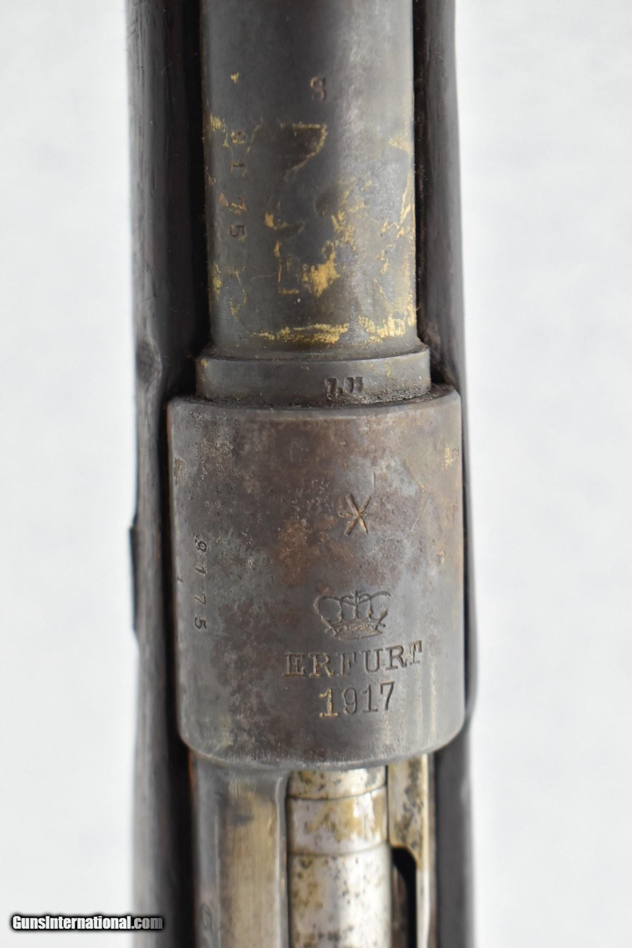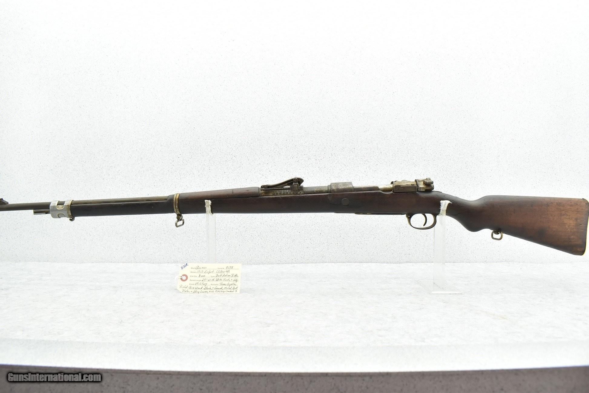 Description: Guns Listing ID: 614357 Erfurt (German) – Mod. GEW 98 – 8mm Cal. Bolt Action Rifle – w/29" Barrel w/Blade Front & Adj. Rear Sights – Military Finish – w/Pistol Grip Wood Stocks w/Metal Butt Plate – w/Sling Loops – Dated 1917 – Appears All Matching Numbers Including Bolt – Note: Pistol Grip Cracked & Pinned CONDITION: GOOD Manufacturer: GERMAN MILITARY Model: GEW Caliber Info: 8MM MAUSER Condition: Used - Non-Certified Barrels: 29" BARREL Action: BOLT ACTION Price: $999.99 Contact Seller |