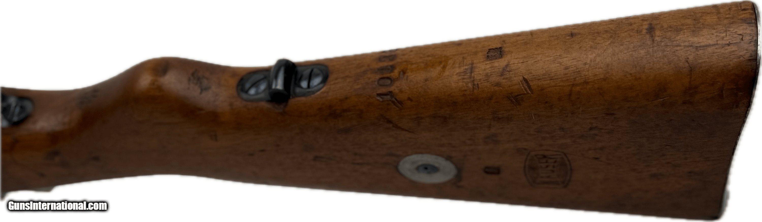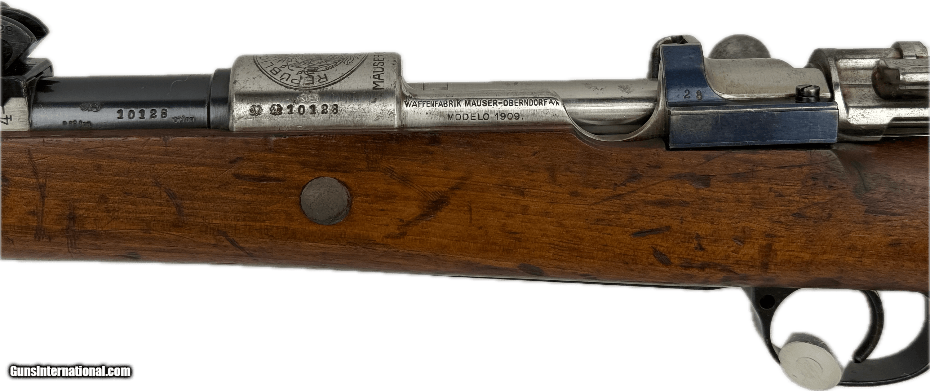 Description: Mauser, Model 1909, Peruvian Contract, 7.65mm, 29.5“ Barrel, Blue, Bright In White (Receiver, Bolt, Springs, Disc, Rod, Butt Plate), Nitre Blue (Bolt Release, Screws), Visible Numbers Match Except Bolt, Bolt Shroud, Floor Plate, and Cleaning Rod, Made In Oberndorf Germany, Peruvian Crest And “Mauser Original” On Receiver, Serial # 10128, Condition: Very Good, with scattered scratches, nicks, and dings, front bottom metal lock screw broken off, staining on butt plate, Bore: Bright.******************C&R***********************19040050/57************************C&R*************************** *******Free Shipping(Lower 48 States only)*********************Layaway Available************************Trades Considered*******************FIREARMS MAY HAVE FOREIGN PROOF AND IMPORT MARKS******* If you are the winning , you will receive payment instructions in a confirmation email • Payment: We accept United State Postal Service Money Orders or Credit Cards Add 3.5% Service Fee- Visa, MasterCard & Discover.