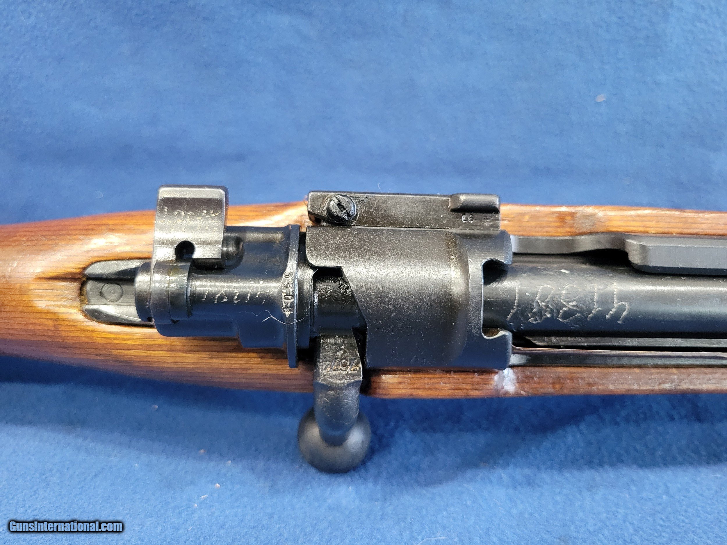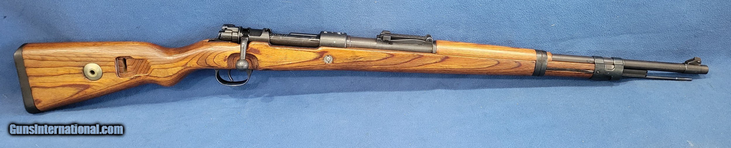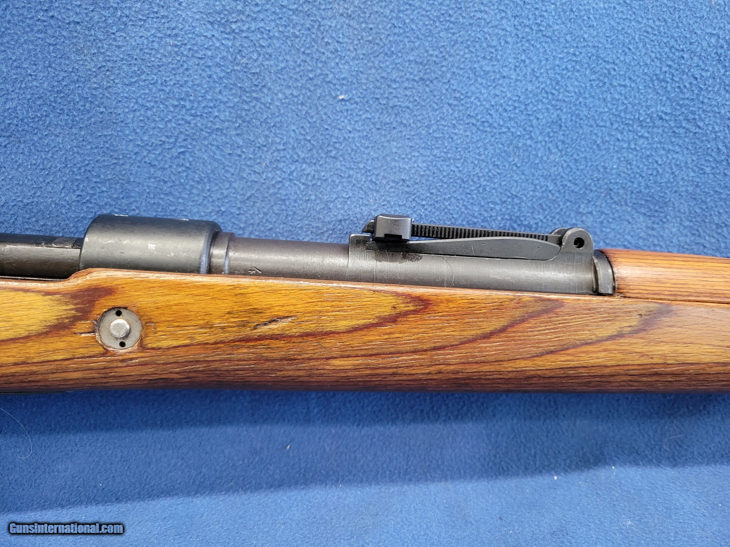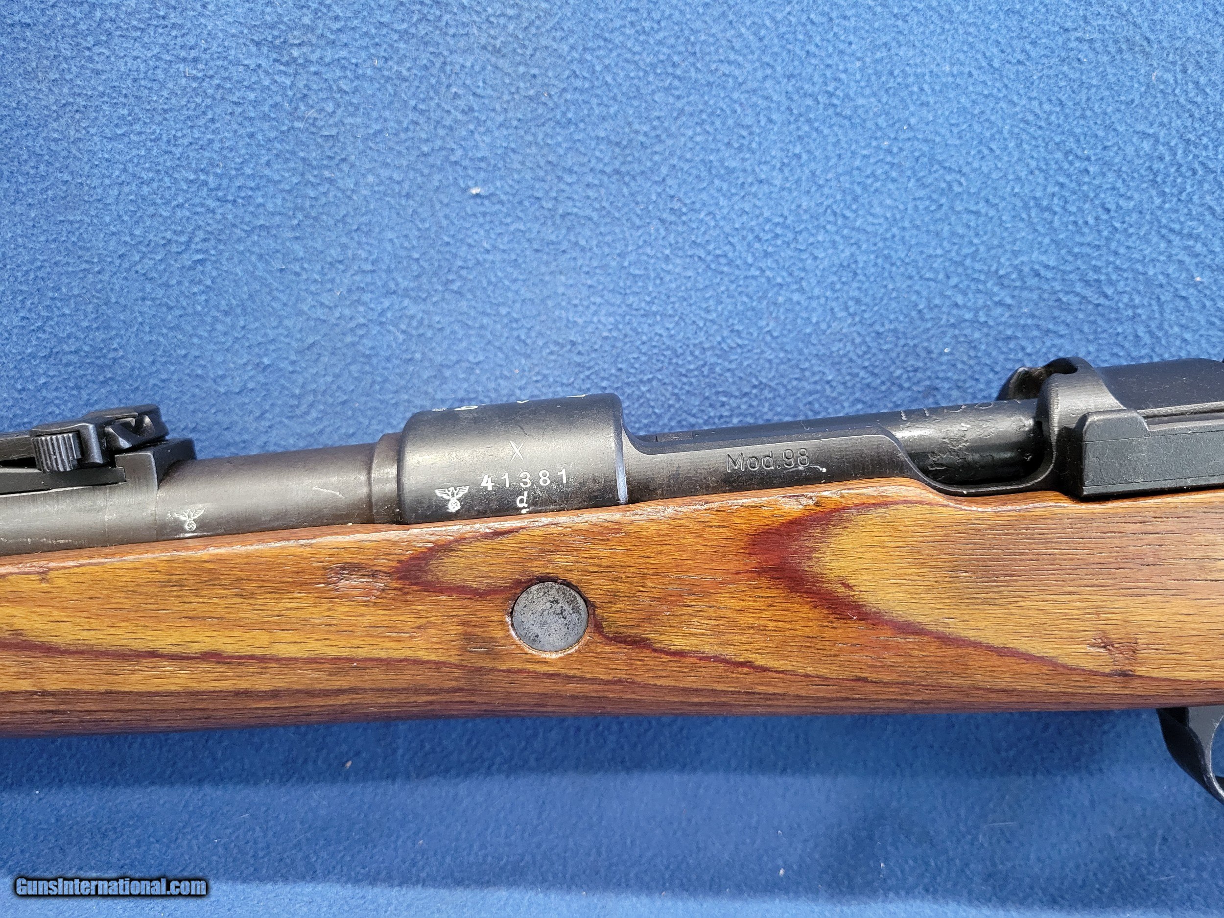 Description: NICE MAUSER (byf) K98K, CAL. 8MM, SER.41381. HERE IS A GREAT CHANCE TO OWN ONE OF THE GERMAN STANDARD ISSUE RIFLES FROM WWII. THE GUN IS IN GREAT REARSENAL SHAPE WITH VERY LITTLE FINISH LOSE THROUGHOUT. THE METAL HAS 99% OF ITS REARSENAL FINISH LEFT. THE WOOD IS A STANDARD POST/LATE-WAR STOCK WITH A LAQUER FINISH. IT HAS VERY FEW DINGS AND NO CRACKS. THE BOLT AND RECIEVER HAS BEEN ELETROPENCILED MATCHED. THE FLOOR PLATE HAS ALSO BEEN ELETROPENCILED TO MATCH THE RECEIVER. THE STOCK IS NUMBERED ON THE LEFT SIDE OF THE STOCK NEXT TO THE BUTTPAD. THE BUTTPAD IS MARKED "gqm/43/eagle/waa286". THE GUN IS IMPORT MARKED ON THE BOTTOM OF THE BARREL. THE BOLT HAS A FEW PATCHES OF PITS BUT HAVE BEEN FINISHED OVER. THE BORE HAS STRONG AND BRIGHT RIFLING WITH SCATTERED FROST. A GREAT RIFLE WHERE YOU WON'T HAVE TO SELL THE FARM TO GET. PRICED AT.............. $995. To purchase this firearm or if you want to request more information contact us at: Email ckguns[at]ymail[dot]com Phone 201-512-0002 Cell 201-575-6838 FAX 201-215-4759 We accept most major credit cards. Prices shown are Discounted 3% for Cash or Check. The buyer must be familiar with all the laws governing the purchase and the ownership of firearms in their own city and state. The Yankee Armorer, Inc is not responsible for any failure to comply with or observe these laws. The Yankee Armorer, Inc will only ship after full payment and receipt of all required documents. Shipping: Add $35.00 for handguns, $45.00 for long guns. New Jersey buyers are subject to a 7% sales tax. The Yankee Armorer, Inc offers a 3 day inspection period with full refund upon return of intact firearm and in the original condition. The Yankee Armorer, Inc offers a no interest lay away program - 25% down; 25% in 30 days; 25% in 60 days; and full payment in 90 days. Any violation of this policy is subject to restocking and forfeiture of all payments. Any variation from this policy must be agreed to in advance. Unshipped Cancelled sales are subject to a 20% restocking fee. Be advised that all firearms sold by The Yankee Armorer, Inc. or the Gun Exchange, LLC (SELLER) are sold as collector’s items. They have not been fired or tested for safety and must be examined by a license gunsmith prior to use. By purchasing any item from the (SELLER), you are agreeing to hold the (SELLER) free from any damages or lawsuits of any nature. Any item left for transfer or storage will be charged to $25.00 per month, per item from the day of its receipt. Any variation from this policy must be agreed to in advance. Store hours 10:00 am to 5:00 pm Tuesday -Saturday. It's always best to call for appointment. Store 201-512-0002, cell 201-575-6838. SOLD |