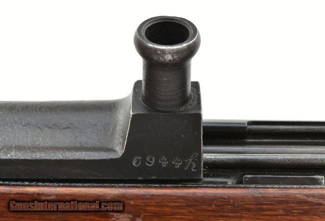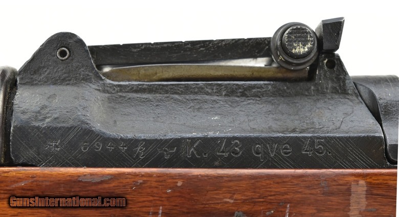 Description: QUE Code Berlin Lubecher K43 8mm caliber rifle. Popular WWII German military semi-auto. Serial numbers are matching, except for the wood. Bore is very good with strong rifling and some light frosting. QUE code. 1945 dated.