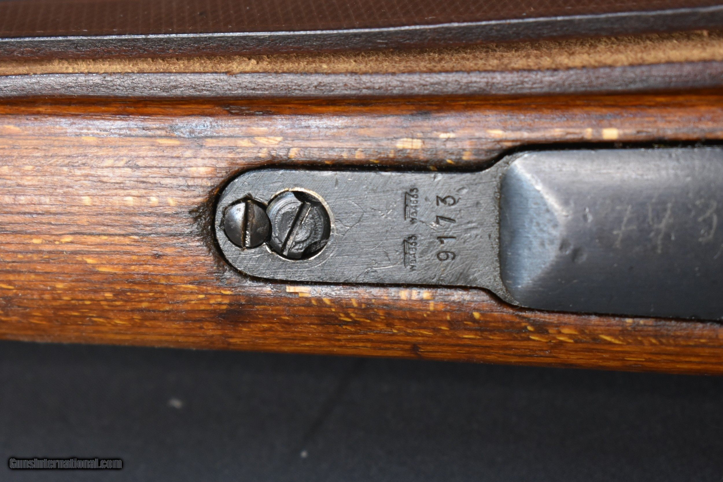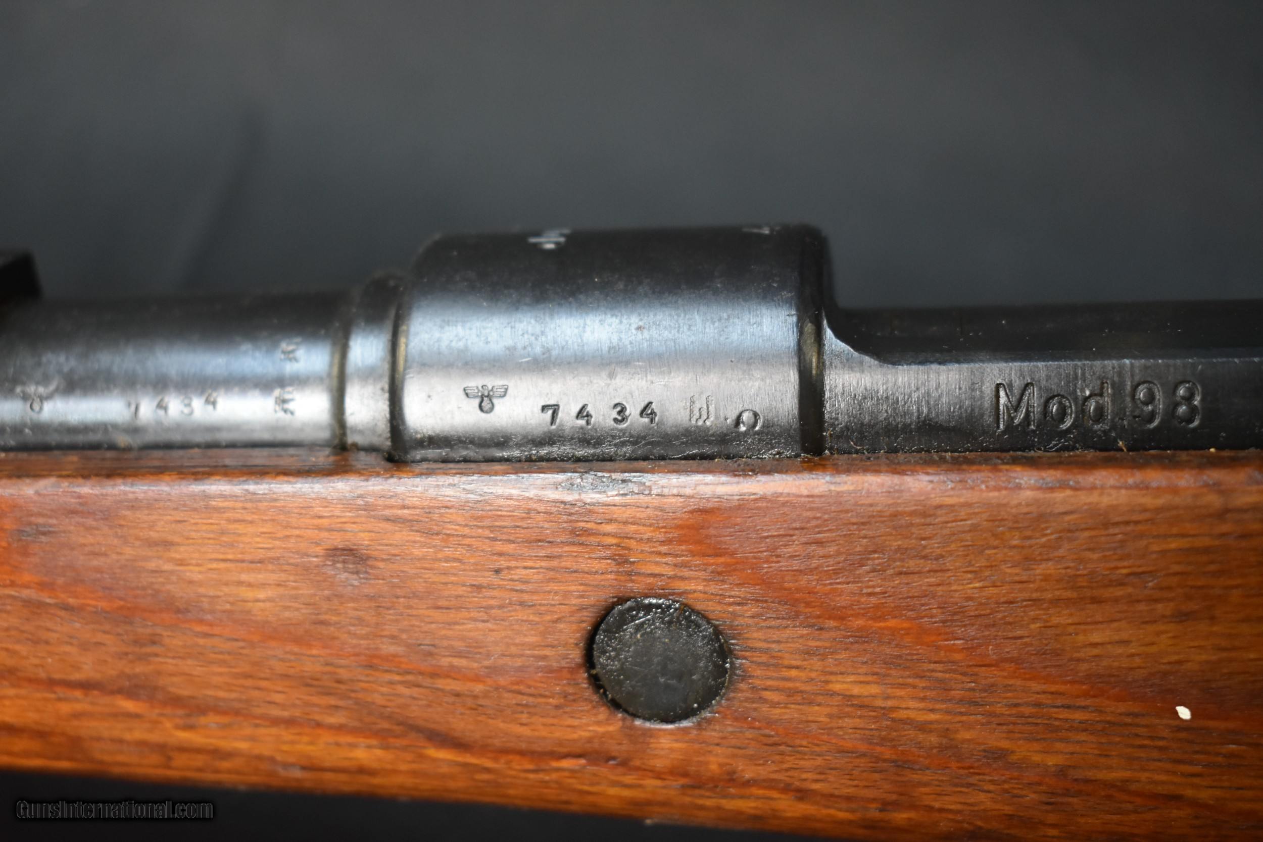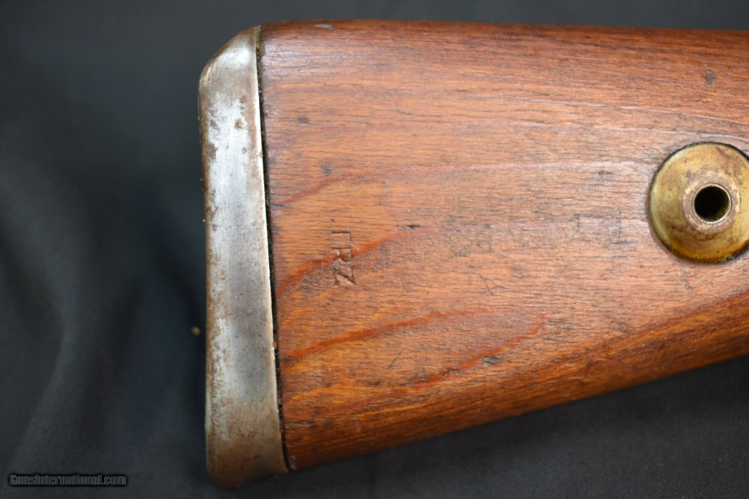 Description: CAPTURE MAUSER MILITARY RIFLE. Cal. 8mm Mauser. S# 7434. Bbl. 23 5/8". Import marked on right side of bbl. Original serial numbers match on receiver & bbl. Bolt & bolt sleeve have been electro penciled to match. Receiver is marked on top "duv" "41" "X" Russian capture marking nice crisp lettering. Left receiver rail is marked "Mod. 98". Receiver ring & bbl. marked on left side w/ German eagle proofs. Bbl. retains eagle "214" acceptance marks over chamber. Tangent rear sight graduated to 2,000 meters. Inverted V front sight w/ protective hood. Cleaning rod & bayonet bar are present. All milled furniture except cup type buttplate. Laminated stock set. Buttstock marked on the left side w/ circular Russian overhaul mark behind steel disassembly disk. Buttstock marked on right side w/ ".TRZ" near buttplate. Reproduction German style leather sling. CONDITION: stock set has arsenal rework type finish w/ wear & scattered handling marks. Metal has 85% arsenal rework black finish. Extractor has notable plum coloration. Good shiny bore w/ sharp lands but w/ scattered fine pitting in throat area. Maine residents add 5.5% Sales Tax Free SHipping and no CC Fees SOLD Curio/Relic: Yes Rifle Caliber: 8x57mm J Manufacturer: BERLIN-LUBECKER Model: 98K Serial Number: 7434 Barrel Length: 23-5/8 Condition: Very Good Metal Condition: Very Good Wood Condition: Very Good Bore Condition: Very Good Action: Bolt Finish: Blued Manufacture Date: 1941 Item Location: Buxton Maine |