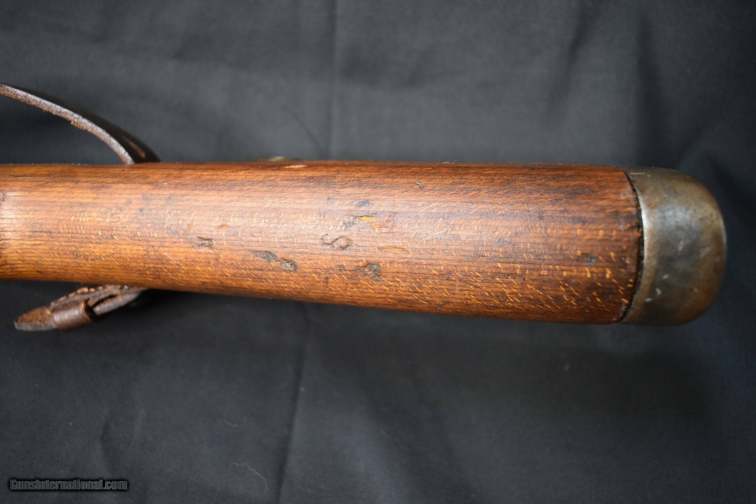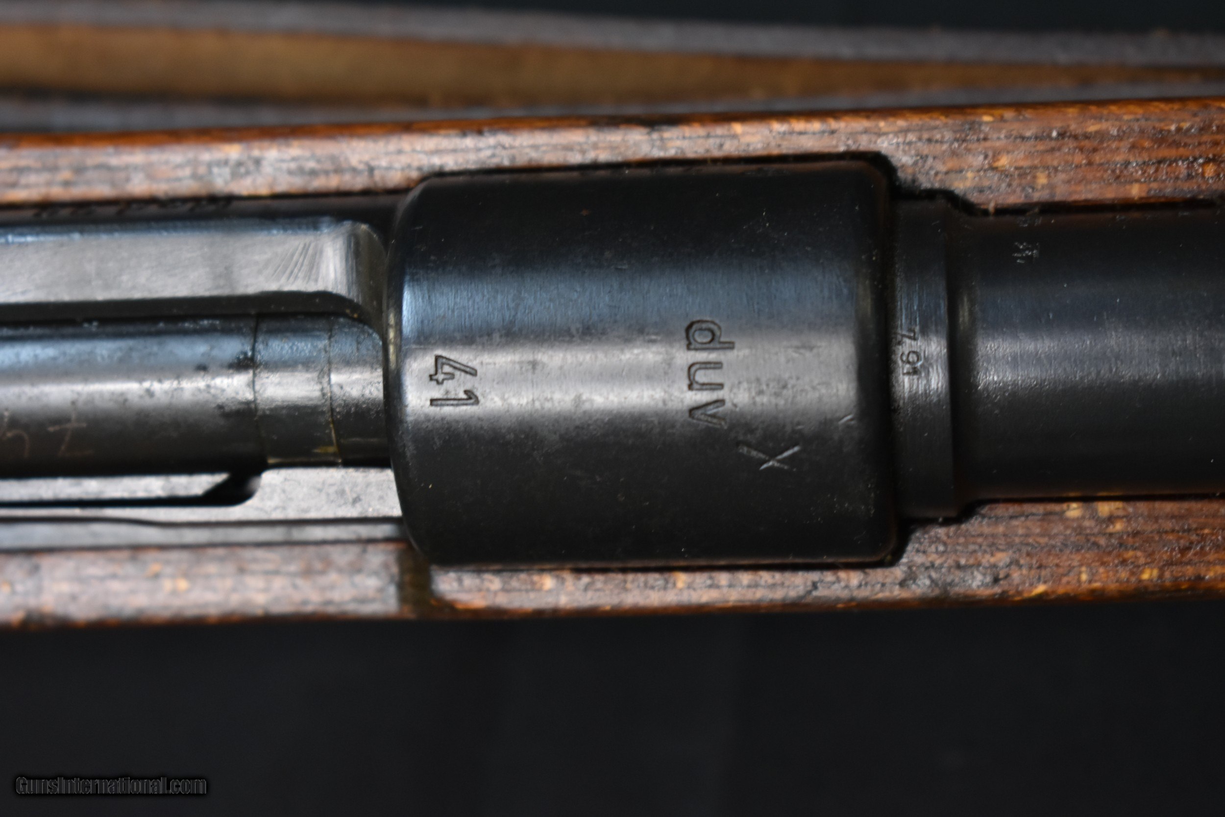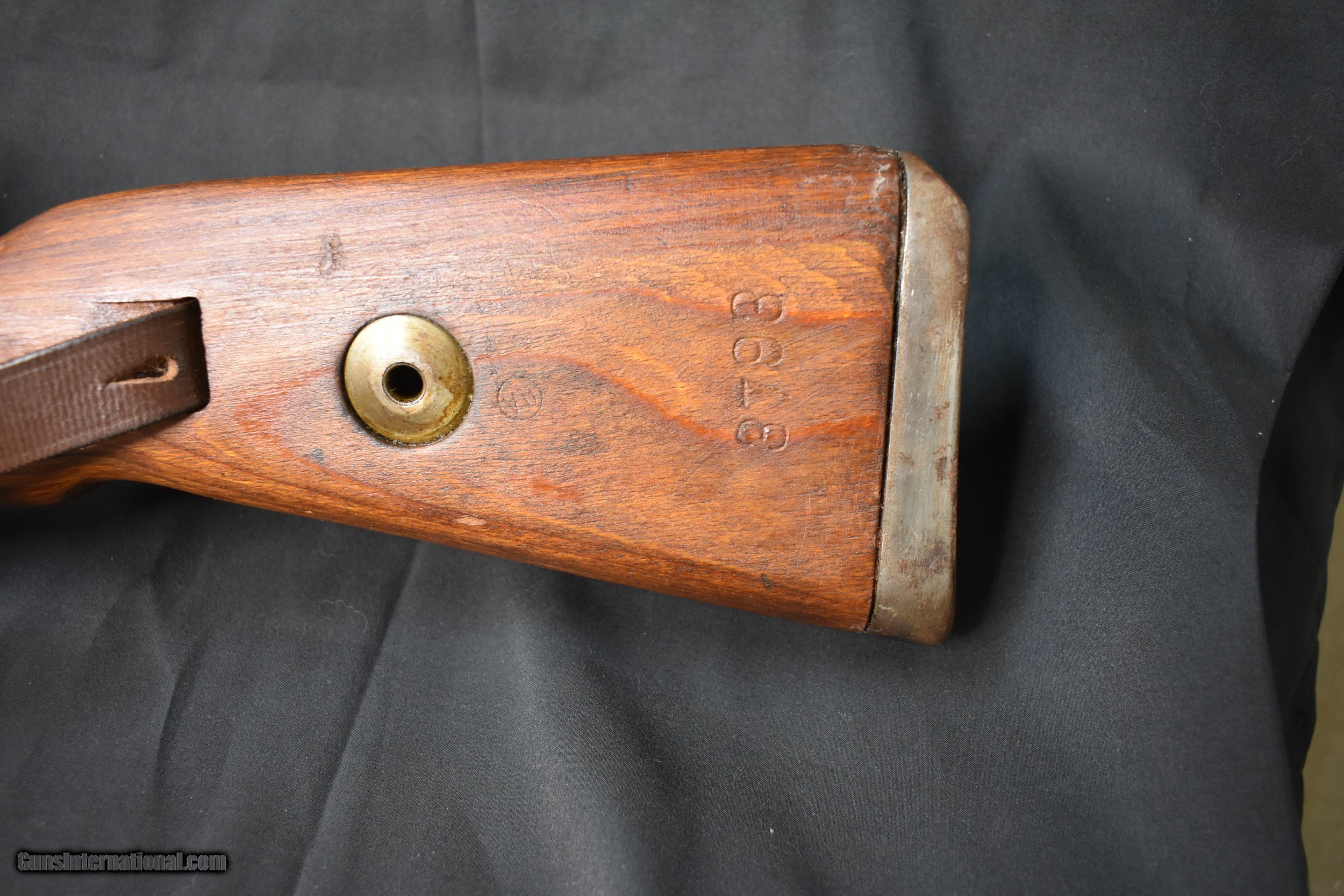 Description: CAPTURE MAUSER MILITARY RIFLE. Cal. 8mm Mauser. S# 7434. Bbl. 23 5/8". Import marked on right side of bbl. Original serial numbers match on receiver & bbl. Bolt & bolt sleeve have been electro penciled to match. Receiver is marked on top "duv" "41" "X" Russian capture marking nice crisp lettering. Left receiver rail is marked "Mod. 98". Receiver ring & bbl. marked on left side w/ German eagle proofs. Bbl. retains eagle "214" acceptance marks over chamber. Tangent rear sight graduated to 2,000 meters. Inverted V front sight w/ protective hood. Cleaning rod & bayonet bar are present. All milled furniture except cup type buttplate. Laminated stock set. Buttstock marked on the left side w/ circular Russian overhaul mark behind steel disassembly disk. Buttstock marked on right side w/ ".TRZ" near buttplate. Reproduction German style leather sling. CONDITION: stock set has arsenal rework type finish w/ wear & scattered handling marks. Metal has 85% arsenal rework black finish. Extractor has notable plum coloration. Good shiny bore w/ sharp lands but w/ scattered fine pitting in throat area. Maine residents add 5.5% Sales Tax Free SHipping and no CC Fees SOLD Curio/Relic: Yes Rifle Caliber: 8x57mm J Manufacturer: BERLIN-LUBECKER Model: 98K Serial Number: 7434 Barrel Length: 23-5/8 Condition: Very Good Metal Condition: Very Good Wood Condition: Very Good Bore Condition: Very Good Action: Bolt Finish: Blued Manufacture Date: 1941 Item Location: Buxton Maine |