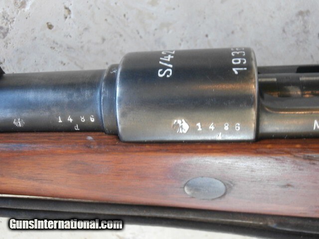 Description: WWII German Mauser K98k Bolt Action Rifle manufactured in 1936. Marked S/42. Very nice condition with Excellent bore. All matching serial numbers except stock. Fires and functions very well. Includes original correct sling. Rifle Caliber: 8x56mm MS Manufacturer: Mauser Model: K98k Serial Number: 1486 Barrel Length: 24 Condition: VG Metal Condition: VG Wood Condition: VG Bore Condition: Excellent Weight: 9lbs 6oz Price: $2,350.00 Shipping: $50.00 Contact Seller |