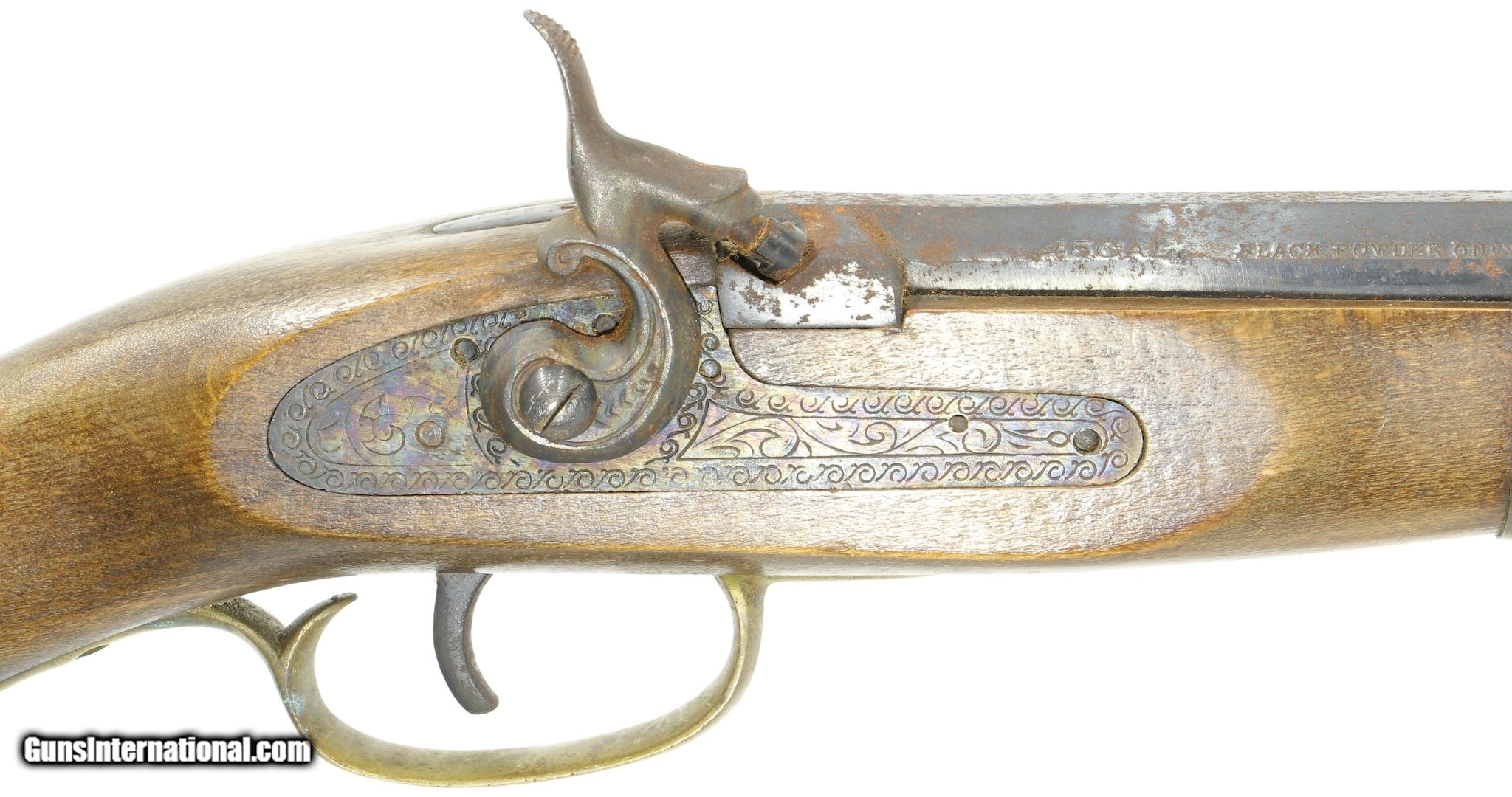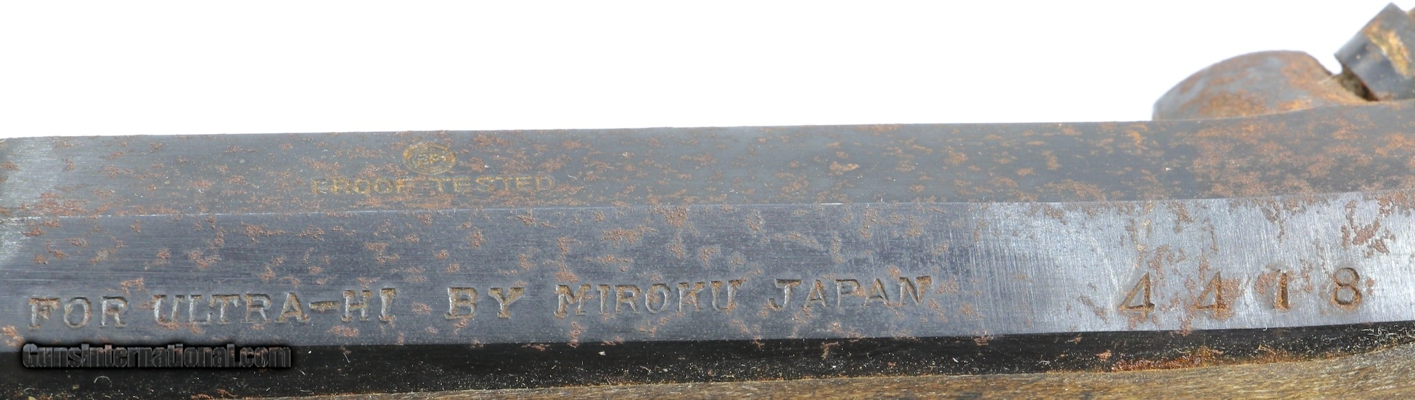 Description: Guns Listing ID: 847551 Miroku Ultra-Hi Japanesse Ultra-Hi .45 Black Powder Rifle SN: 4418 Miroku Japanesse Ultra-Hi black powder percussion cap rifle chambered in .45 caliber. The rifle displays a 33 1/2\" long octagonal barrel, hard wood stock and fore grip, brass accents, crescent butt plate, and brass trigger guard. The barrel is marked across the top reading \"MFG. For ULTRA-HI By Miroku Japan 15486\" on one side and \".45 CAL BLACK POWDER ONLY\". The top of the barrel shows a PROOF TESTED stamp. The rifle shows good condition overall with some light wear across the piece. SKU: 22050046 SOLD Manufacturer: MIROKU Model: ultra hi Caliber Info: .45 ACP Condition: Used - Non-Certified Barrels: 33 BARREL |