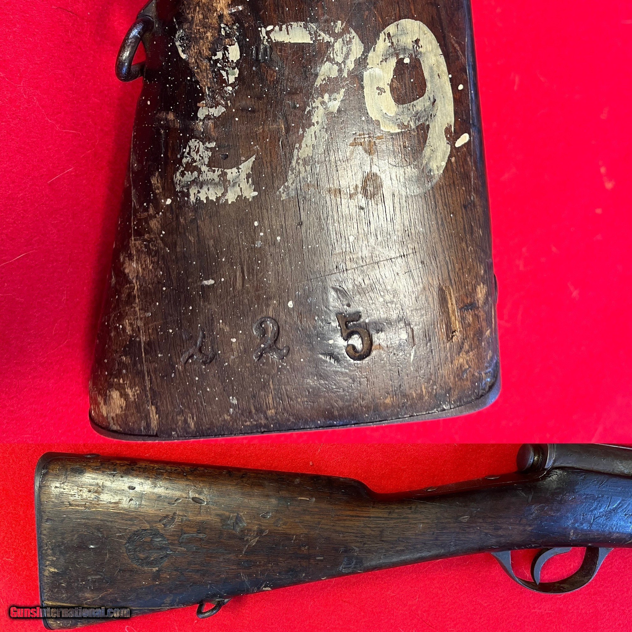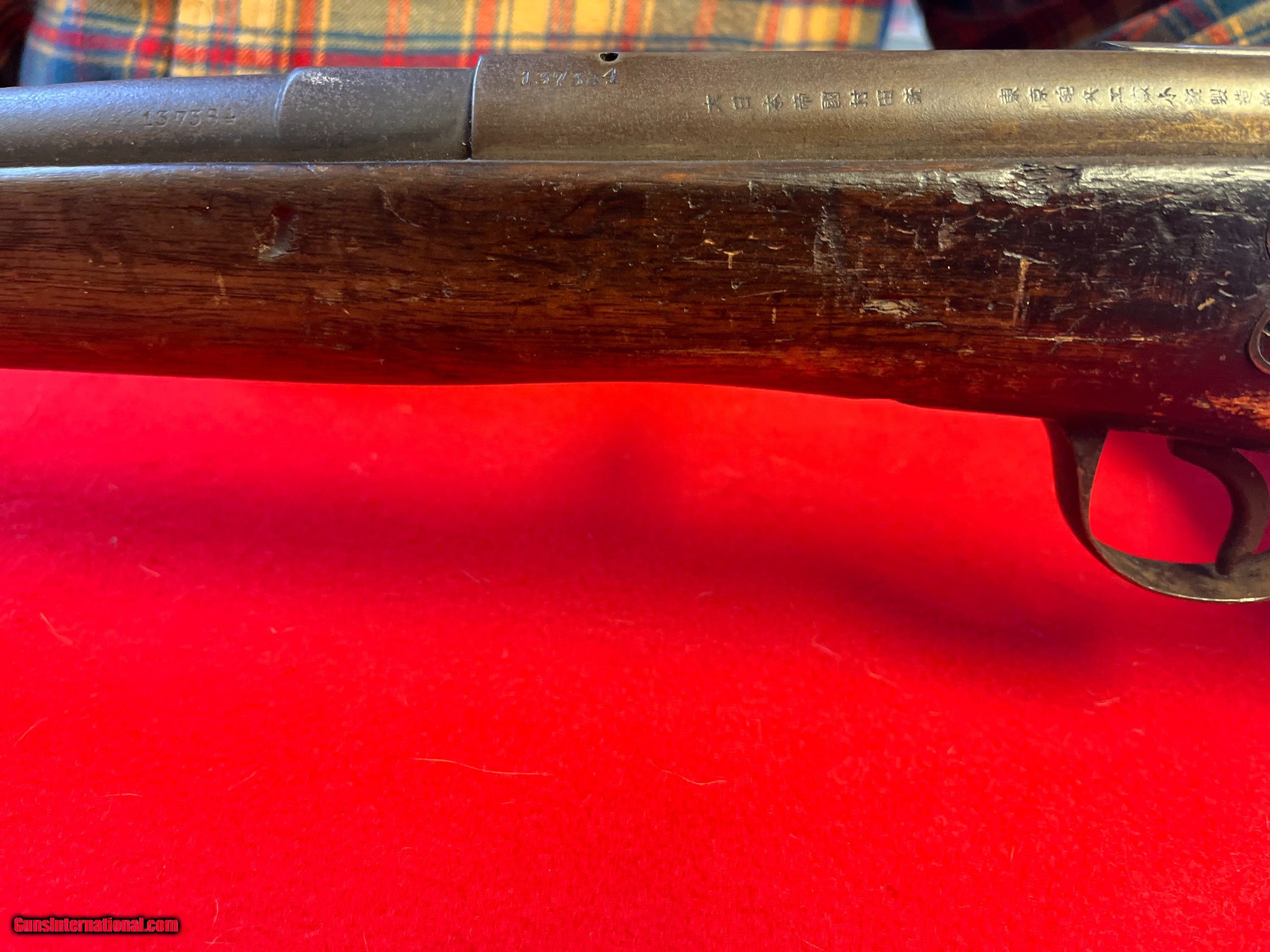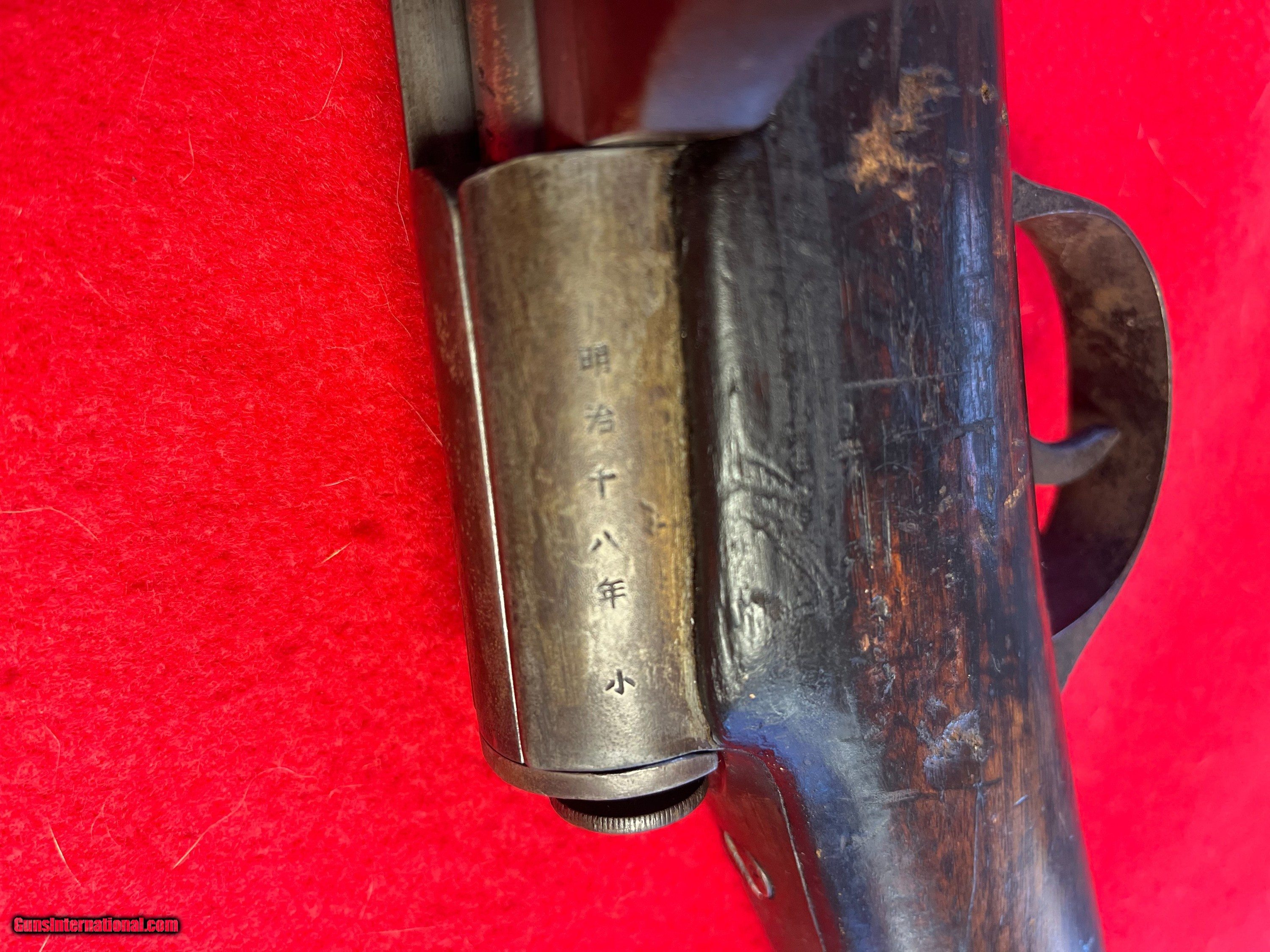 Description: Model 13 11-millimeter .(The original 11-millimeter Murata cartridge used an approximately 6-millimeter Boxer-type primer.) single-shot, bolt-action. 32" Barrel Barrel and receiver are a dark brown patina with surface oxidation visible. Rifling and bore are in amazing condition considering age. Stock shows heavy handling and usage wear. Action functions correctly Missing parts of the original sights. Cleaning rod is missing Serial number on gun and bolt are not matching. Kanji on left: Tokyo Artillery Kudo Arsenal Imerial Japanese Army Murata Rifle Kanji on right shows the gun was manufactured in 1885 SOLD Rifle Caliber: 11.15x42R Manufacturer: Japan Model: Murata Serial Number: 137384 Barrel Length: 32 Condition: used Metal Condition: patina Wood Condition: heavy usage Bore Condition: very good |