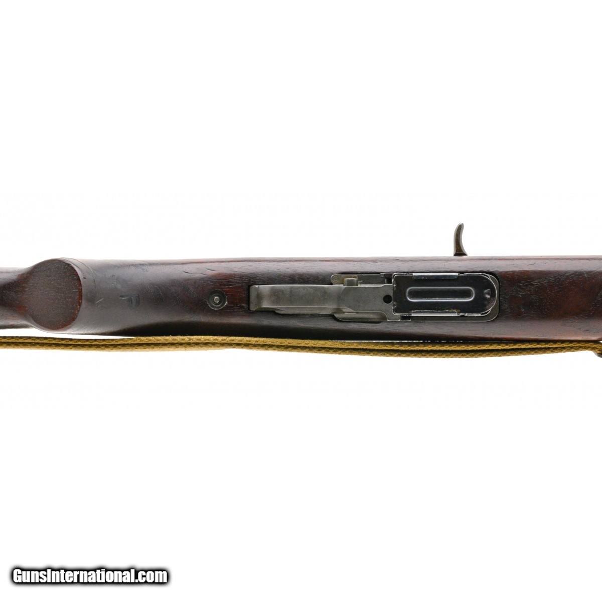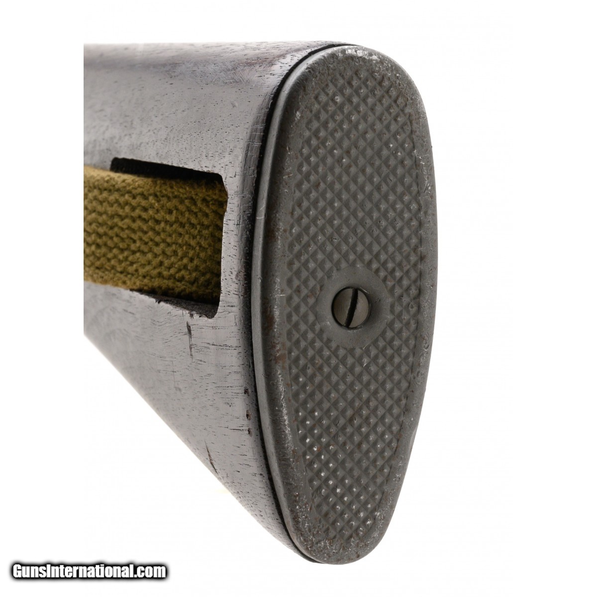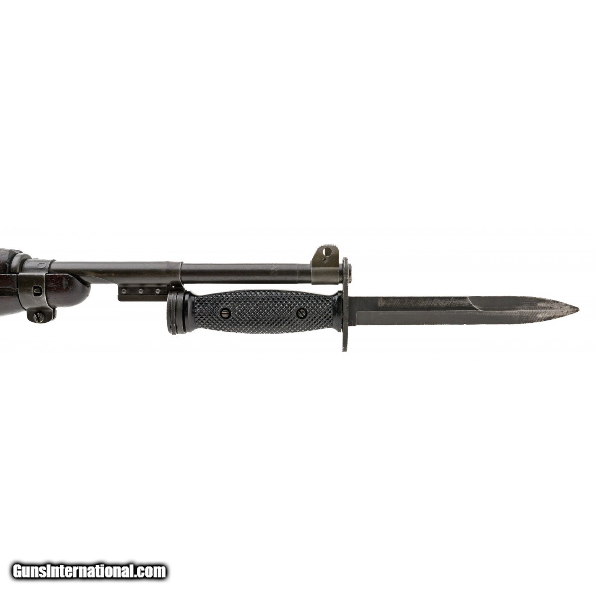 Description: " SN: 7183419. Made in 1945. .30 Carbine with an 18"" barrel. Bore is shiny with strong rifling. M1 Carbine manufactured by Inland Div. with a type C two rivet, tapered, shallow sight groove handguard, flat top bolt, Type ""C"" front barrel band, and Type ""B"" milled rear sight. Finish is in good condition with areas transitioning to a gray/brown patina. Low wood Oval Cut stock shows light handling wear with cartouche noted on the right side of the stock and a repair noted from the grip to the butt plate. Rifle comes with sling and Post WWII M4 bayonet. Overall good condition. SOLD Curio/Relic: Yes |