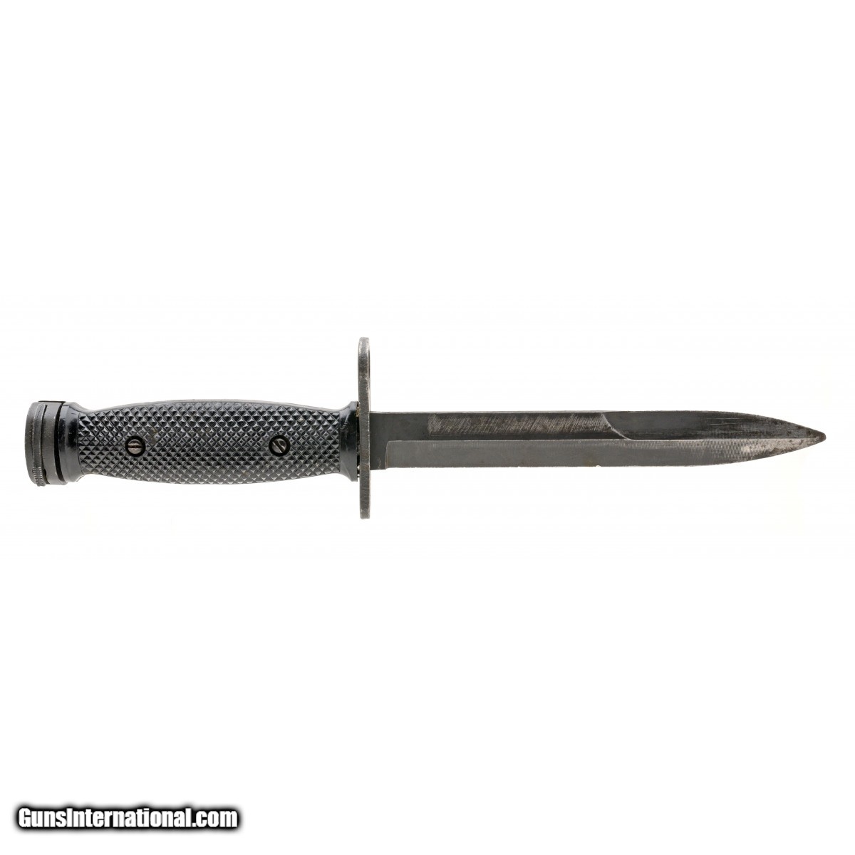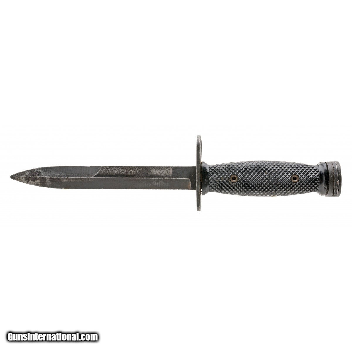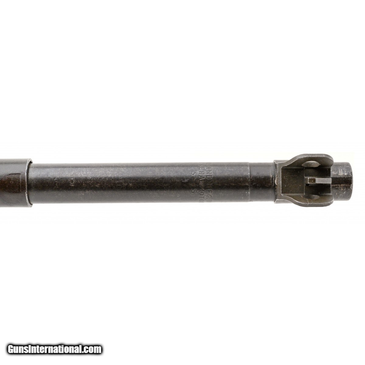 Description: " SN: 7183419. Made in 1945. .30 Carbine with an 18"" barrel. Bore is shiny with strong rifling. M1 Carbine manufactured by Inland Div. with a type C two rivet, tapered, shallow sight groove handguard, flat top bolt, Type ""C"" front barrel band, and Type ""B"" milled rear sight. Finish is in good condition with areas transitioning to a gray/brown patina. Low wood Oval Cut stock shows light handling wear with cartouche noted on the right side of the stock and a repair noted from the grip to the butt plate. Rifle comes with sling and Post WWII M4 bayonet. Overall good condition. SOLD Curio/Relic: Yes |