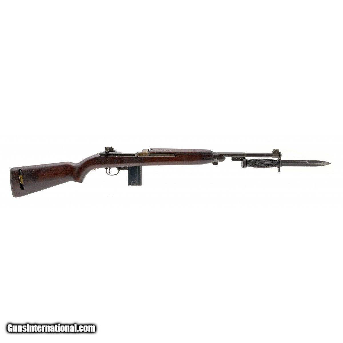SN: 7183419. Made in 1945. .30 Carbine with an 18"" barrel. Bore is shiny with strong rifling. M1 Carbine manufactured by Inland Div. with a type C two rivet, tapered, shallow sight groove handguard, flat top bolt, Type ""C"" front barrel band, and Type ""B"" milled rear sight. Finish is in good condition with areas transitioning to a gray/brown patina. Low wood Oval Cut stock shows light handling wear with cartouche noted on the right side of the stock and a repair noted from the grip to the butt plate. Rifle comes with sling and Post WWII M4 bayonet. Overall good condition.