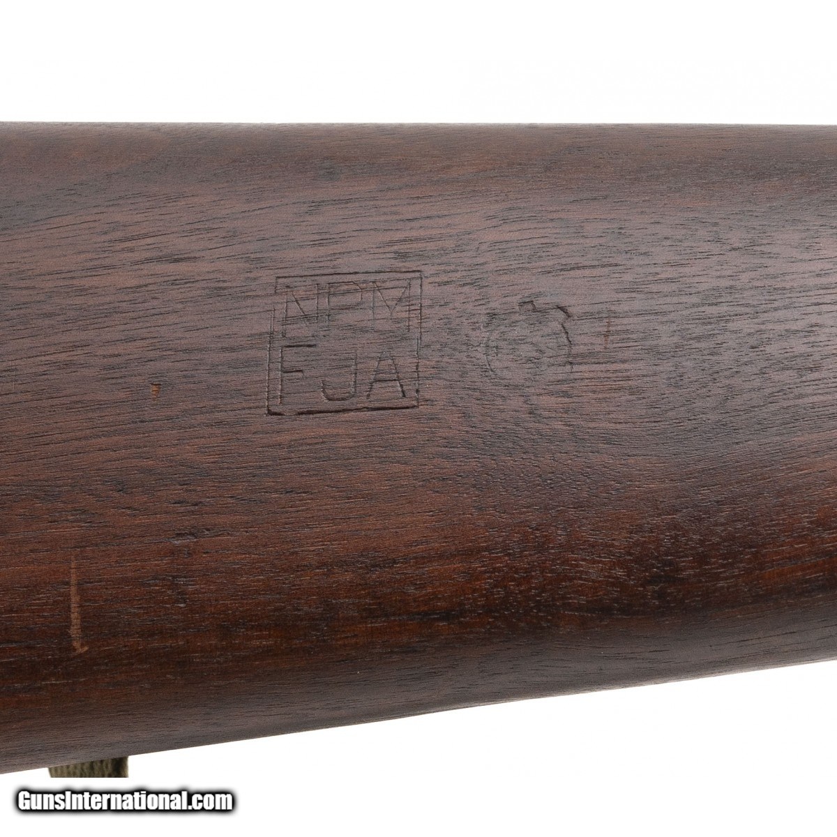 Serial No. 3480887, circa 1943, .30 carbine, 18"" round barrel marked ""SAGINAW S.G. DIV./ GENERAL MOTORS. Bore is bright and shiny with strong rifling visible. Barrel band is marked ""AI"", flat bolt with type ""C"" stamped rear sight marked ""H"" inside shield. Low cut stock is in very good condition with ""NPM/FJA-Ordnance escutcheon"" Sling well is unmarked. Action is smooth and functions correctly. Comes with oiler and sling. Consignment