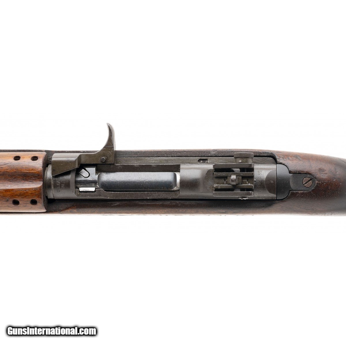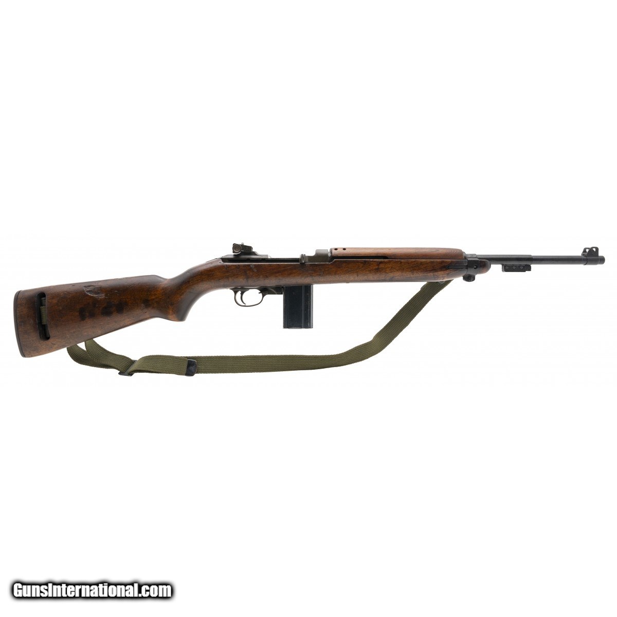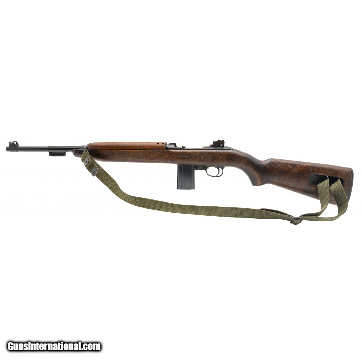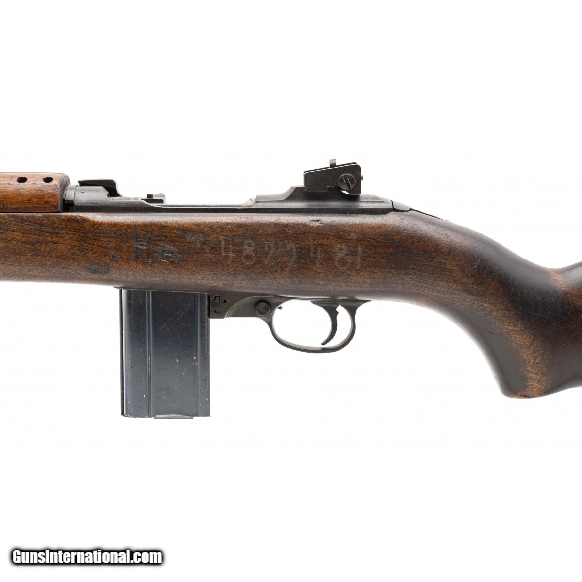 Description: " Serial No. 2485489, circa 1943, .30 carbine, 18"" round barrel that is unmarked. Bore is bright and shiny with strong rifling visible. Carbine has been upgraded for the Korean war. High wood stock has expected nicks, dings, and scratches. Left side has an identification number carved into the wood. Carbine comes with sling and oiler, action is smooth and functions correctly. Consignment SOLD Curio/Relic: Yes |