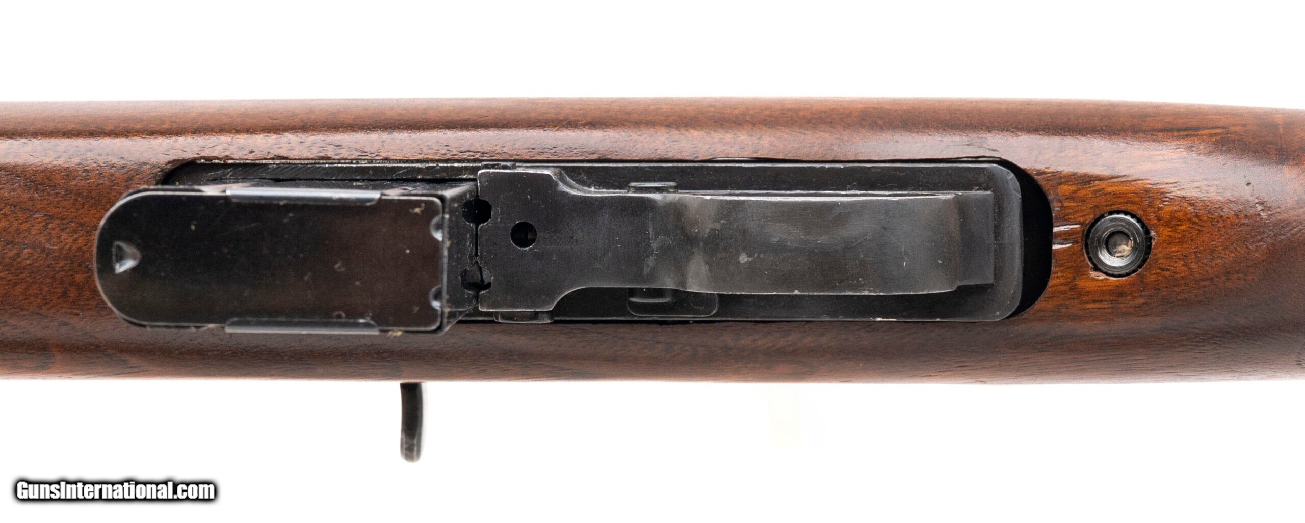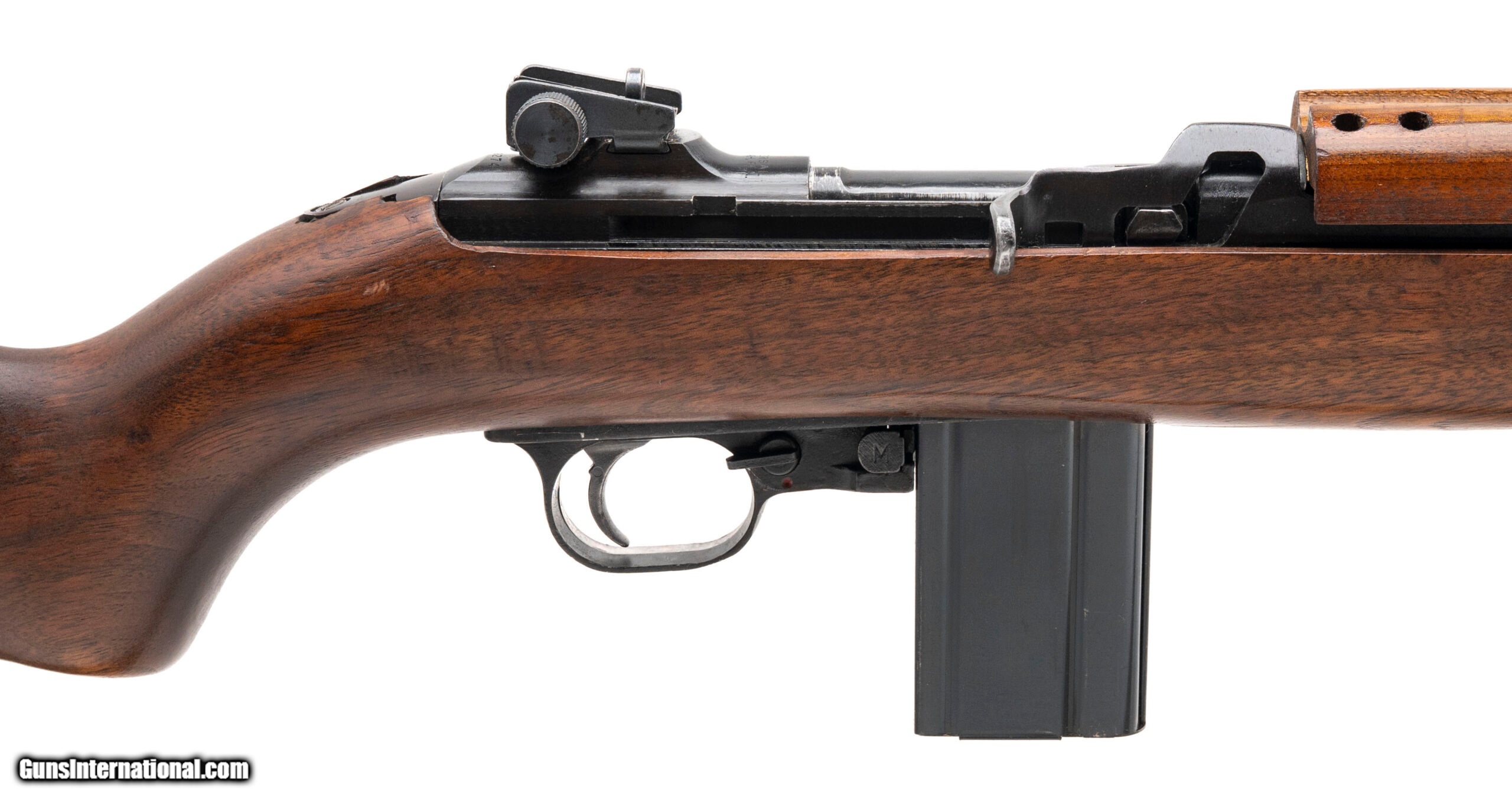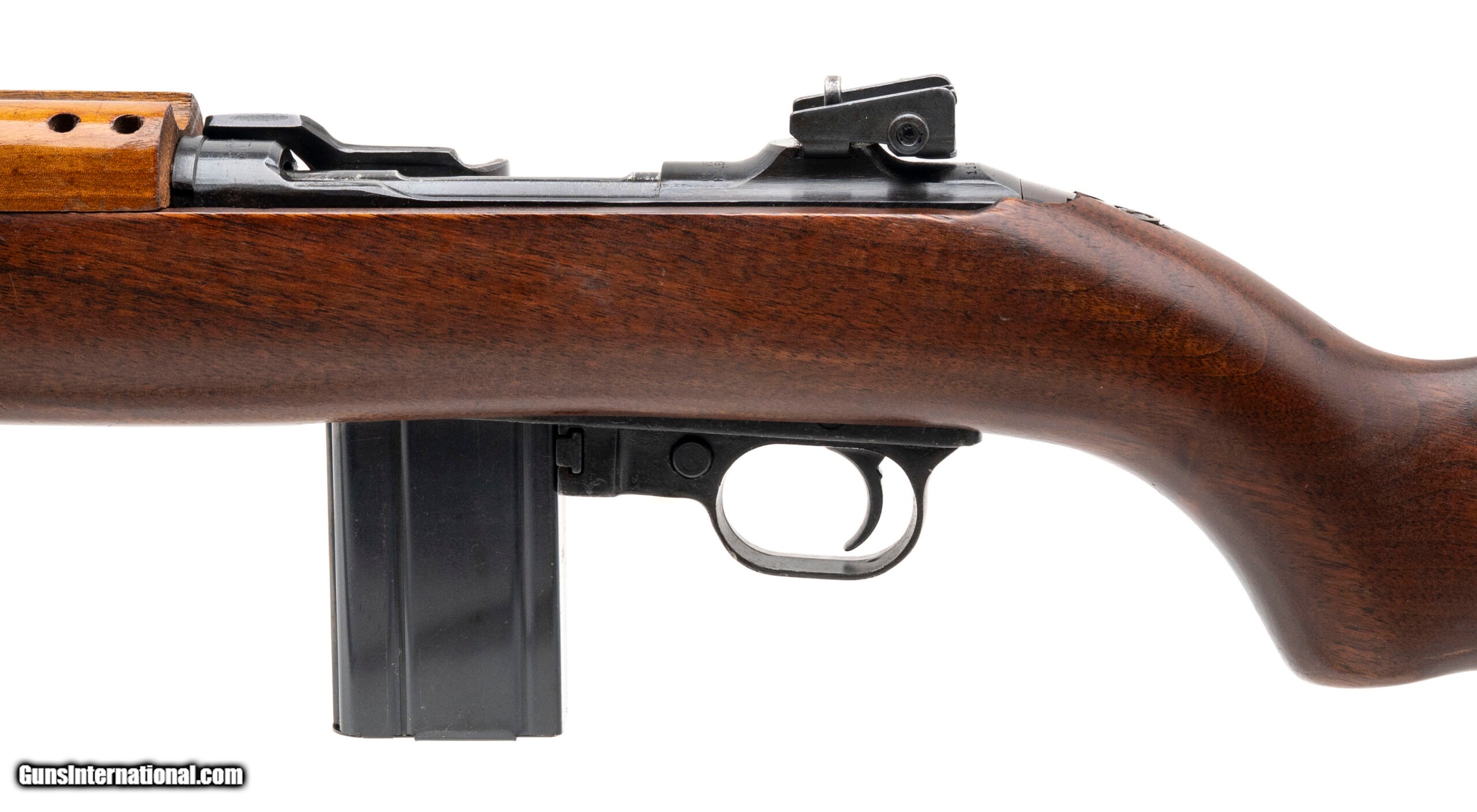 Description: "SN: 119274. 1970s vintage, .30 carbine with an 18"" barrel. Bore is excellent. Semi-auto rifle with bladed front sight, adjustable aperture rear sight, blued finish, and wood stock. Finish is worn with marks throughout, with minor pitting to the front sight band & muzzle. Stock also shows handling wear with marks throughout. Includes sling. Overall condition is very good. SOLD |