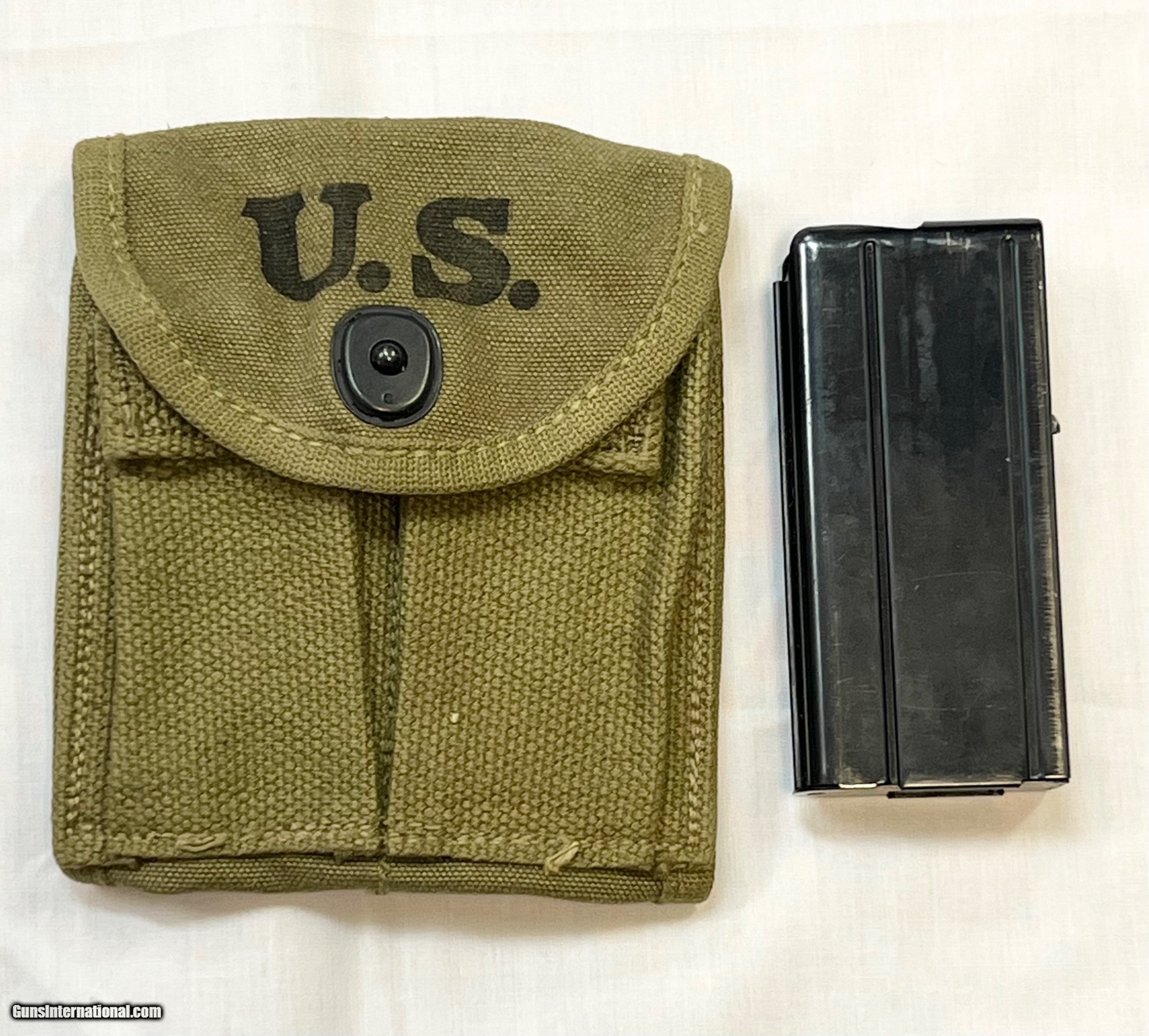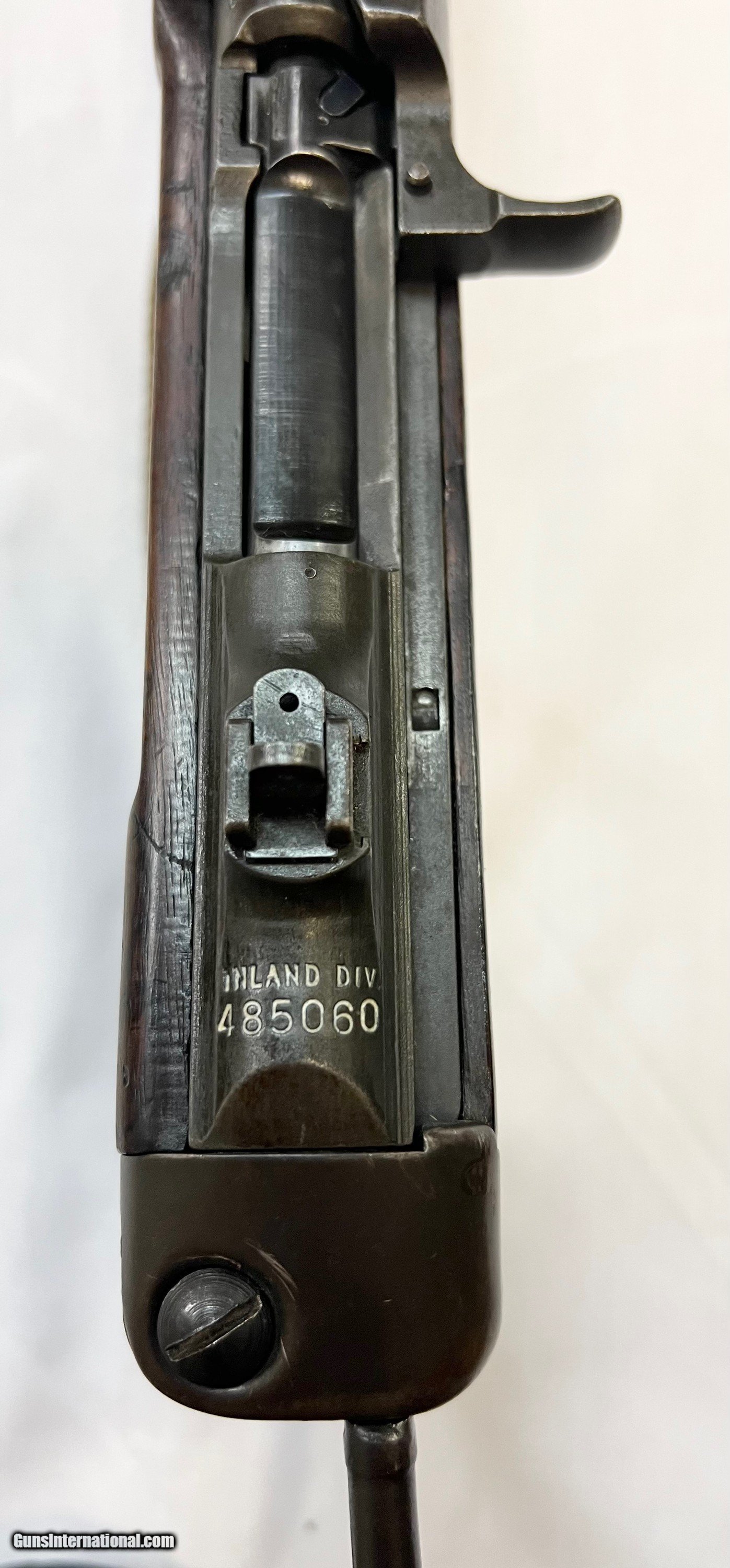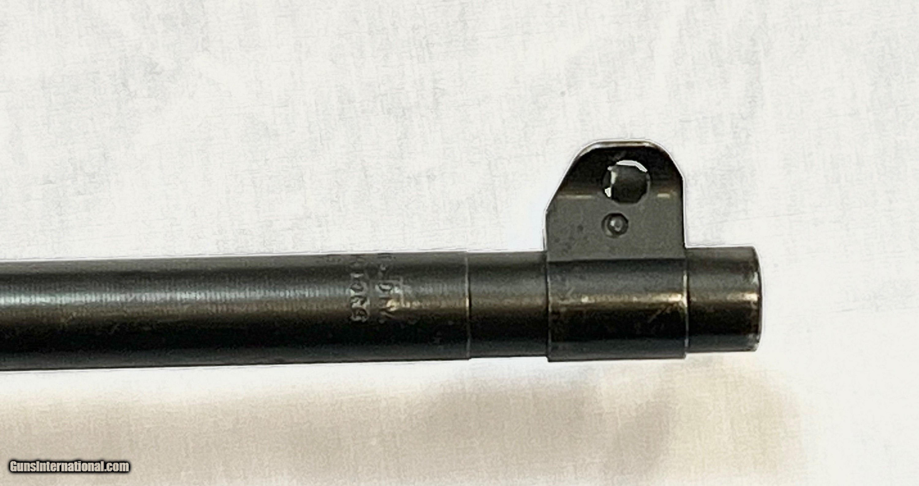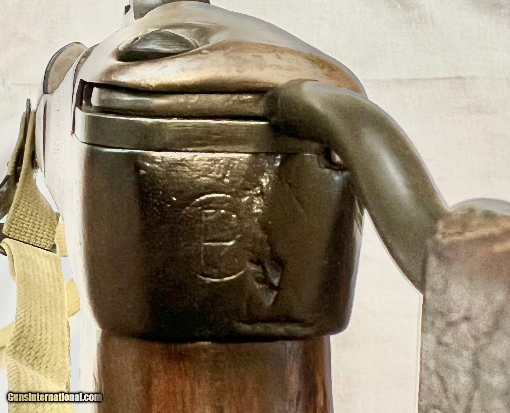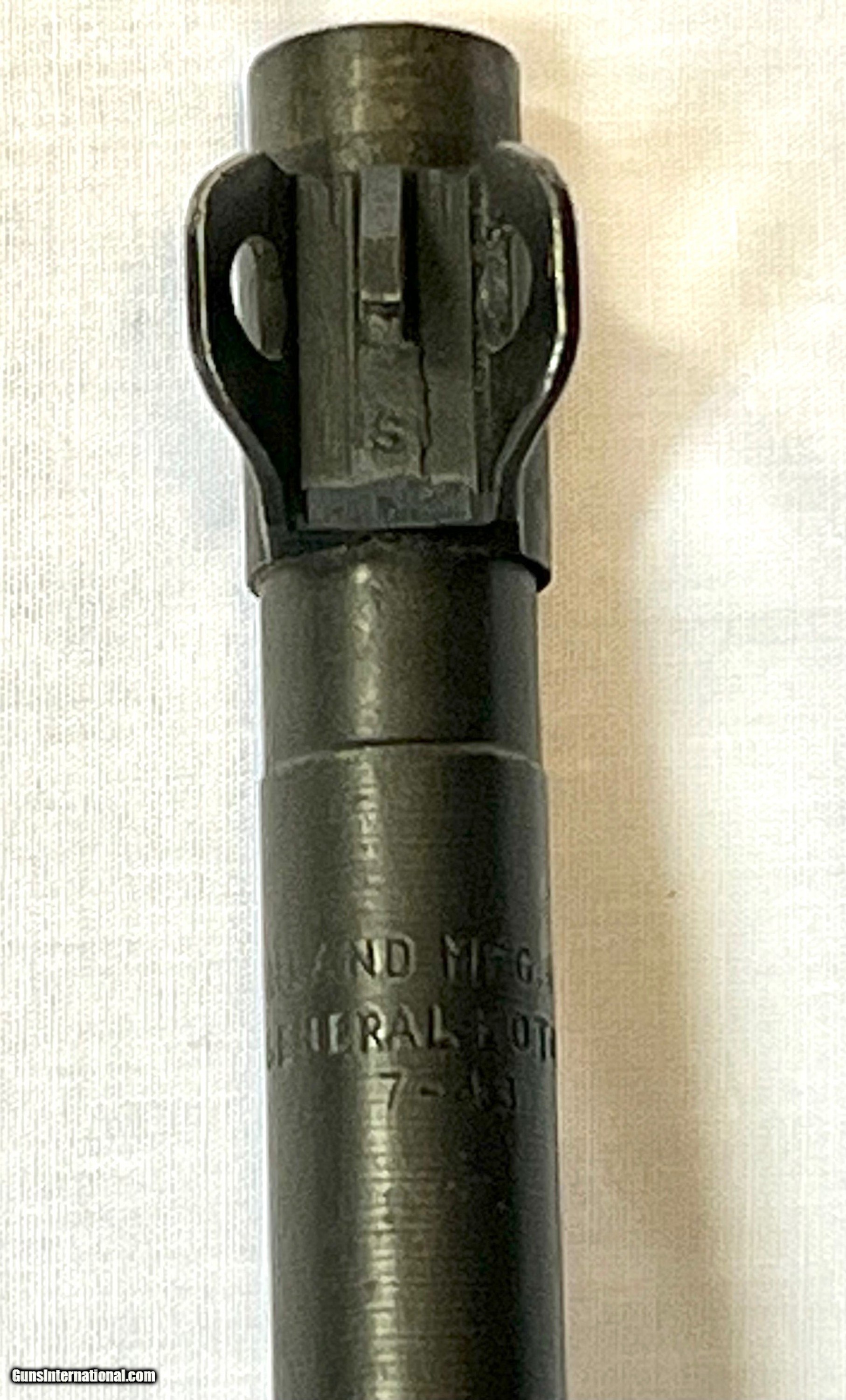 Description: 18" brl marked behind front sight "INLAND MFG. DIV. GENERAL MOTORS 7-43". Flip type rear sight, Blade front sight with protective ears. Narrow barrel band marked "U". Sling swivel marked "UI". Straight cut slide marked "PI". Flat bolt marked "AI". Milled (Inland) trigger housing. Push button safety. Mag. catch marked “W.I.” Dogleg hammer marking appears to be “H”. Walnut stock set with correct original folding butt. Stock marked at the rear over grip with encircled “P” proof. Grip marked on right side with worn “crossed cannons” ordnance mark. Markings at lower end of grip are largely obscured from wear. Original leather cheek pad & metal oiler. WWII vintage faded O.D. greensling. 2 rivet handguard marked “IO”. MAGS: 1-15 rd. marked “S.L.” Accompanied by a 2 pocketmag. pouch marked with “U.S.” on front & marked on back “AIRTRESS MIDLAND” & “1943”. CONDITION: original finish stock set has thinning finish with light wear & handling marks. Forend tip has tiny missing chip on left side extending approx. 1/2" into barrel channel. Metal parts of folding buttstock have original parkerized finish with light wear. Leather cheek pad has scuffing and cracquelure. Metal has 75% original war time parkerized finish with light wear & scattered handling marks. Very good shiny bore. Guaranteed original in all respects. This paratrooper carbine is priced at $4495 plus shipping to your FFL. Please don't hesitate to contact me with any questions or reasonable offers at (704) 280-2382 or via PM on the site. SOLD Curio/Relic: Yes Rifle Caliber: .30 Carbine Manufacturer: GM Inland Divisions Model: M1A1 Paratrooper Carbine (M1 A1) Serial Number: 485060 Barrel Length: 18” Condition: Excellent and original Metal Condition: Excellent and original Bore Condition: Bright and shiny |