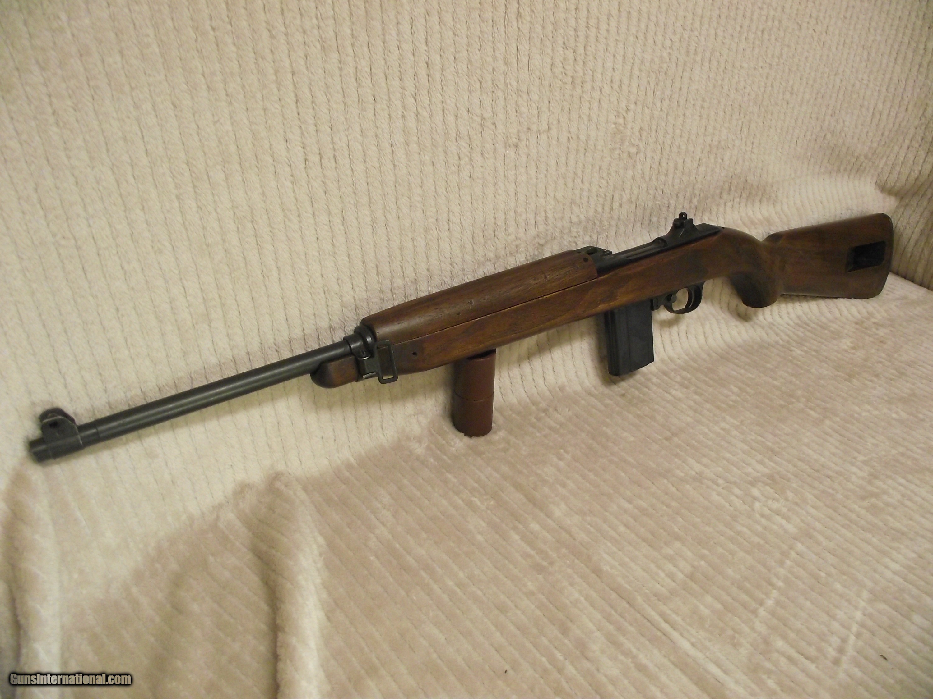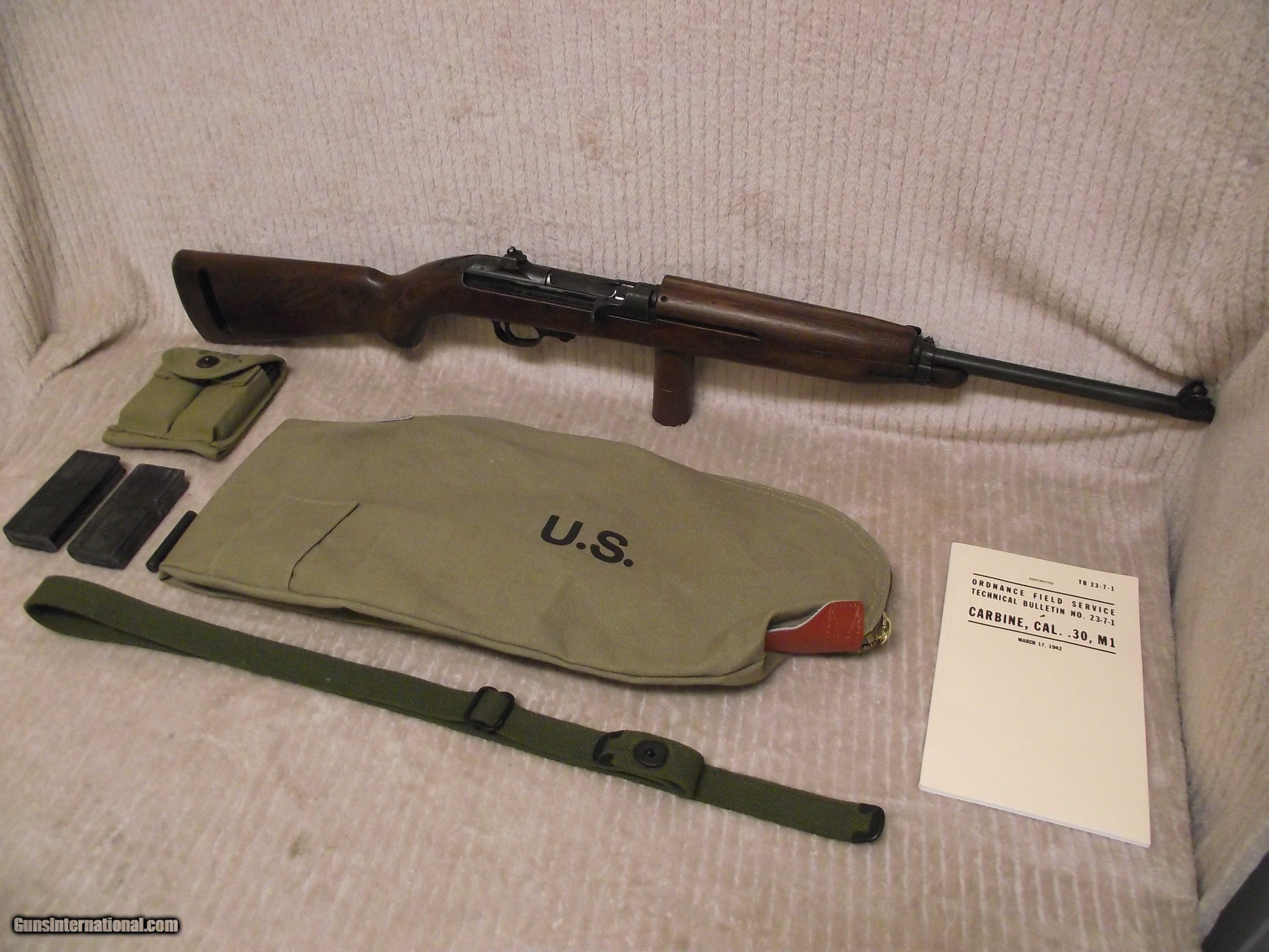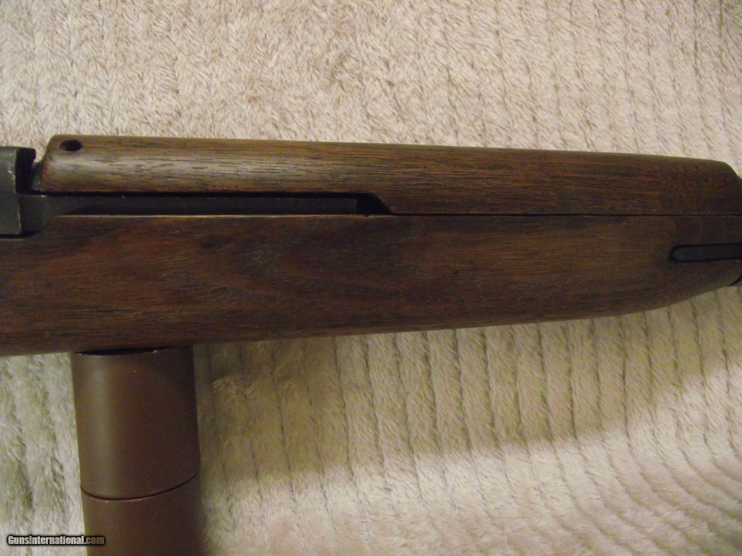 Description: The six digit serial number of this M1 Carbine is 467254 which dates manufacturing aound the early part of July 1943. Serial number 467254 puts this rifle into the early part of the 5th version of the 1st production block which was from serial number 400000 to 700000. I use Roger Larson's book "Comprehensive Guide - M1 Carbine" to verify the parts in the rifles I sell are correct based on manufacturer's serial number, production block, production date, and and production version on a consistant basis. This book's 829 pages are filled with M1 Carbine data and over 4,000 high quality photos that I use to validate the correct parts for the specific rifle. There are many other similar books that are great sources of information about the M1 Carbine, but I prefer one source to remain consistant in my assessment. The M1 Carbines in this particular production block and version did not have any anomalies or peculiarities that would make it somewhat unique except the use of the Oval Cut High Wood Stock. This rifle also has the receiver integrated spring tube instead of the dettachable tube which Inland used sporadically until serial number 610000. When determining which collectable M1 Carbine to buy make sure you evaluate each and every part for correct manufacturer and correct identification stamp. Most manufacturers use lateral support between all suppliers in order to keep the production line moving. This is why Roger Larson's book is so valuable and can make the difference between correct and 100% collectable. REMEMBER; with rare exception (detachable spring tube receiver being one) all of the M1 Carbine parts were interchangeable regardless of manufacturer. ALSO KNOW; virtually none of the 1944-1945 carbines were issued during WWII. About 95% of these were "held back" until the front bayonet lug barrel band, adjustable rear sight, and rotary safety were installed to bring them up to post-war standard issue M1 Carbine configuration. This why the early rifles are worth more than the post-war rifles. The serial number is the key because a post-war M1 Caarbine can be retro-fitted with the parts to make it look WWII issue. CHECK THE SERIAL NUMBER and CHECK THE BARREL BORE ! There's a reason why many sellers of M1 Carbines don't provide a picture of the bore. I won't bore you with identifying all of the parts in this text. I will email you as many pictures of the entire rifle and also pictures of the three data sheets for the rifle. Preferred payment method is valid personal check or USPS Money Order. This rifle will be sold and shipped in compliance with all state and federal firearms regulations. This rifle qualifies for Curio and Relic status. Although this rifle is fully functional there is no express or implied warranty that accompanies. Buyer is to pay actual shipping and handling cost to an approved FFL within the contiguous 48 states. Shipping insurance is optional with cost being buyers responsibility. Thank you for your interest. SOLD Curio/Relic: Yes Rifle Caliber: .30 Carbine Manufacturer: Inland Model: M1 Carbine Serial Number: 467254 Barrel Length: 18 Bore: 4 Lands and Riflings Ejectors: Type 1 - 3 faceted Condition: Very Good Metal Condition: Very Good Wood Condition: Very Good Bore Condition: Very Good Barrel Type: Inland Division General Motors 6-43 Action: Semi- Automatic Stock: Dark Walnut HIGH WOOD Weight: 5.6 lbs. Sights: Dual Aperture Fixed Rear Manufacture Date: Approx EArly July 19 Extras: Quality Reproduction Olive Drab Sling, Original USGI Oiler Case: High Quality Reproduction Zippered Canvas Carry Case. ction Zippered Carry Case. Item Location: Texas |