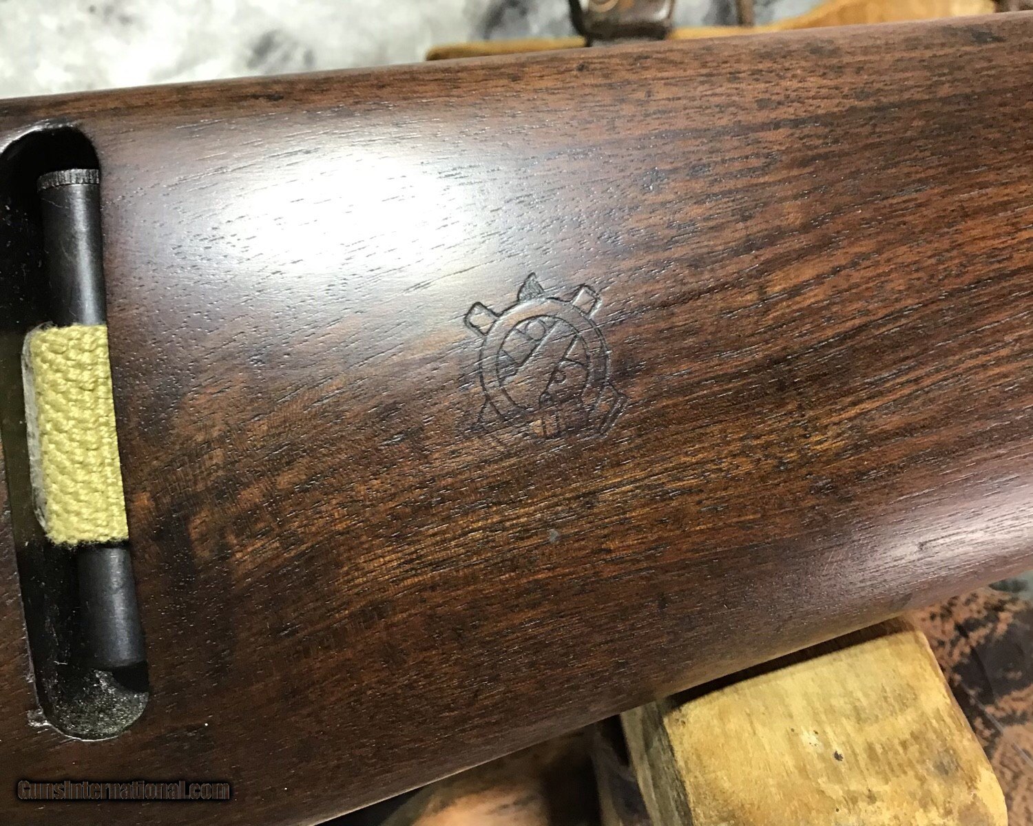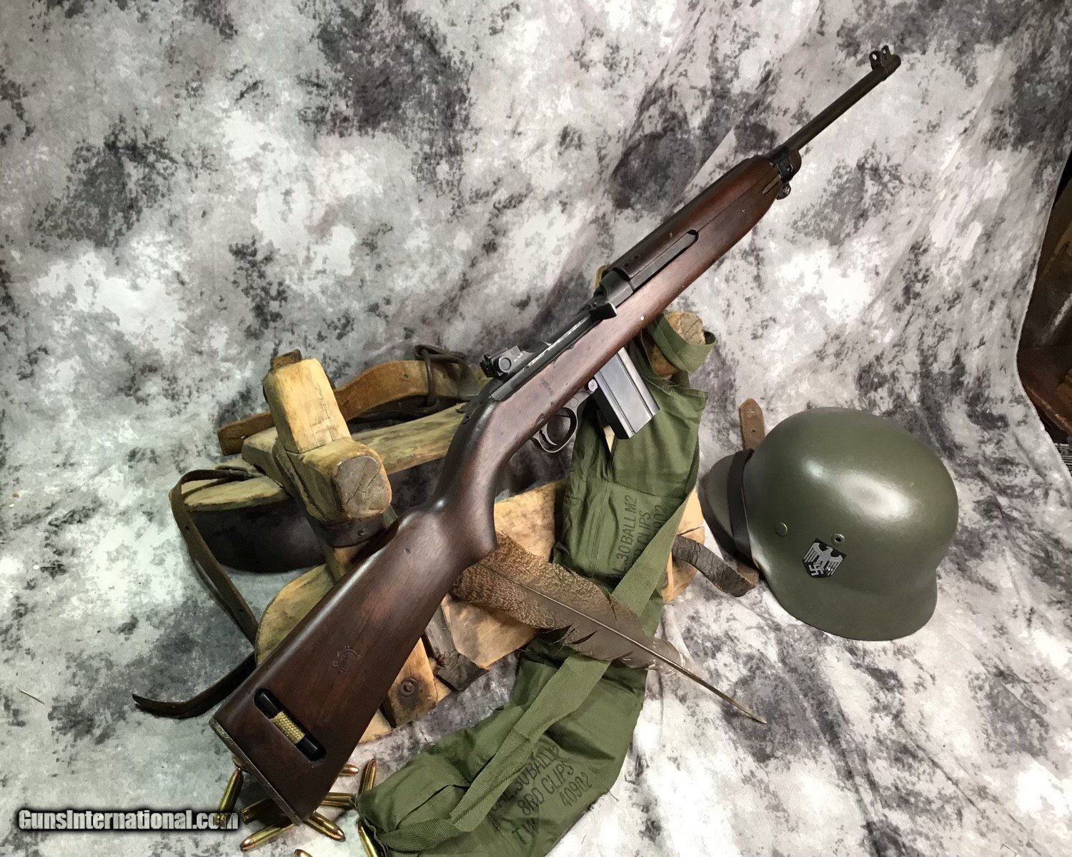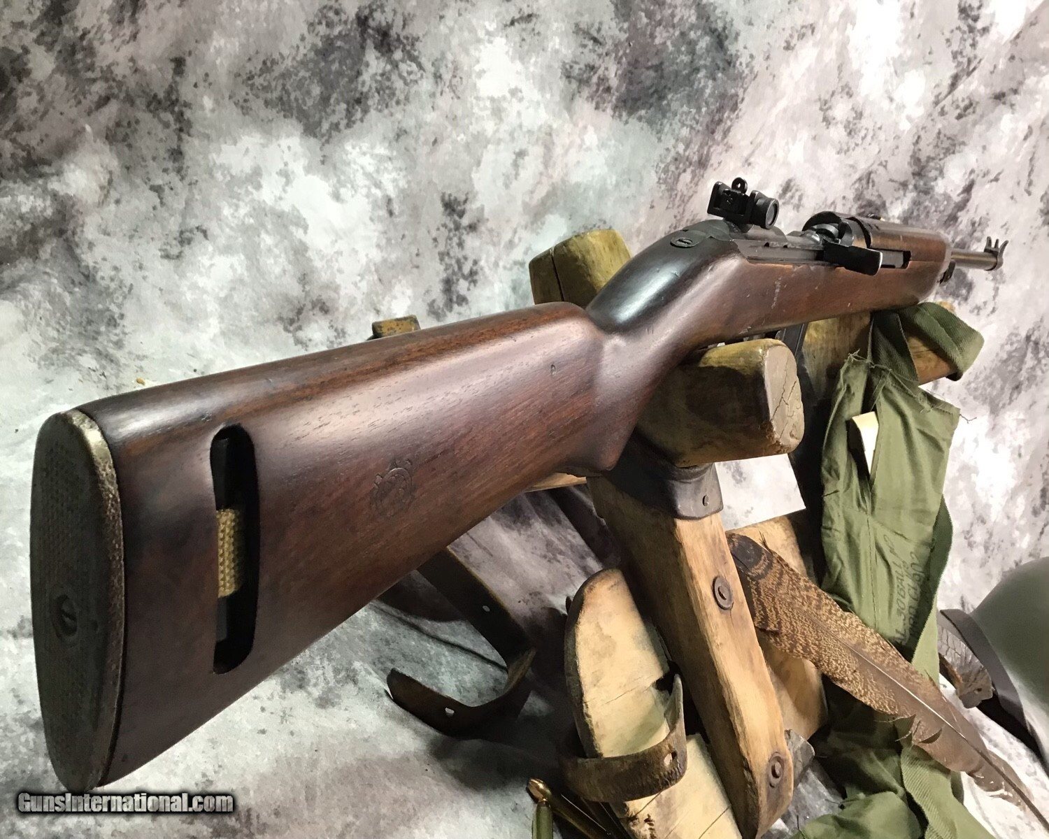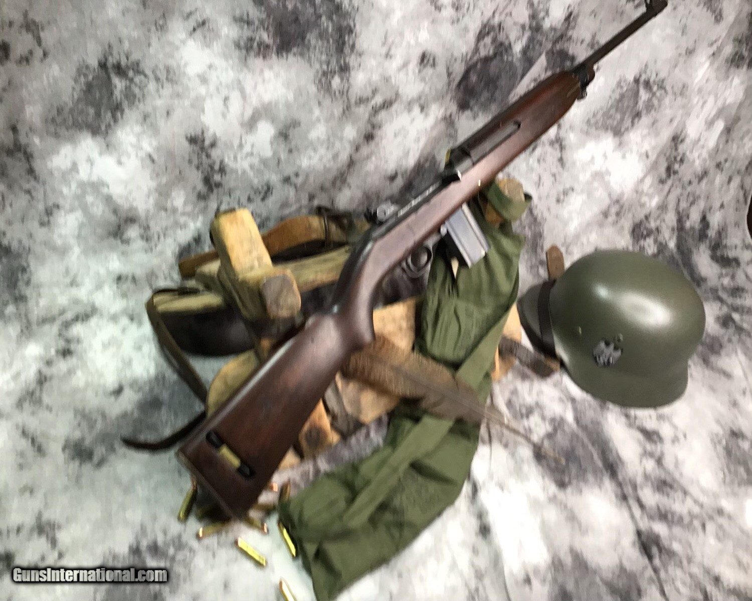 Description: 1944 Inland M1 Carbine in very good condition. Manufactured Spring of 1944. Barrel dated 44. Original battle worn American Black Walnut stock with Circle P near pistol grip and crossed Cannons on Right side of stock. Period sling and oiler. Several Army Armorers Brass pins in stock as done in field repairs, well done and adds to the battle look. Chambered in .30 Carbine with one matching Inland magazine. Rifles mechanics are all good with good bore. Early push button safety and no bayonet lug on barrel .Stock has great dark patina, Metal retains most of original finish. Extra magazines available at additional cost. Add 3% if paying with credit card, Shipping to your FFL for $40. SOLD Curio/Relic: Yes Rifle Caliber: .30 Carbine Manufacturer: Inland Model: M1 Carbine Serial Number: 5052673 Condition: Very good Metal Condition: Very good Wood Condition: Very good Bore Condition: Very good Action: Semi-auto Stock: Wood |