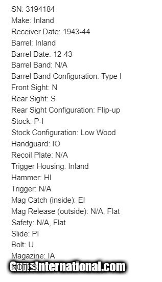 Description: This is a nice example of a Inland M1A1 Paratrooper Carbine from 1943-44. It is in a Type I configuration, but the serial number on the receiver puts it in the Type II range. All period-correct parts. A detailed parts list with markings is included in the photos. Comes with a proper canvas sling and one magazine. There is very little actual finish loss on the metal parts, but there is noticeable spotty surface oxidation along the barrel. Very nice wood furniture with a few bruises and tiny scratches. The bore is shiny with strong rifling, but there is some very light pin-pricking around the muzzle end. The spring on the butt plate is a little worn. SOLD Curio/Relic: Yes Rifle Caliber: .30 Carbine |