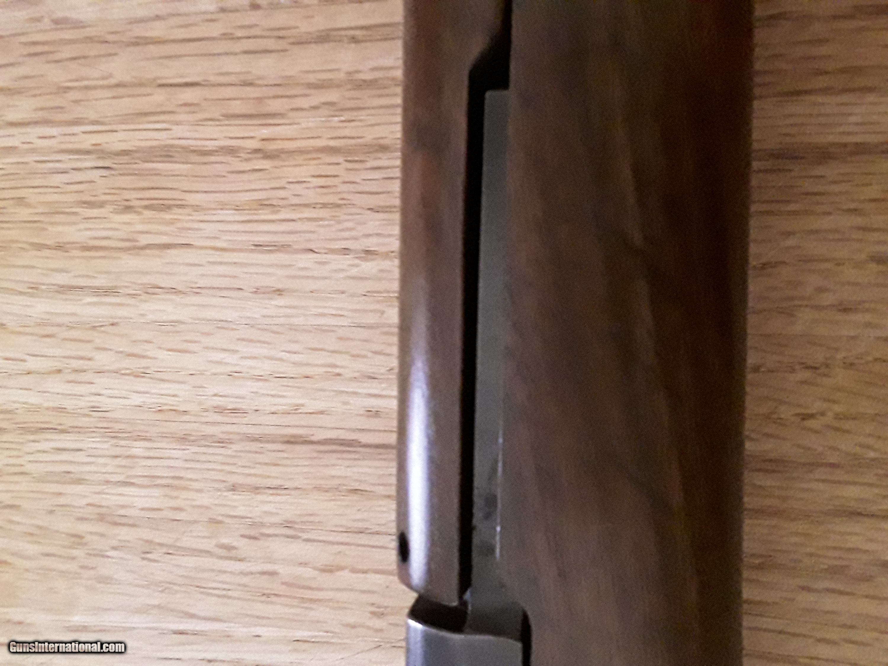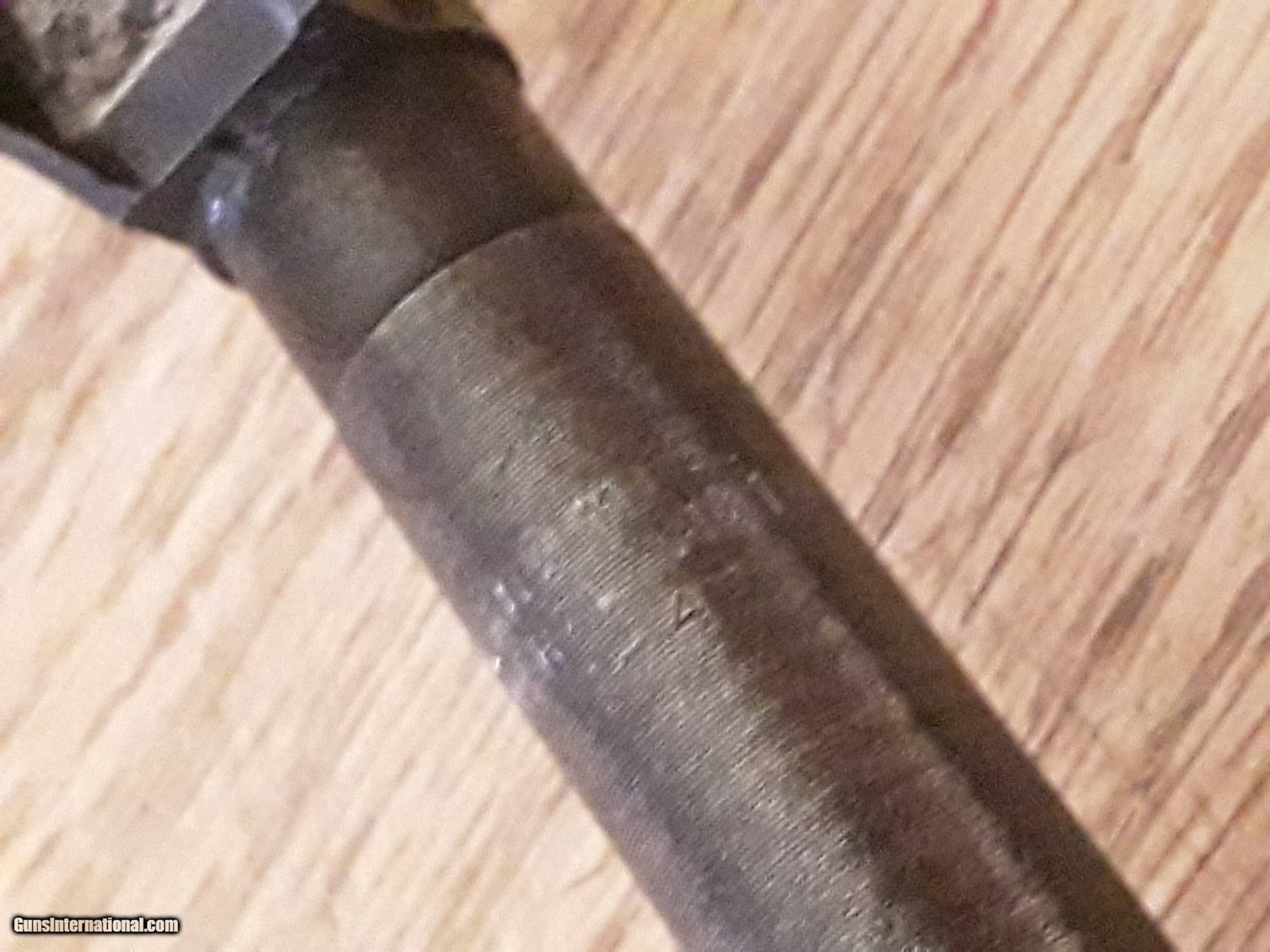 Description: This is a Jan/Feb. 1943 Inland with a 1-43 barrel. The rifle is in good condition with about 50 to 60 % original finish. The bore is in excellent condition. The markings are as follows: Stock, I cut high wood that has been sanded with IO and bomb in the sling well. No crossed cannon on the right side. The handguard is deep groove 2 rivet and IO marked. The butt plate is early checkered. The recoil plare is type 2 unmarked. The narrow front band has three welds and a narrow swivel that has some pitting. The op slide type two semi circle and PI marked. The front sight is N marked. The flat bolt is AI marked with Inland marked extractor and firing pin. The rear flip sight is unmarked except for a S on the left side. The type two Inland trigger housing has a checkered push button safety with a beveled edge. The type two dog leg hammer is HI marked. The mag catch is EI marked. The 15 round mag is type one and AI marked. The price includes shipping. Certified or cashiers check only. For questions, 228-216-4102. Thanks, Ronny SOLD Curio/Relic: Yes Manufacturer: INLAND MARINE Model: M1 carbine Serial Number: 199196 Caliber Info: 30 carbine Bore: Excellent Condition: Good plus Metal Condition: 50 to 60 % original finish with some pitting Wood Condition: Very good but sanded |