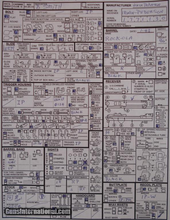 PIC'D IS AN ALL CORRECT (NOT RESTORED) M1 CARBINE MANUFACTURED BY THE RAREST MAKER OF WW2, IRWIN PEDERSEN. THIS RIFLE WAS PRODUCED IN EARLY 1943 (BARREL DATE 1-43) AND REMAINED PROPERTY OF U.S. GOVERNMENT AND WAS LENDED OUT AFTER WW2, RECEIVER IS MARKED "BAVARIAN RURAL POLICE" AND WAS SOLD THRU THE "CMP" (CIVILIAN MARKSMANSHIP PROGRAM) IN APRIL OF 2010. COPY OF CMP SALE BILL WILL GO TO BUYER. ALSO PICTURED IS A DETAILED "CARBINE DATA SHEET" RECORDED BY A MEMBER OF THE CARBINE CLUB INDICATING THE MANUFACTURE OF THE CORRECT PARTS ON THIS RIFLE, ALL HAVE MATCHING COLOR AND ARE PERIOD AND MANUFACTURE CORRECT FOR THIS CARBINE. THIS IS AN EARLY IRWIN IN THAT IT SHOULD AND DOES HAVE ALL I.P PARTS, MOST I.P'S WERE FINISHED AFTER SAGINAW S'G' TOOK OVER AND HAVE A MIX OF PARTS. HAS CORRECT IR-IP WALNUT "I" CUT HIGH WOOD STOCK AND IP HANDGUARDES WITH CORRECT WW2 "K-IP" BLUED 15 RD MAGAZINE WHERE PERMITTED AND KHAKI "HORSE SHOE" WW2 SLING AND OILER..THIS IS A RARE DOCUMENTED PIECE OF U.S. HISTORY.