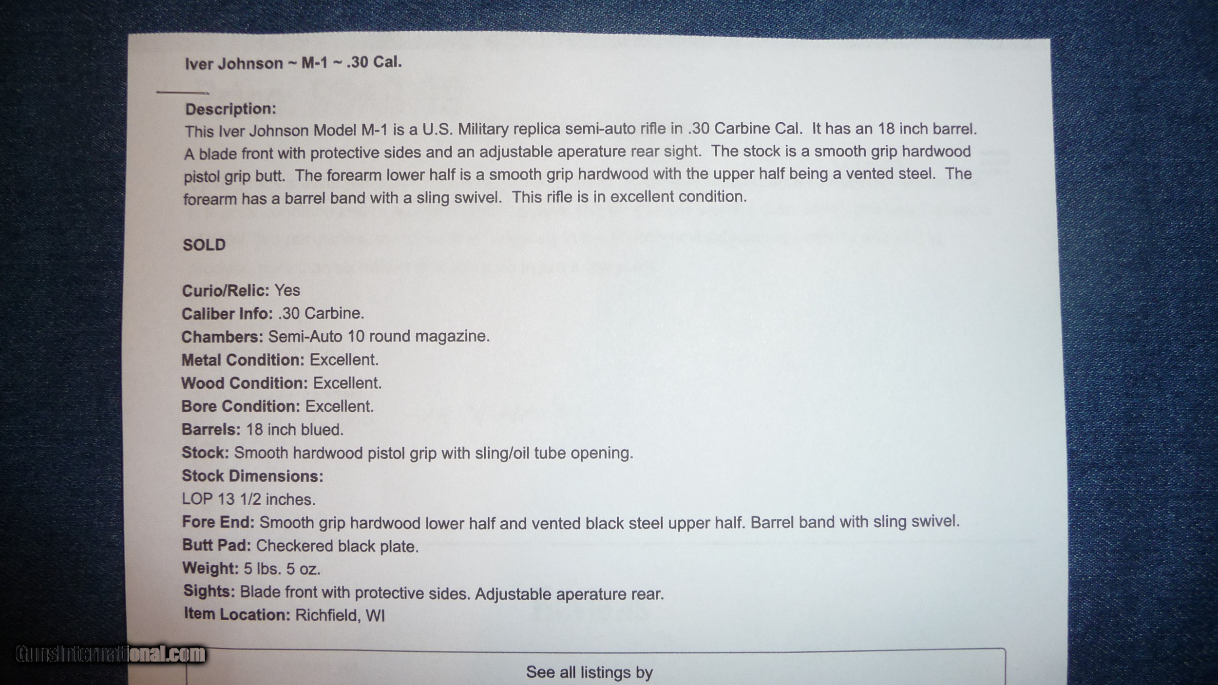 Description: Iver Johnson .30 Caliber M-1 Carbine in like new condition. Serial #AA13285 Dates this excellent M-1 Carbine to 1979. See pictures for Technical Specifications. Semi-automatic .30 Carbine bullet, 18 inch barrel, Comes with a Kolpin case and a strap. Sale Pending. SOLD Rifle Caliber: .30 Carbine Manufacturer: Iver Johnson Model: M-1 Carbine Serial Number: AA13285 Barrel Length: 18 Inch Condition: Like New Metal Condition: Like New Wood Condition: very good Bore Condition: Like New |