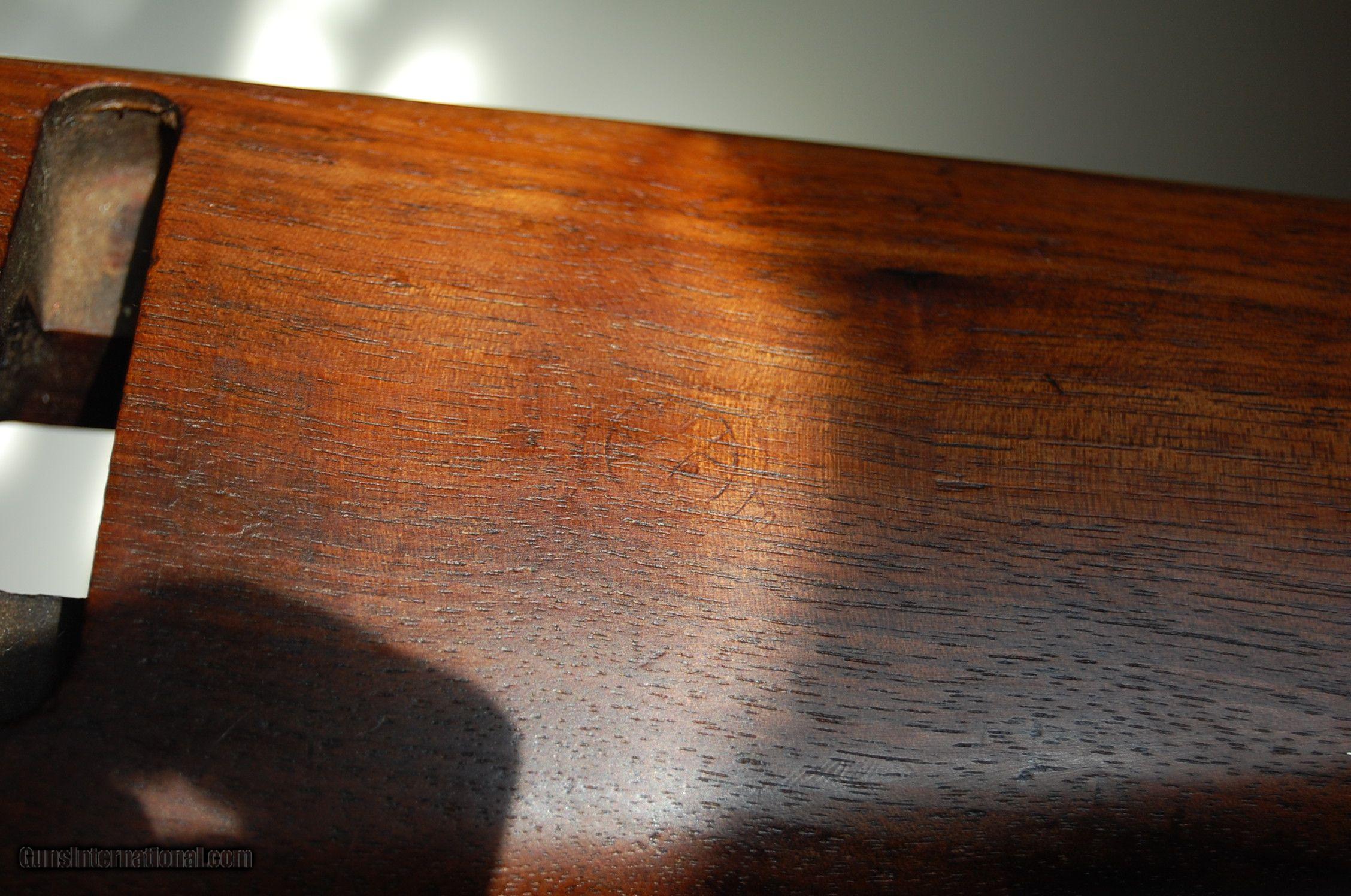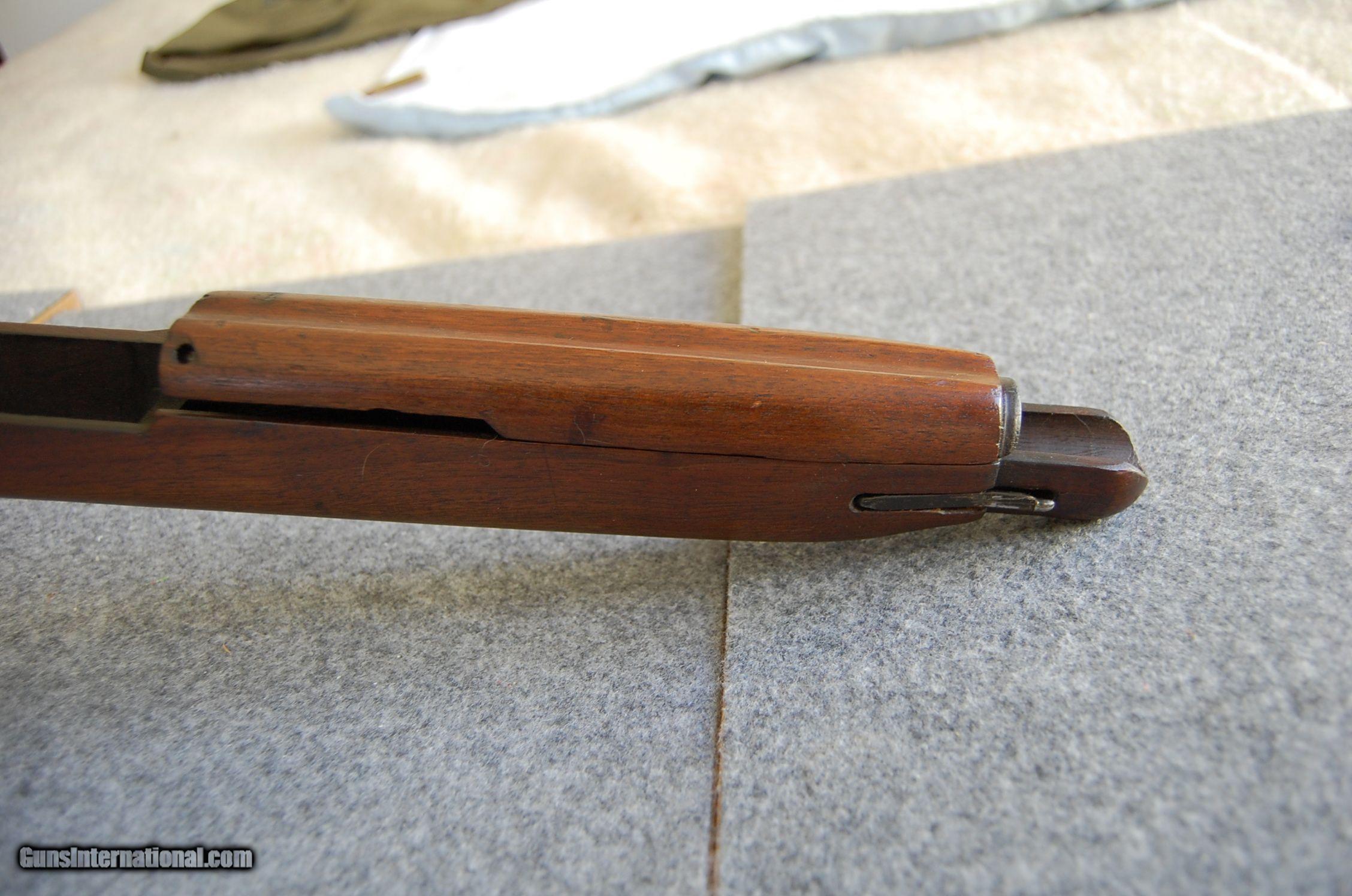 Description: M1 Carbine Inland Stock Set Original finish high wood oval sling cutout Has IO on left side of slingwell and Cartouche on right side of stock Has original buttplate and DI marked recoil plate Two rivet handguard is marked IO inside Very nice stock set, all original. Circle P proof mark on bottom of pistol grip SOLD Curio/Relic: Yes |