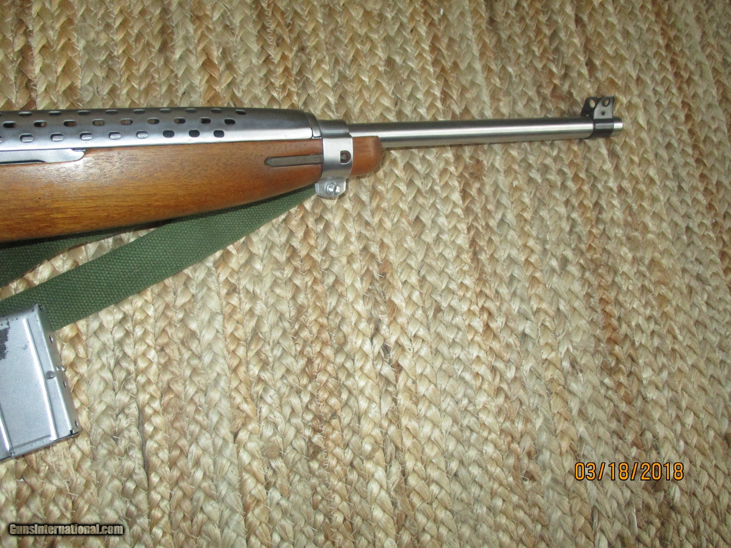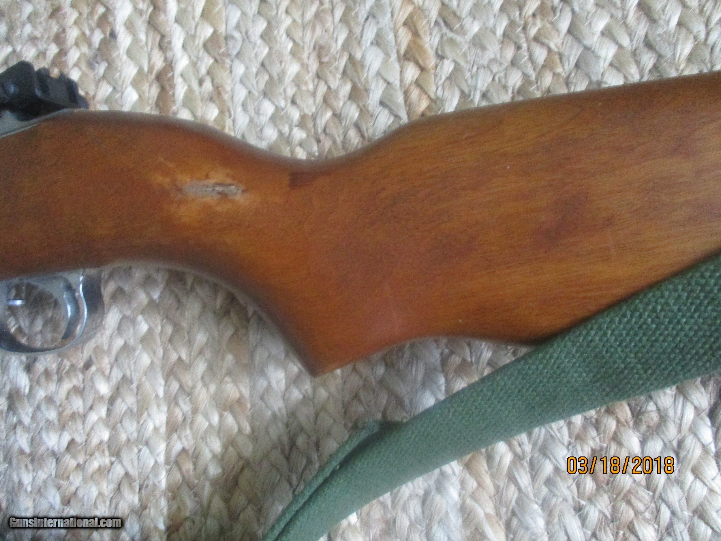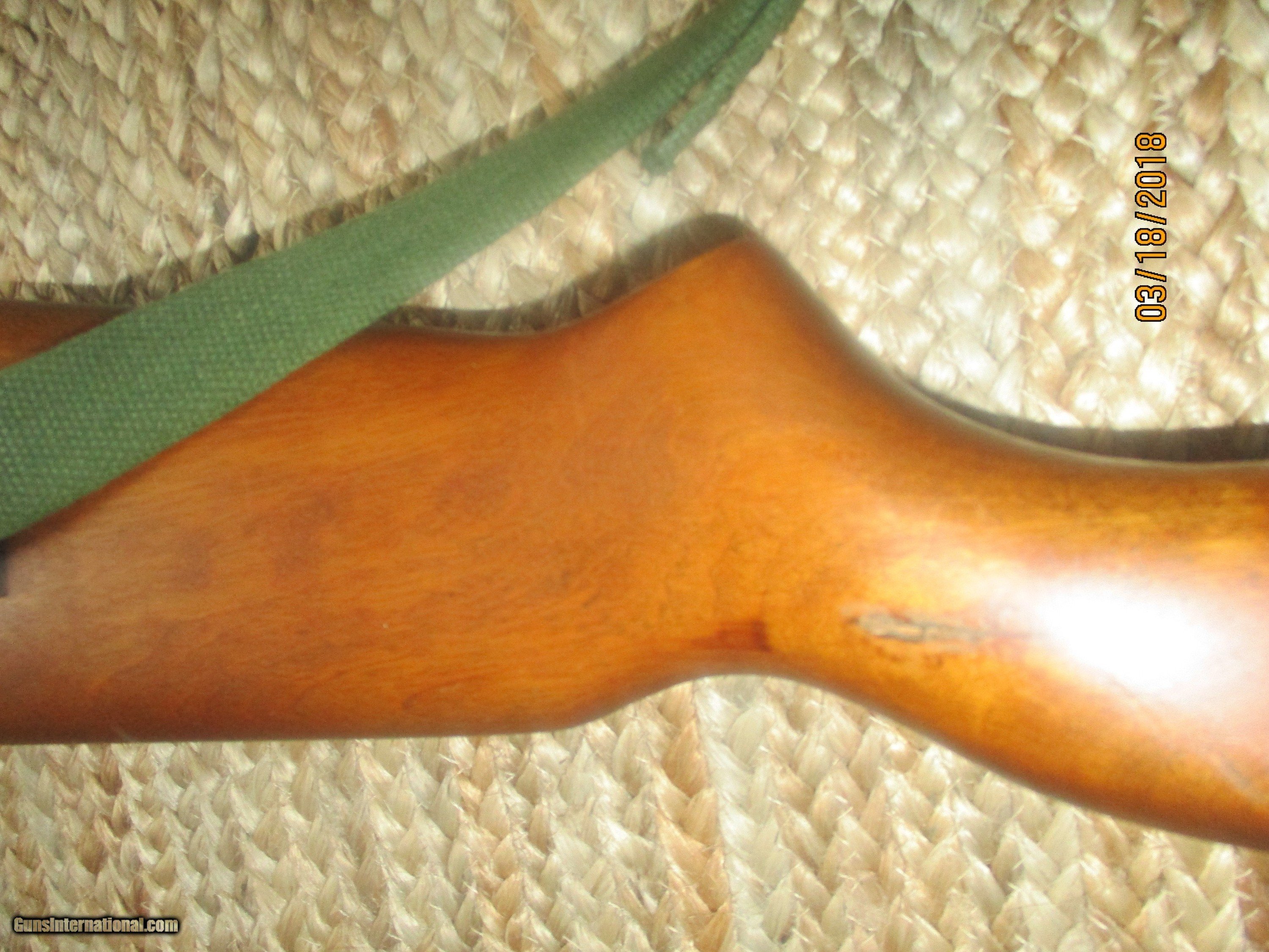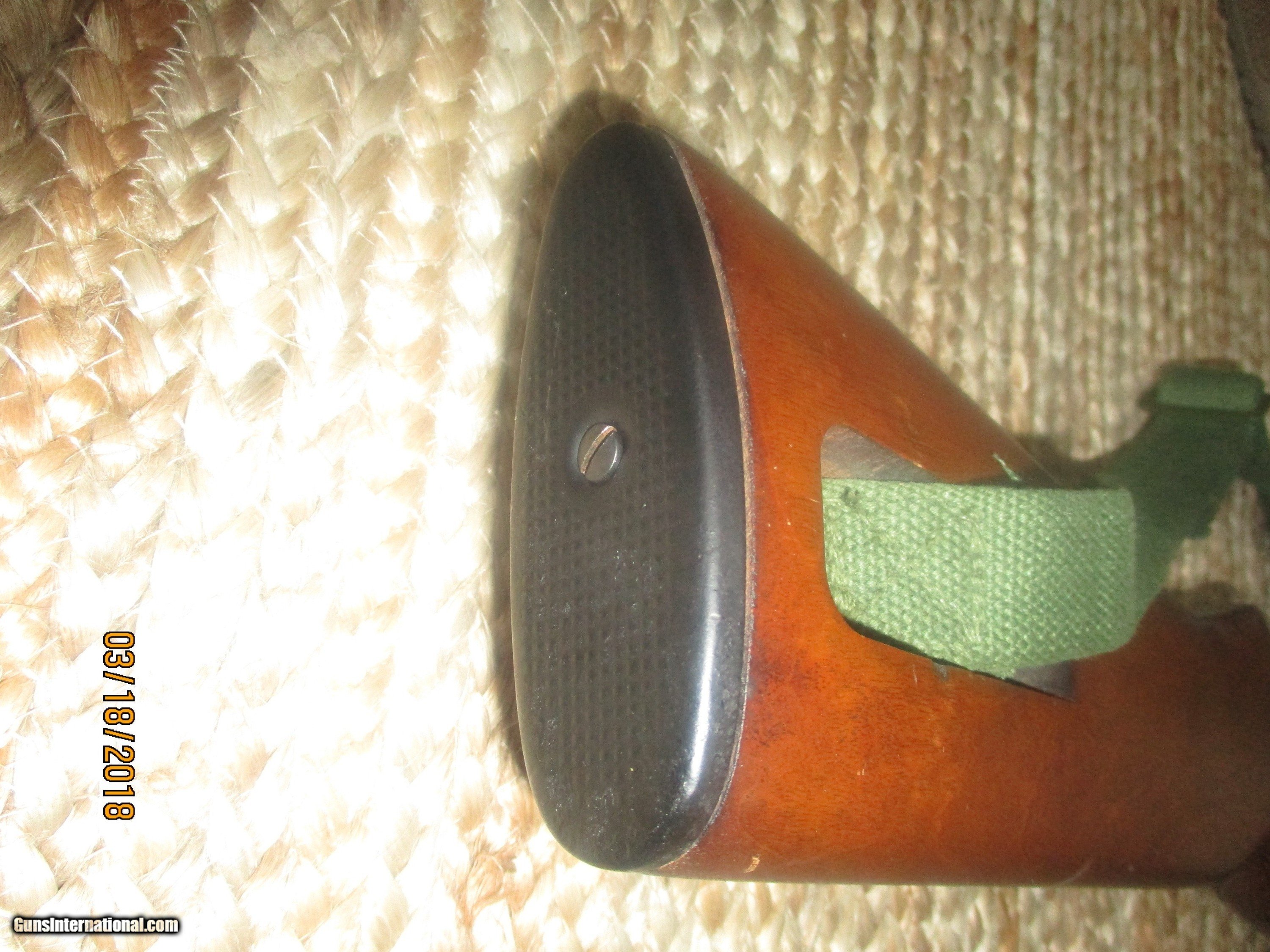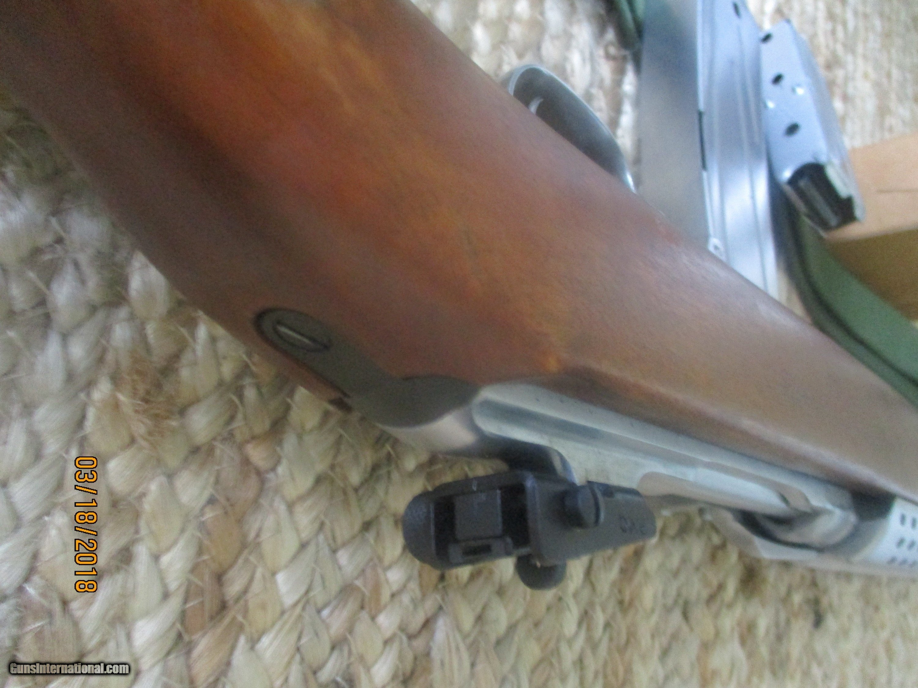 Description: 18" bbl, vented bbl. schroud, black steel band center blade front sight, adjustable peep ramp rear, hardwood military Carbine style stock(small blemish pictured) with army green sling, 7rd. also 30 rd. mags matched to metal,50 rd, box military ammo included, excellent 98% new OA with slight stock scratch, parts easily available! SOLD |