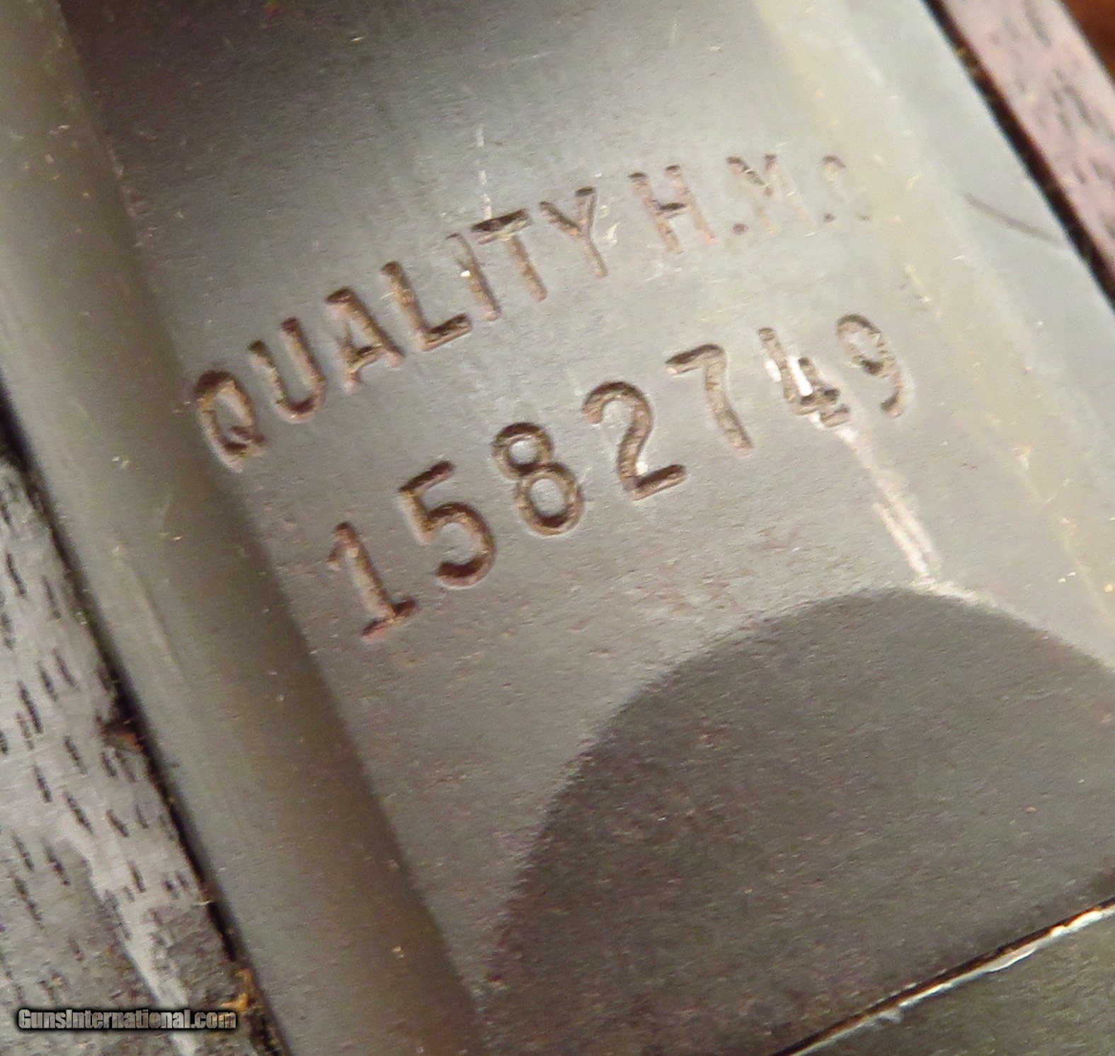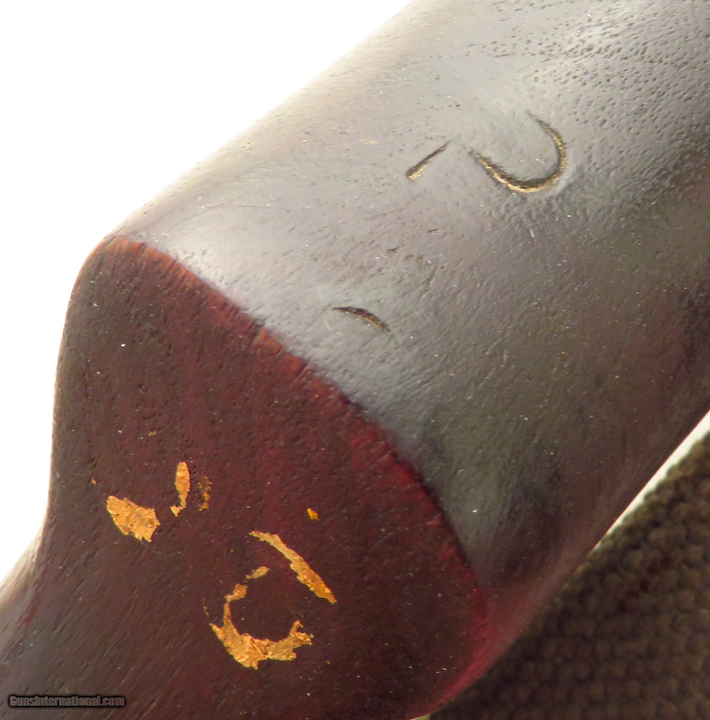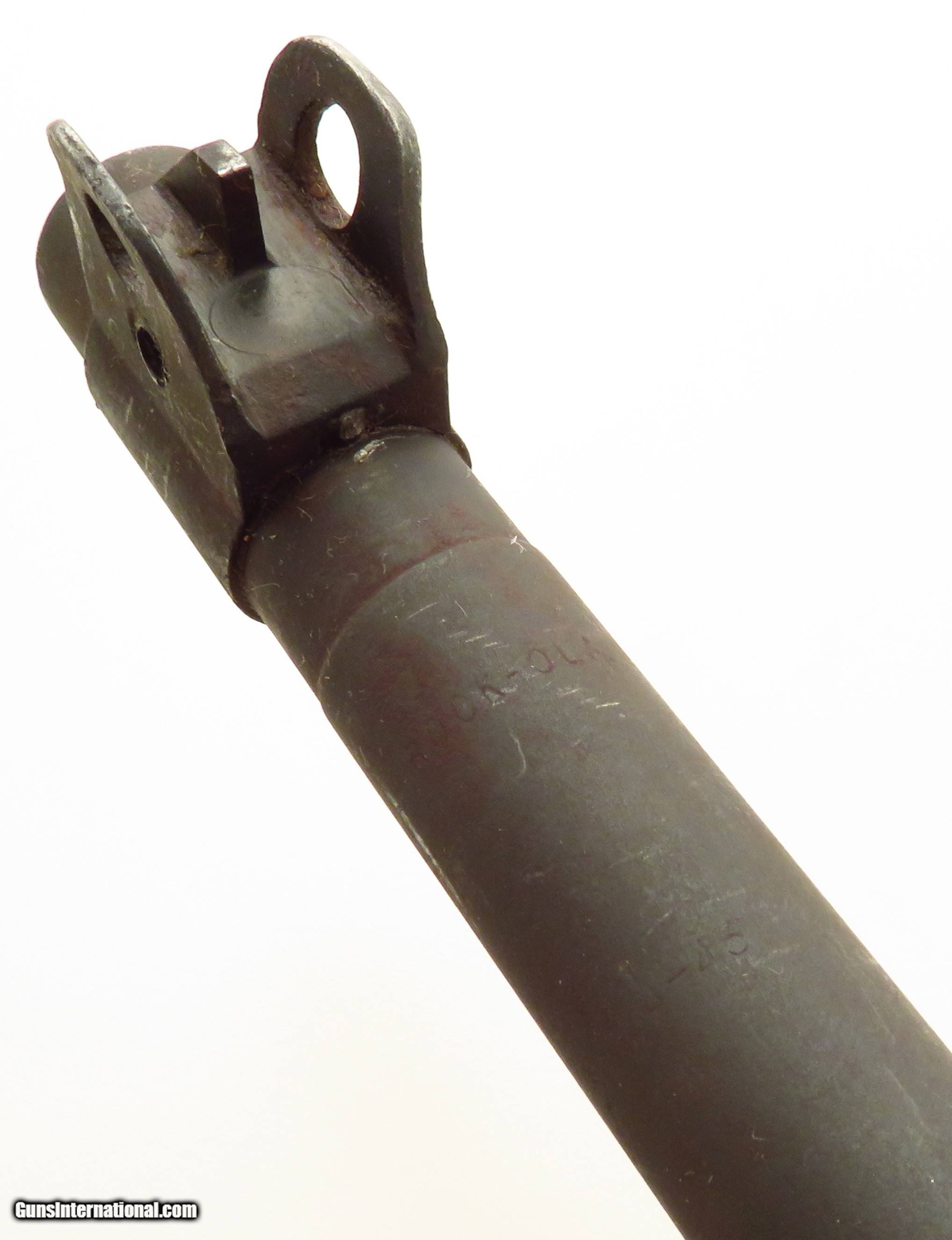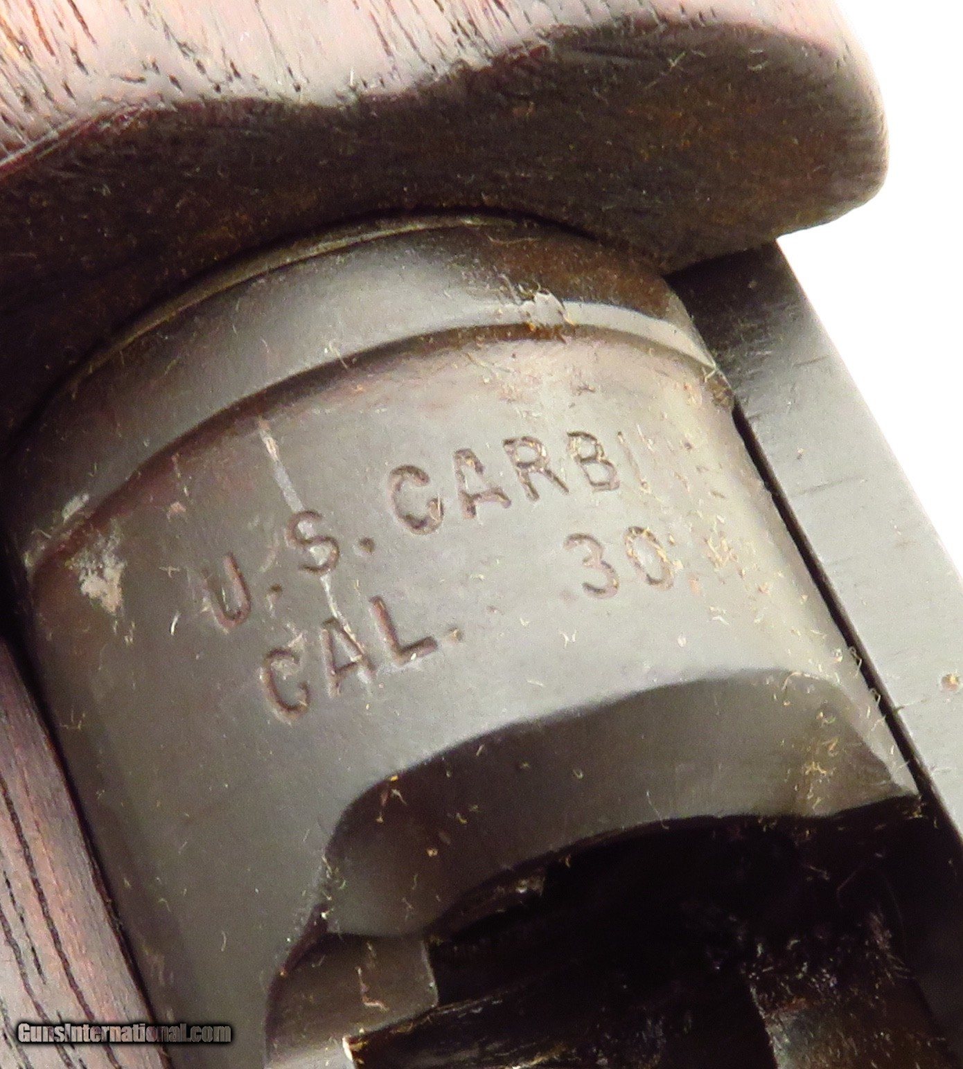 Description: Quality Hardware M1 Carbine .30 Carbine. With a Rock-Ola barrel dated 1943 (appears to be 4/43, month is faint), serial 1582749 has double-rivet guard, rocker rear aperture sight and a sling. MARKINGS: "P" on barrel, "AAX" forward of grip left, 10" in sling slot, stock cartouche, "P" at grip and a partial rack number. A canvas bore cover (Dave Mfg., 1944) is included. No magazine. CONDITION: The bore (four lands) is good with areas of mild roughness. Metal finish is approximately 50 percent and wood finish is approximately 60 percent. Rear sight is loose. The price is firm and layaway is available. $2,250 plus shipping. SOLD Curio/Relic: Yes Rifle Caliber: .30 Carbine |