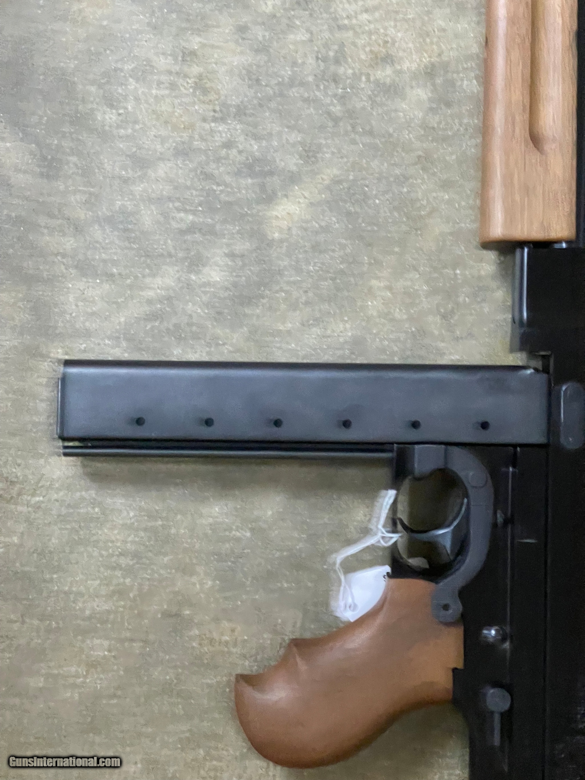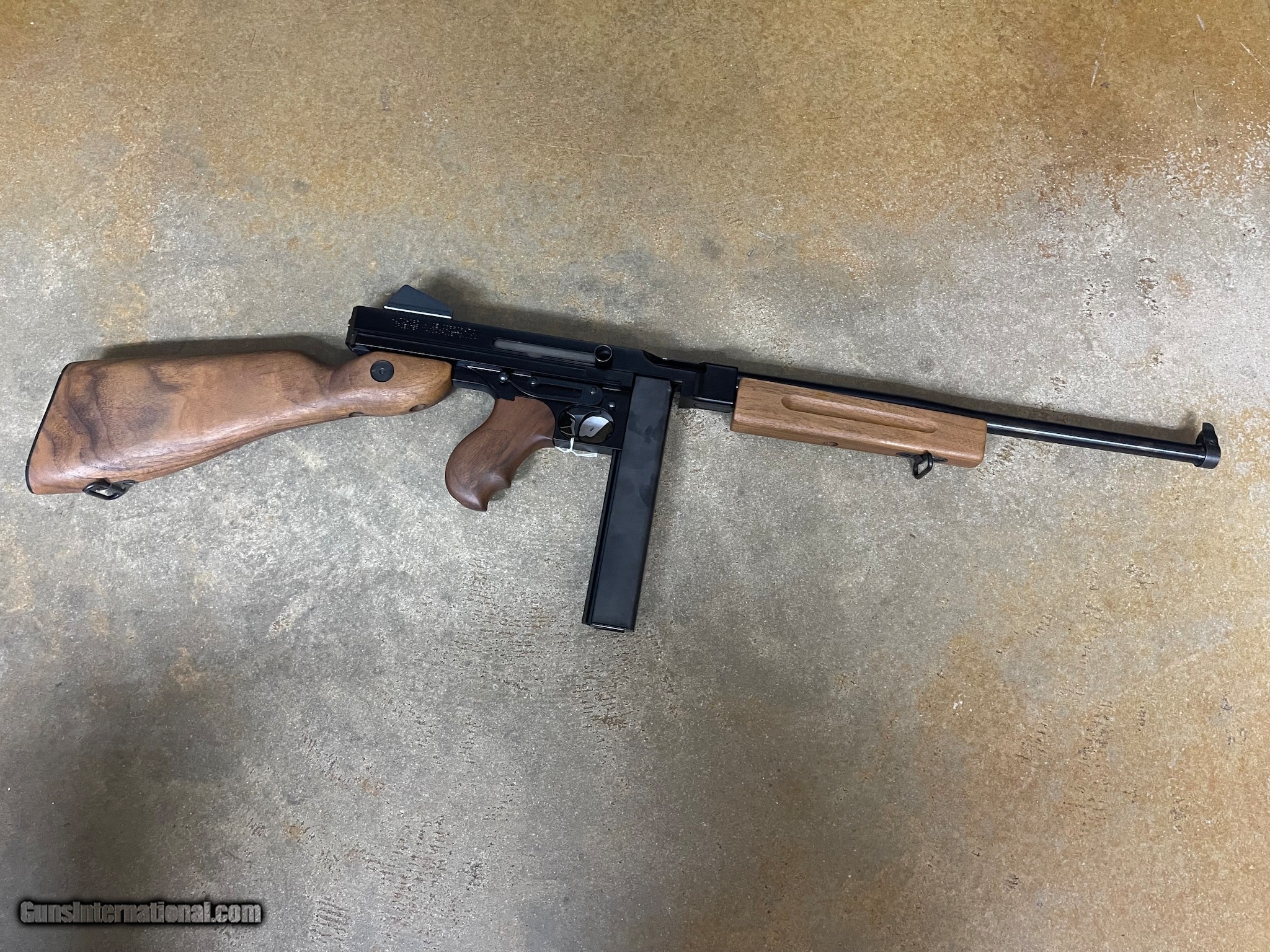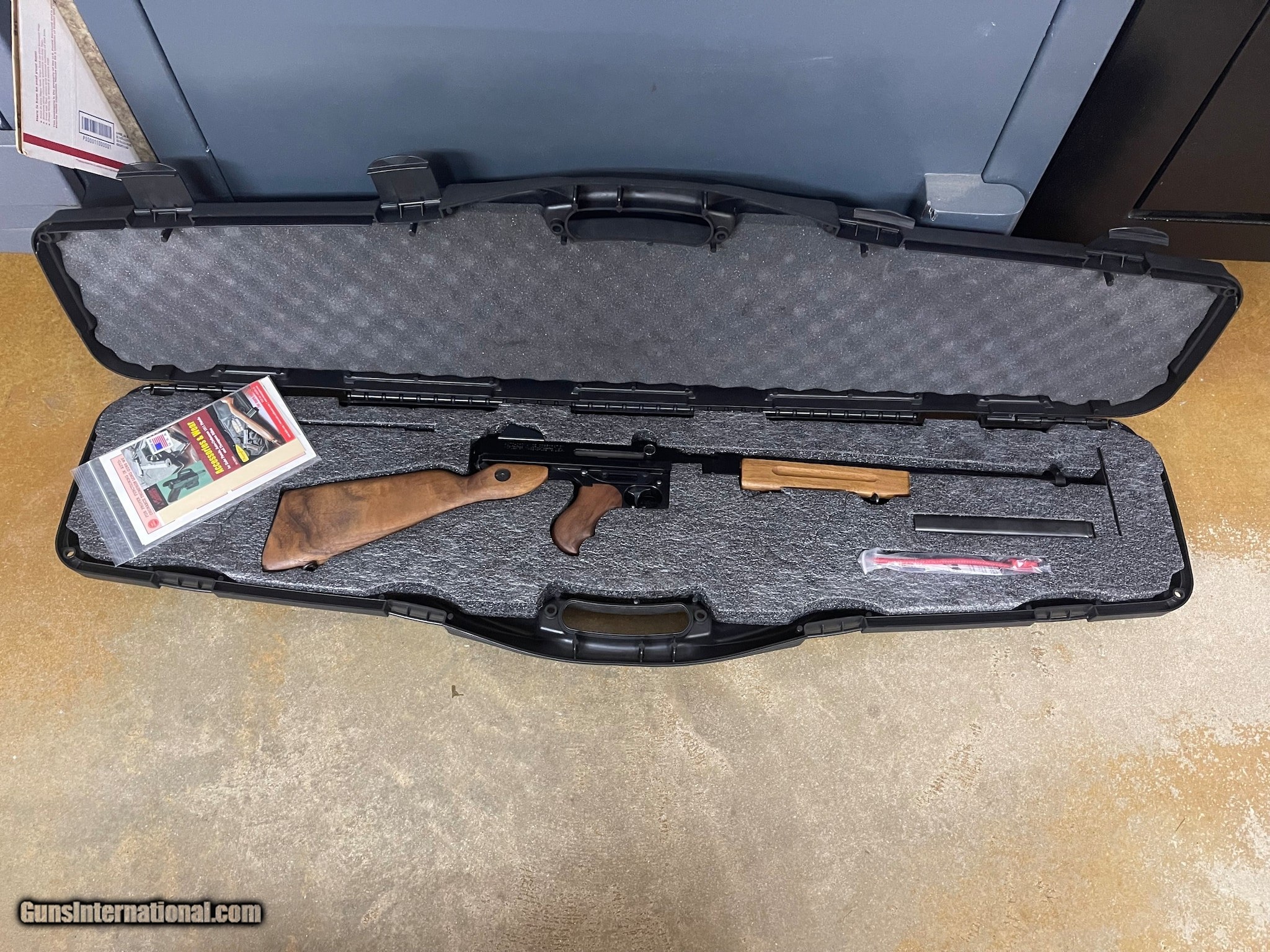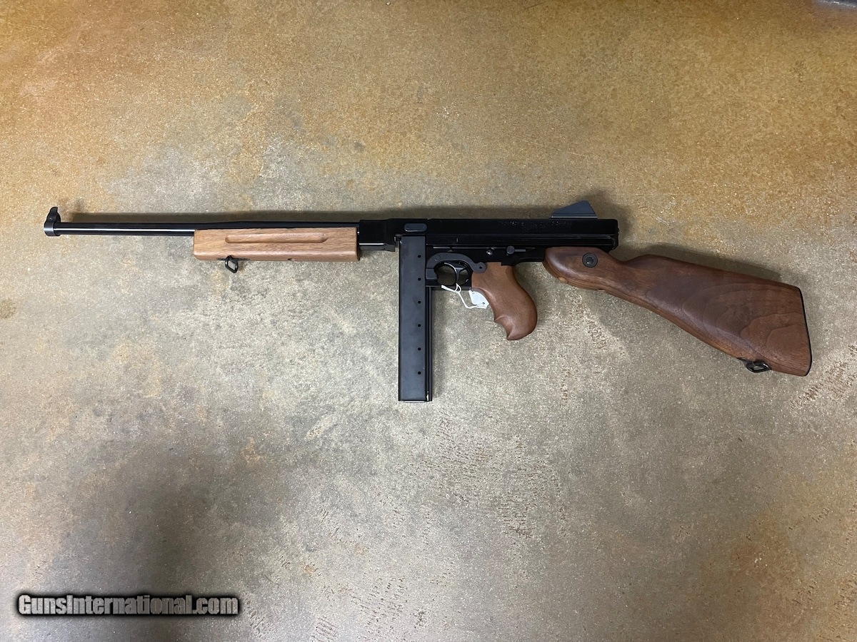 Description: Guns Listing ID: 535932 The Auto-Ordnance Thompson M1 semi auto carbine is proudly made and produced in Worcester, MA. These faithful replicas are semi auto versions of the world‚‚s first and most famous military rifle. The Thompson M1 was used victoriously in many battles around the world. These replicas provide a level of realism and authenticity not found anywhere else, the receivers are milled from solid steel and are paired with genuine American Walnut furniture for a stunning combination. The M1 comes with a 30 round stick magazine. Specifications and Features: Auto-Ordnance Thompson M1 Semi Auto Carbine TM1 .45 ACP 16.5\" Smooth barrel Blade front sight Fixed battle rear sight Walnut fixed buttstock (non detachable) Walnut forend One 30 round stick magazine Overall length 38\" Overall weight 11.5 lbs Blued metal finish Made in the USA, in Worcester, MA THIS FIREARM WILL BE SHIPPED WITH HARD CASE, FIREARM, ONE MAGAZINE, AND MANUAL. G-970589- SOLD Manufacturer: THOMPSON Model: M1 CARBINE .45M1 Caliber Info: 45 ACP Condition: Used - Non-Certified Barrels: 16.5 BARREL Finish: BLUED |