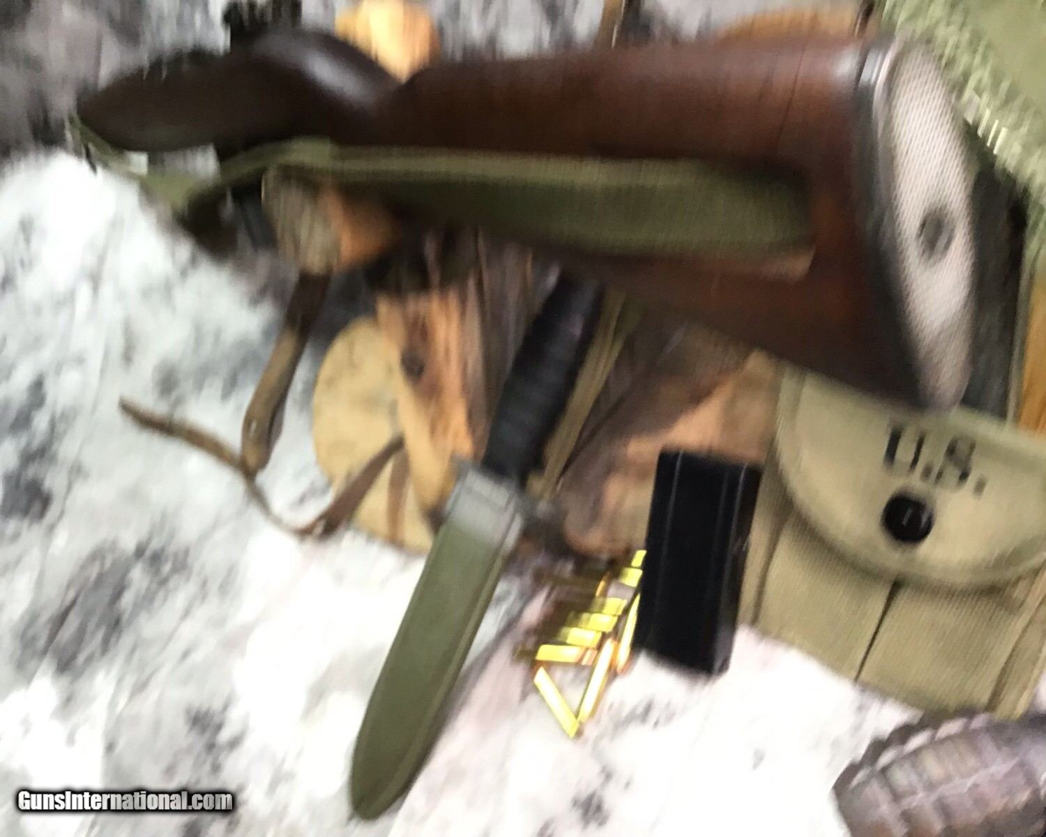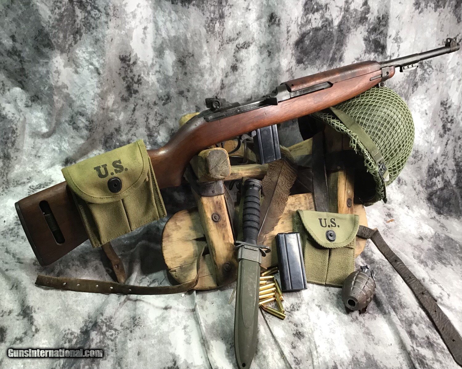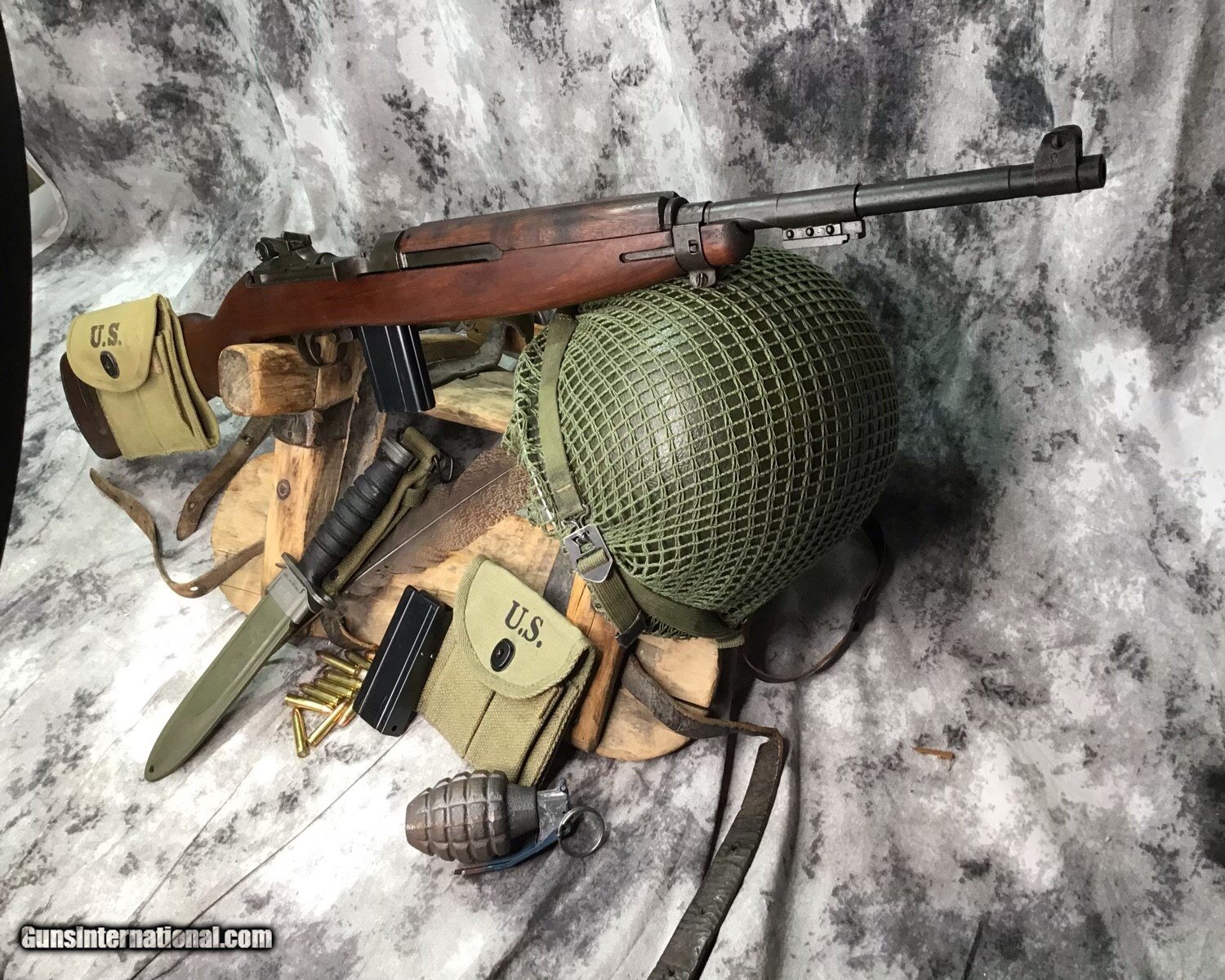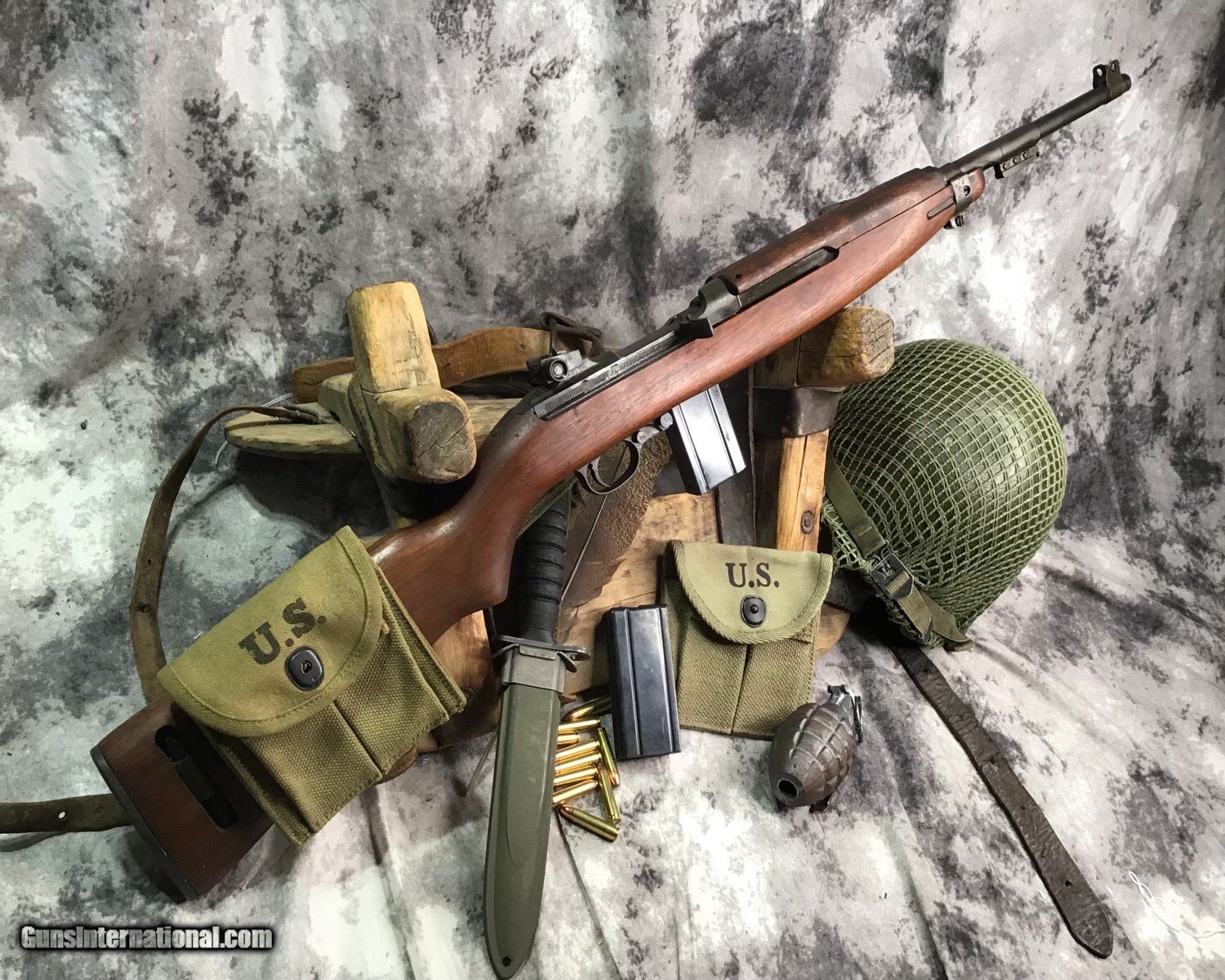 Description: WWII Winchester M1 Carbine, 1st Block Production approx. May 1943. SN:1226741. Winchester Proof marked barrel found 6.5 inches from the muzzle, Milled Type I unmarked sight with typical Winchester thumbnail cut behind the sight blade, two dismount notches on receiver, type II recoil plate marked "W", barrel band marked "C", unmarked small sling swivel, push button safety marked "EW", Type III magazine catch marked "W", Oval cut low wood stock with unmarked sling well SA marked on inside left front, unmarked oiler, olive drab sling with early C-tip and early flat buckle, early Winchester splatter butt plate, Type II handgaurd W/2 rivets marked "PU", Type II flat bolt, rear sight marked "SA". Overall a very nice Winchester M1 carbine ready to enjoy shooting a piece of WWII US history at the range or be a safe Queen. I'm no expert on carbines so please inspect the pictures and ask any questions. I'm a one man store and I answer the phone, Jerry. ) Interesting trades considered Add 3% if paying with credit card. God Bless America from a proud American, and a Viet Nam Vet , thankful for our freedoms.. paid for by the Blood ,Sweat and Tears of our brave men and women in uniform. Ten Below Firearms is a Veteran owned and operated business. We specialize in out of production models of high quality firearms. We love to ship! If you are out of state or can't make it to our store, just give us a call! Handguns normally ship for $30 and Long guns for $40 to $55 for extra length long guns. That's 2-3 day USPS Priority shipping, Delivery conformation and with tracking number. Optional Postal insurance is additional $1.50 per $100 and highly recommended. SOLD Curio/Relic: Yes Rifle Caliber: .30 Carbine Manufacturer: Winchester Model: M1 Carbine Serial Number: 1226741 Condition: Very good Metal Condition: Very good Wood Condition: Very good Bore Condition: Very good Action: Semi-auto Stock: Wood Finish: Parkerized Manufacture Date: 1943 |