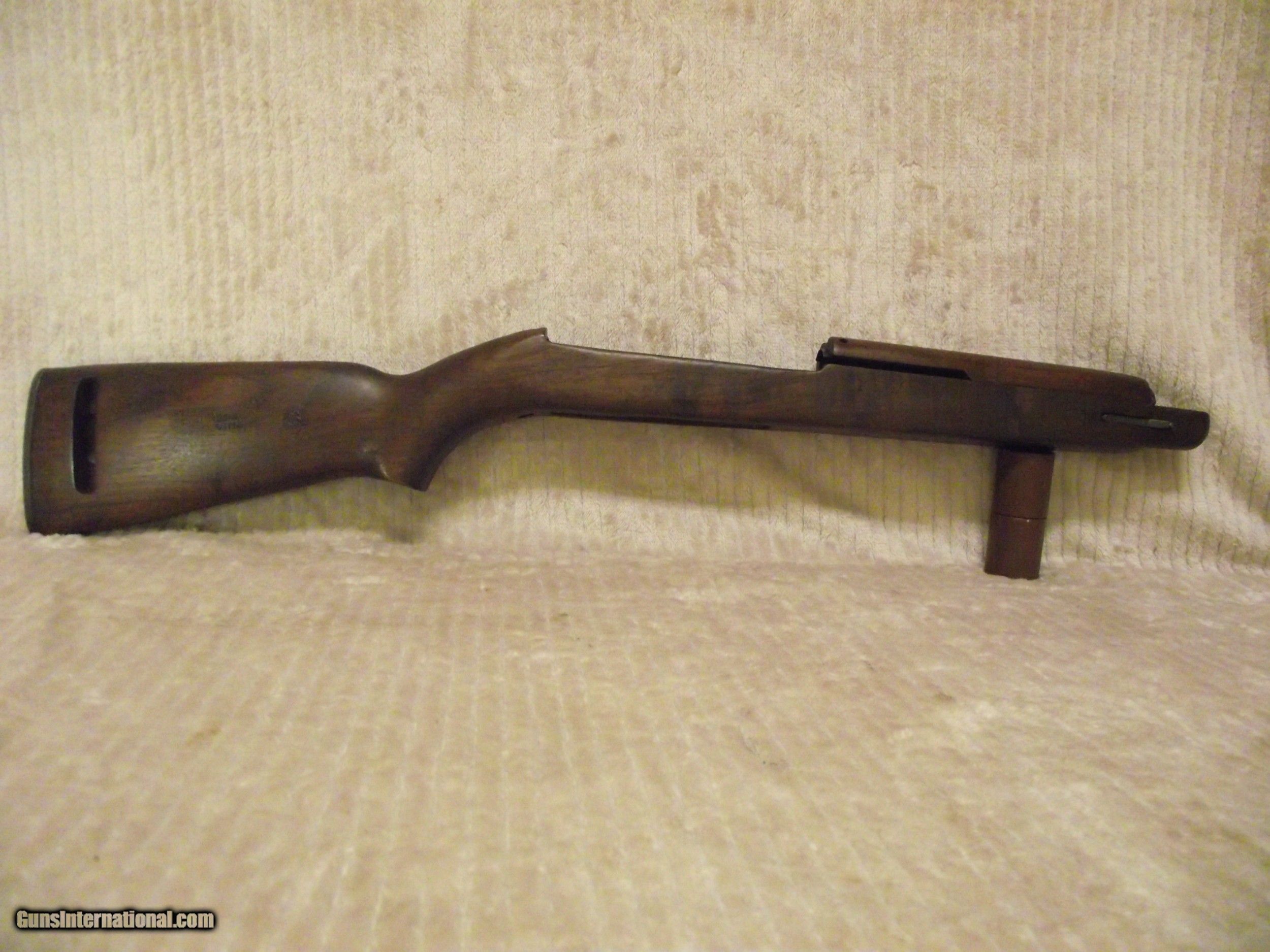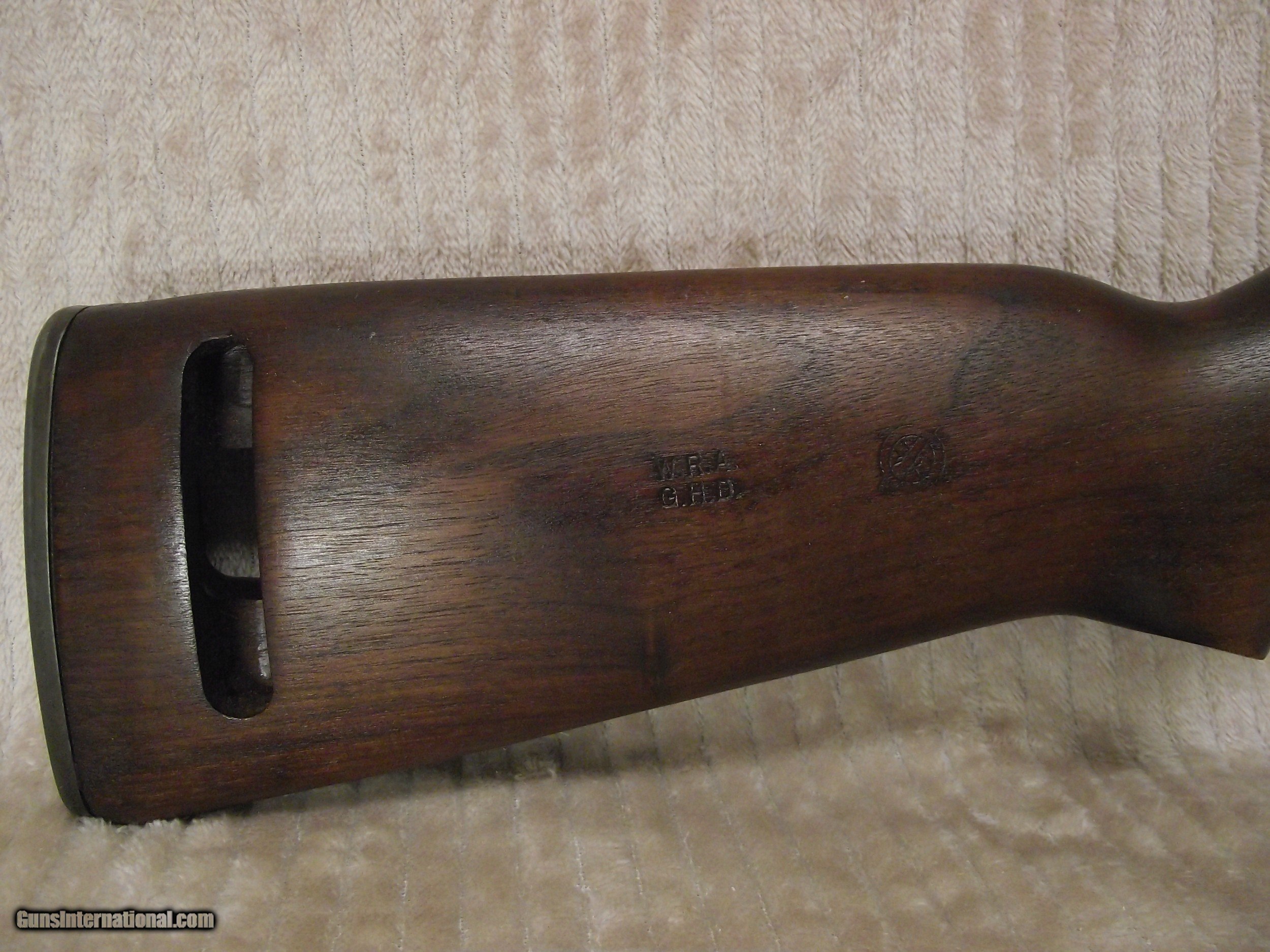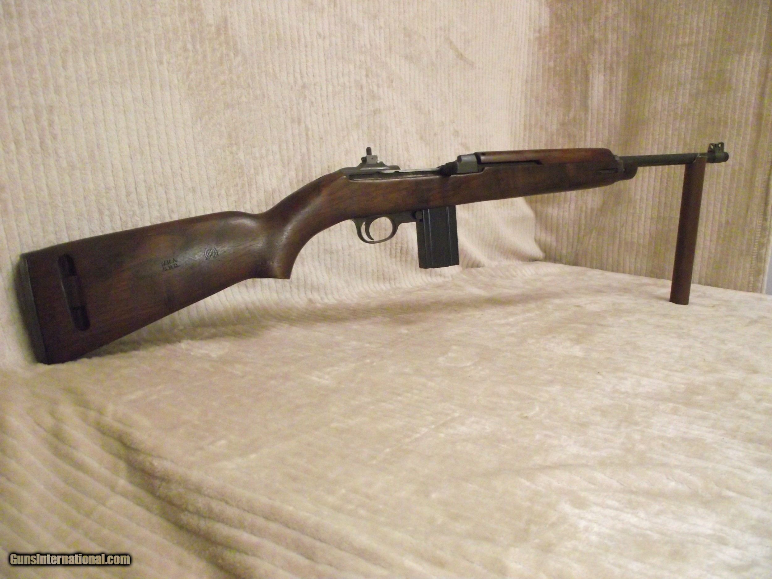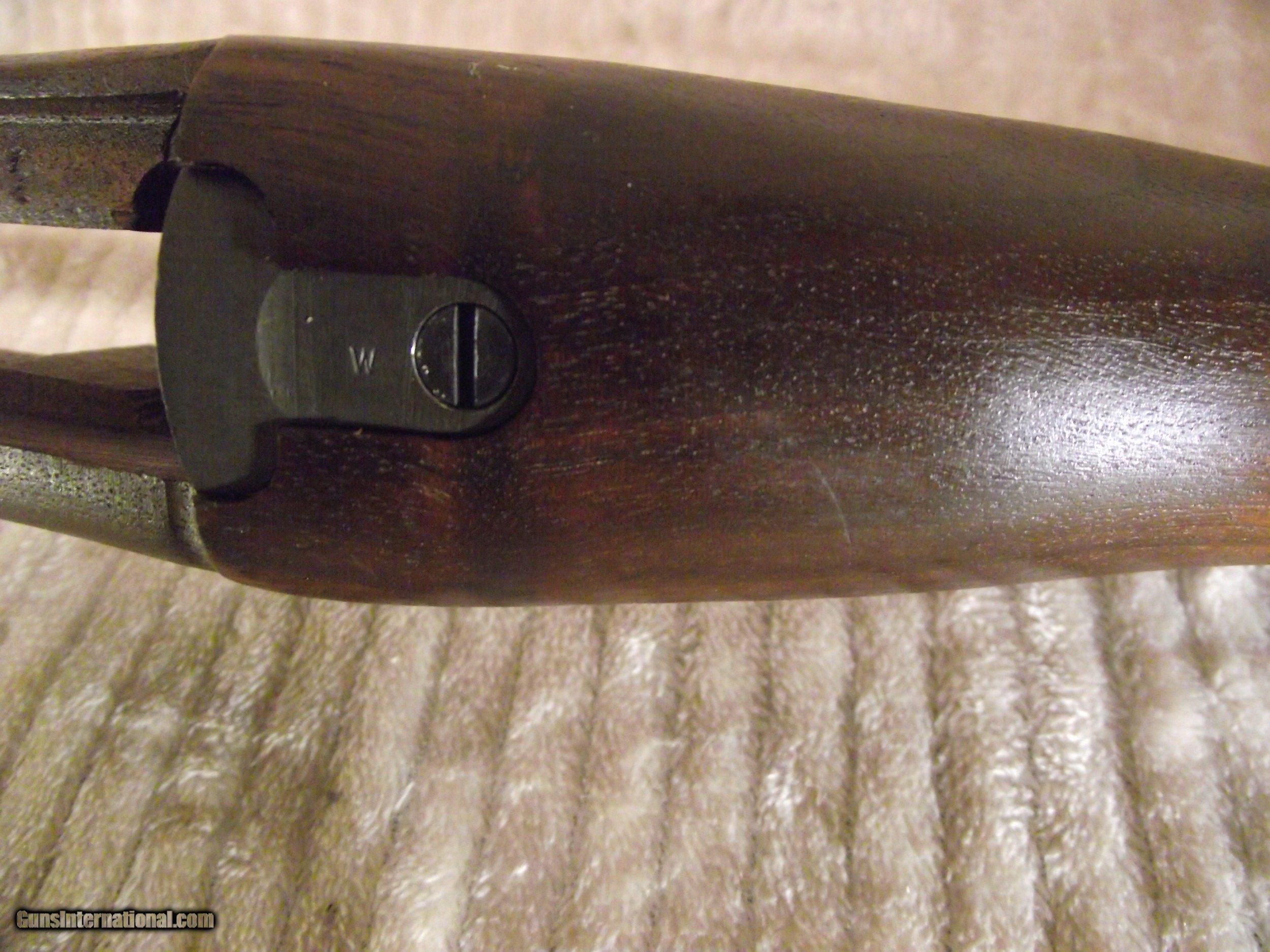 Description: This M1 Carbine is in what I describe as pristine condition. I am not real big on the cosmetics of a firearm though; mostly function. This rifle I am selling likely never experienced field action based on the condition of all of the metal and wood parts. Places on a rifle that ususally show wear or use are not evident with this rifle. There are still small amounts of cosmoline in places and there are no arsenal rebuilt stampings on the underside of the barrel; only an S on the flat surface under the chamber. My rifle has the integrated operating spring tube and not the detachable tube. I have completely dis-assembled this rifle; except the escutcheon and the gas piston nut, due to the likelihood of doing damage. I have test fired 30 rounds through this rifle to assure proper functionality. All of this carbine's parts have been inspected to insure originality as verified by using Roger Larson's book "Comprehensive Guide - M1 Carbine". This book has 829 pages of information, measurements, and descriptions, as well as over 4,000 high quality photographs to reference. There are a few very good books published about the M1 Carbine but I use only this book to determine correctness and to maintain consistency during the survey process. I have taken nearly 200 photos of this rifle and have completed 3 data sheets of this rifle that I can email to you if you are seriously interested. Winchester made it easy to identify their parts because all were stamped at time of manufacture with a W, with the exception of the PW inside an oval border, stamped on the top of the barrel at about 7". The parts not stamped have been determined being correct for its period of production based on manufacturer, date, part type, measurement, and/or rifle serial number. Many times M1 Carbines are advertised as having the correct parts. Do your homework before buying. Included with this rifle are an original WWII sling, oiler, 15 round magazine pouch and two USGI 15 round magazines. The included carry case and field manual are high quality reproductions. I have learned my lesson when buying to get as much true information before "pulling the trigger" and buying. Winchester M1 Carbines are one of the most highly collectible and also one of the most mis-represented; both intentionally and unintentionally. Like other M1 Carbines the Winchester has several unique markings and production types of parts that make them slightly different. Only Underwood made more of its own parts at 35 compared to Winchester at 15 along with the General Motors Saginaw group. The Winchester Carbine stock has a few unique identifying factors as does the barrel set. I purchased this Carbine a long time ago from a retired member of the military. Considering its age it is in pristine condition throughout. The stock has no cracks, splits, or repairs and any evidence of handling marks are visible only by holding the stock at the right angle in the right light. The Cartouche marks are very clear, but no W stamped in the sling well; only the under side of the hand guard. Included with this rifle are an original WWII sling, oiler, 15 round magazine pouch and two USGI 15 round magazines. The included carry case and field manual are high quality reproductions. An M1 Carbine such as this is seldom found. FREE SHIPPING AND FULL INSURANCE INCLUDED within the 48 contiguous states to the verified valid FFL or C&R licensee of your choice. The sale and shipping of this rifle must comply with all state and federal firearms purchase and shipping regulations. Although fully functional this rifle carries no expressed or implied warrantees. Preferred payment is USPS Money Orders or a mutually pre-arranged method. THANK YOU FOR YOUR INTEREST! SOLD Rifle Caliber: .30 Carbine Manufacturer: WINCHESTER Model: M1 Carbine Serial Number: 1243665 Barrel Length: 18 Bore: 4 Lands and Riflings Ejectors: Type 1 Condition: Excellent Metal Condition: Excellent Wood Condition: Excellent Bore Condition: Excellent Barrels: Winchester Original Barrel Type: One piece with Winchester I.D. Stampings Action: Semi-Automatic Triggers: Early Version stamped W Stock: Dark Walnut HIGH WOOD Fore End: Two rivet Finish: WWII Tung Oiled Weight: 5.6 lbs. Sights: Dual Aperture Fixed Rear Manufacture Date: Approx. June '43 Extras: Two USGI Original 15 Round Magazines (BW), Original Two Capacity Buttstock Magazine Pouch, Original Oiler (IS), Original Sling, and High Quality Reproduction Field Manual Case: High Quality Reproduction Zippered Carry Case. Item Location: Texas |