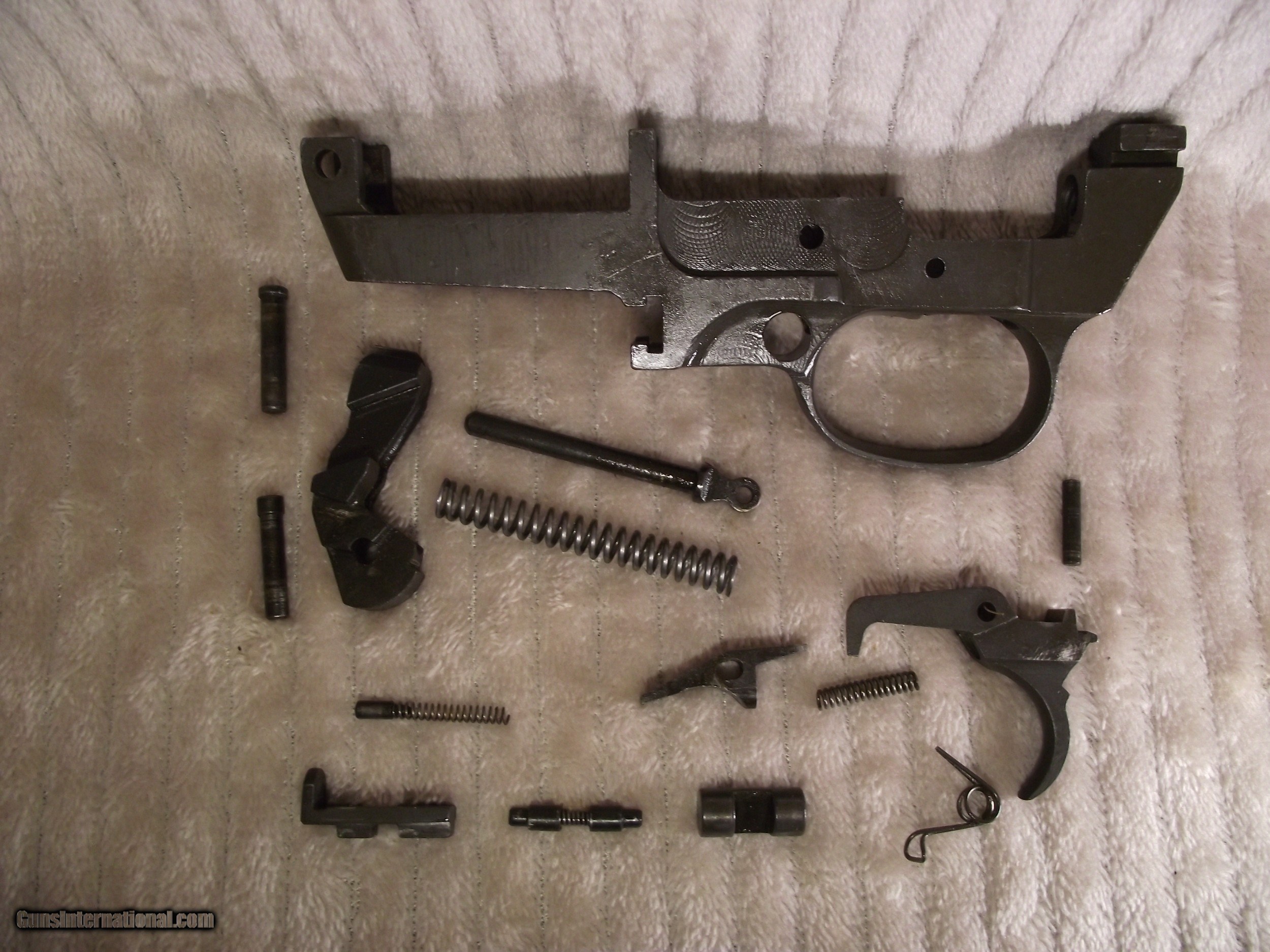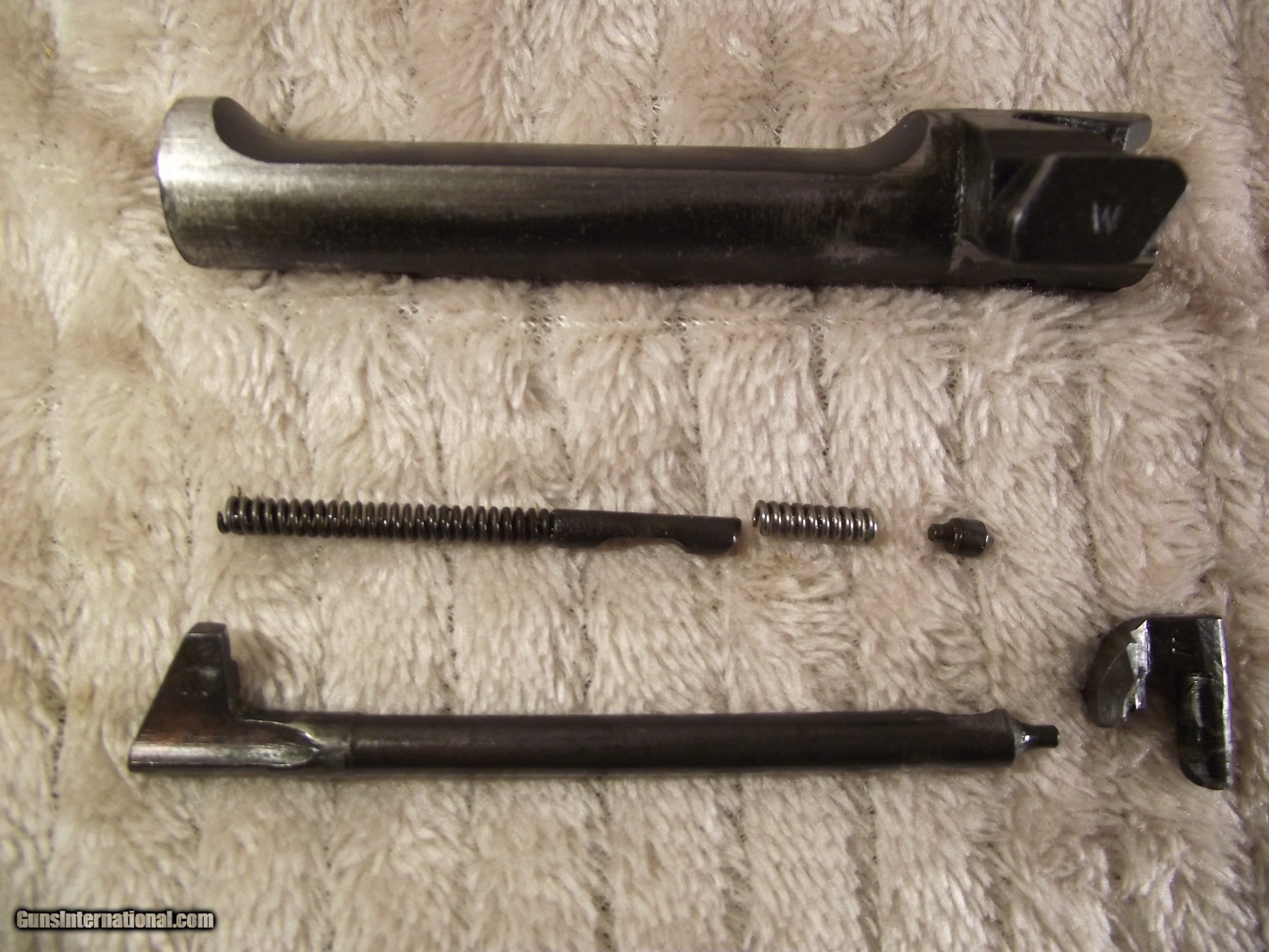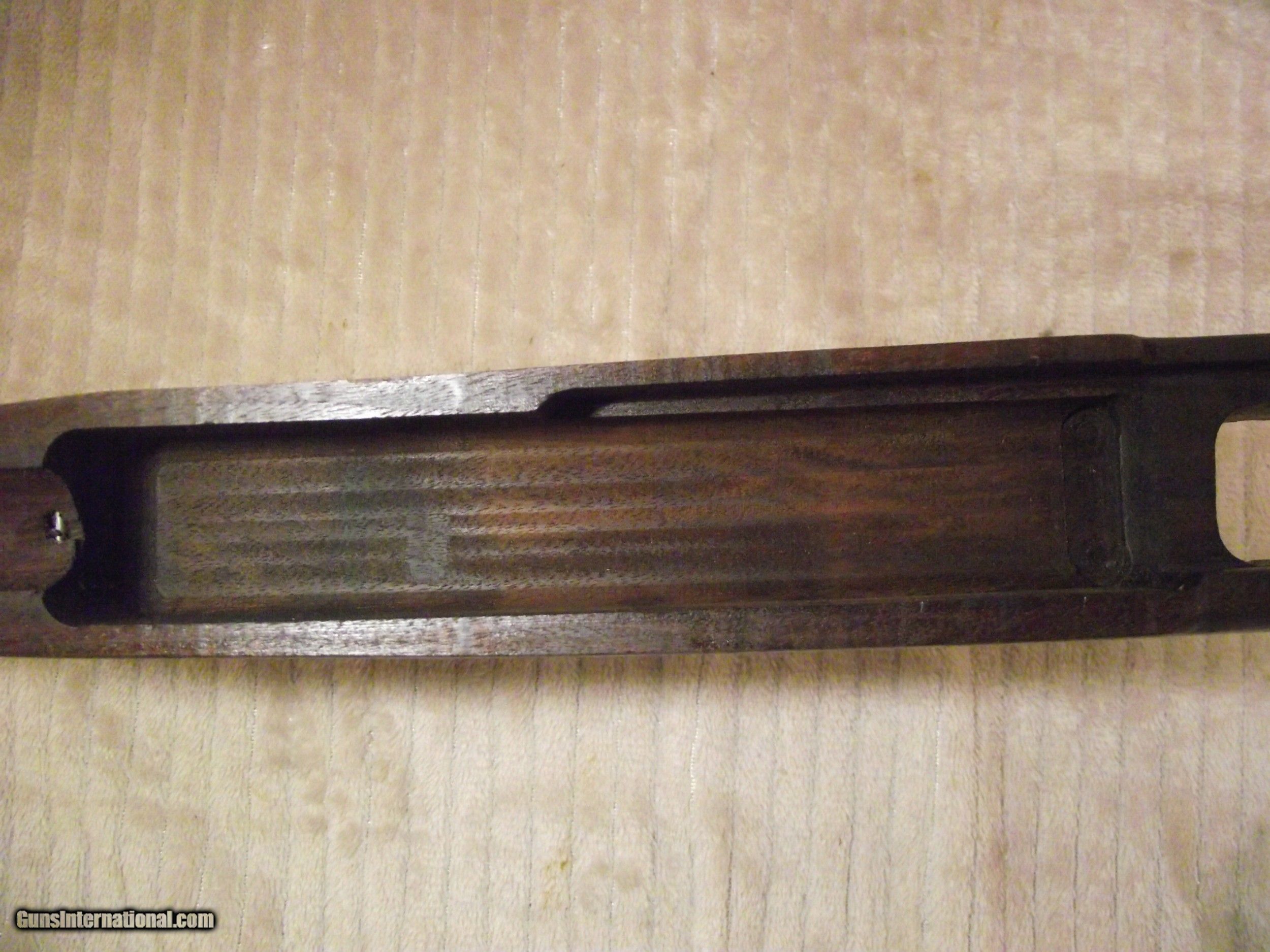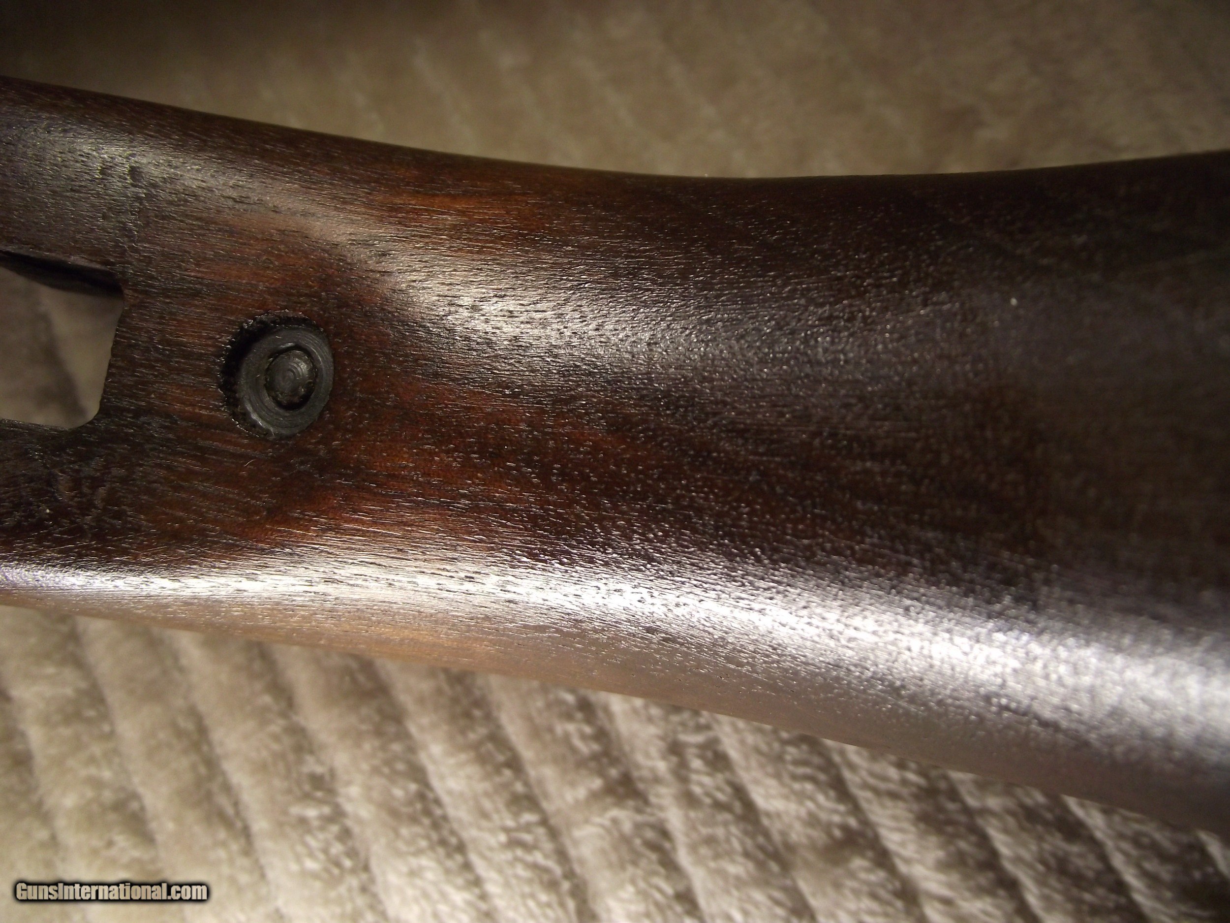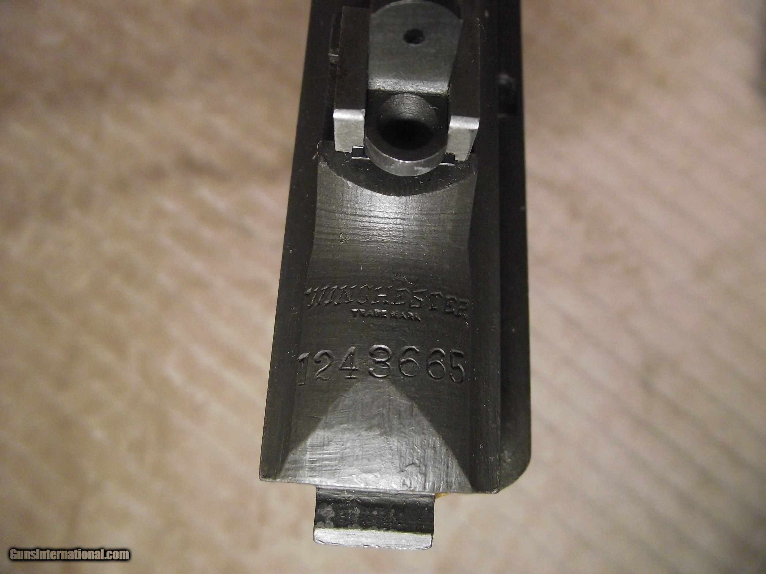 Description: This M1 Carbine is in what I describe as pristine condition. I am not real big on the cosmetics of a firearm though; mostly function. This rifle I am selling likely never experienced field action based on the condition of all of the metal and wood parts. Places on a rifle that ususally show wear or use are not evident with this rifle. There are still small amounts of cosmoline in places and there are no arsenal rebuilt stampings on the underside of the barrel; only an S on the flat surface under the chamber. My rifle has the integrated operating spring tube and not the detachable tube. I have completely dis-assembled this rifle; except the escutcheon and the gas piston nut, due to the likelihood of doing damage. I have test fired 30 rounds through this rifle to assure proper functionality. All of this carbine's parts have been inspected to insure originality as verified by using Roger Larson's book "Comprehensive Guide - M1 Carbine". This book has 829 pages of information, measurements, and descriptions, as well as over 4,000 high quality photographs to reference. There are a few very good books published about the M1 Carbine but I use only this book to determine correctness and to maintain consistency during the survey process. I have taken nearly 200 photos of this rifle and have completed 3 data sheets of this rifle that I can email to you if you are seriously interested. Winchester made it easy to identify their parts because all were stamped at time of manufacture with a W, with the exception of the PW inside an oval border, stamped on the top of the barrel at about 7". The parts not stamped have been determined being correct for its period of production based on manufacturer, date, part type, measurement, and/or rifle serial number. Many times M1 Carbines are advertised as having the correct parts. Do your homework before buying. Included with this rifle are an original WWII sling, oiler, 15 round magazine pouch and two USGI 15 round magazines. The included carry case and field manual are high quality reproductions. I have learned my lesson when buying to get as much true information before "pulling the trigger" and buying. Winchester M1 Carbines are one of the most highly collectible and also one of the most mis-represented; both intentionally and unintentionally. Like other M1 Carbines the Winchester has several unique markings and production types of parts that make them slightly different. Only Underwood made more of its own parts at 35 compared to Winchester at 15 along with the General Motors Saginaw group. The Winchester Carbine stock has a few unique identifying factors as does the barrel set. I purchased this Carbine a long time ago from a retired member of the military. Considering its age it is in pristine condition throughout. The stock has no cracks, splits, or repairs and any evidence of handling marks are visible only by holding the stock at the right angle in the right light. The Cartouche marks are very clear, but no W stamped in the sling well; only the under side of the hand guard. Included with this rifle are an original WWII sling, oiler, 15 round magazine pouch and two USGI 15 round magazines. The included carry case and field manual are high quality reproductions. An M1 Carbine such as this is seldom found. FREE SHIPPING AND FULL INSURANCE INCLUDED within the 48 contiguous states to the verified valid FFL or C&R licensee of your choice. The sale and shipping of this rifle must comply with all state and federal firearms purchase and shipping regulations. Although fully functional this rifle carries no expressed or implied warrantees. Preferred payment is USPS Money Orders or a mutually pre-arranged method. THANK YOU FOR YOUR INTEREST! SOLD Rifle Caliber: .30 Carbine Manufacturer: WINCHESTER Model: M1 Carbine Serial Number: 1243665 Barrel Length: 18 Bore: 4 Lands and Riflings Ejectors: Type 1 Condition: Excellent Metal Condition: Excellent Wood Condition: Excellent Bore Condition: Excellent Barrels: Winchester Original Barrel Type: One piece with Winchester I.D. Stampings Action: Semi-Automatic Triggers: Early Version stamped W Stock: Dark Walnut HIGH WOOD Fore End: Two rivet Finish: WWII Tung Oiled Weight: 5.6 lbs. Sights: Dual Aperture Fixed Rear Manufacture Date: Approx. June '43 Extras: Two USGI Original 15 Round Magazines (BW), Original Two Capacity Buttstock Magazine Pouch, Original Oiler (IS), Original Sling, and High Quality Reproduction Field Manual Case: High Quality Reproduction Zippered Carry Case. Item Location: Texas |