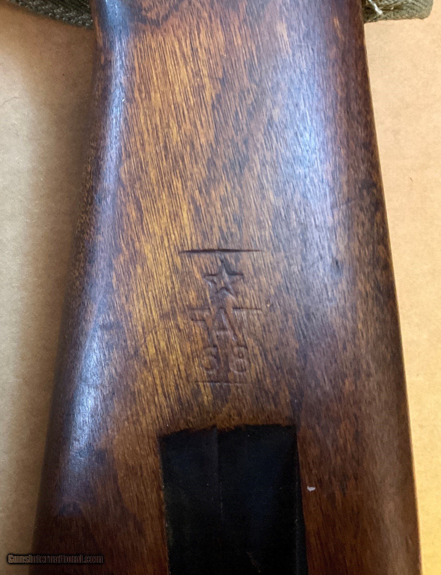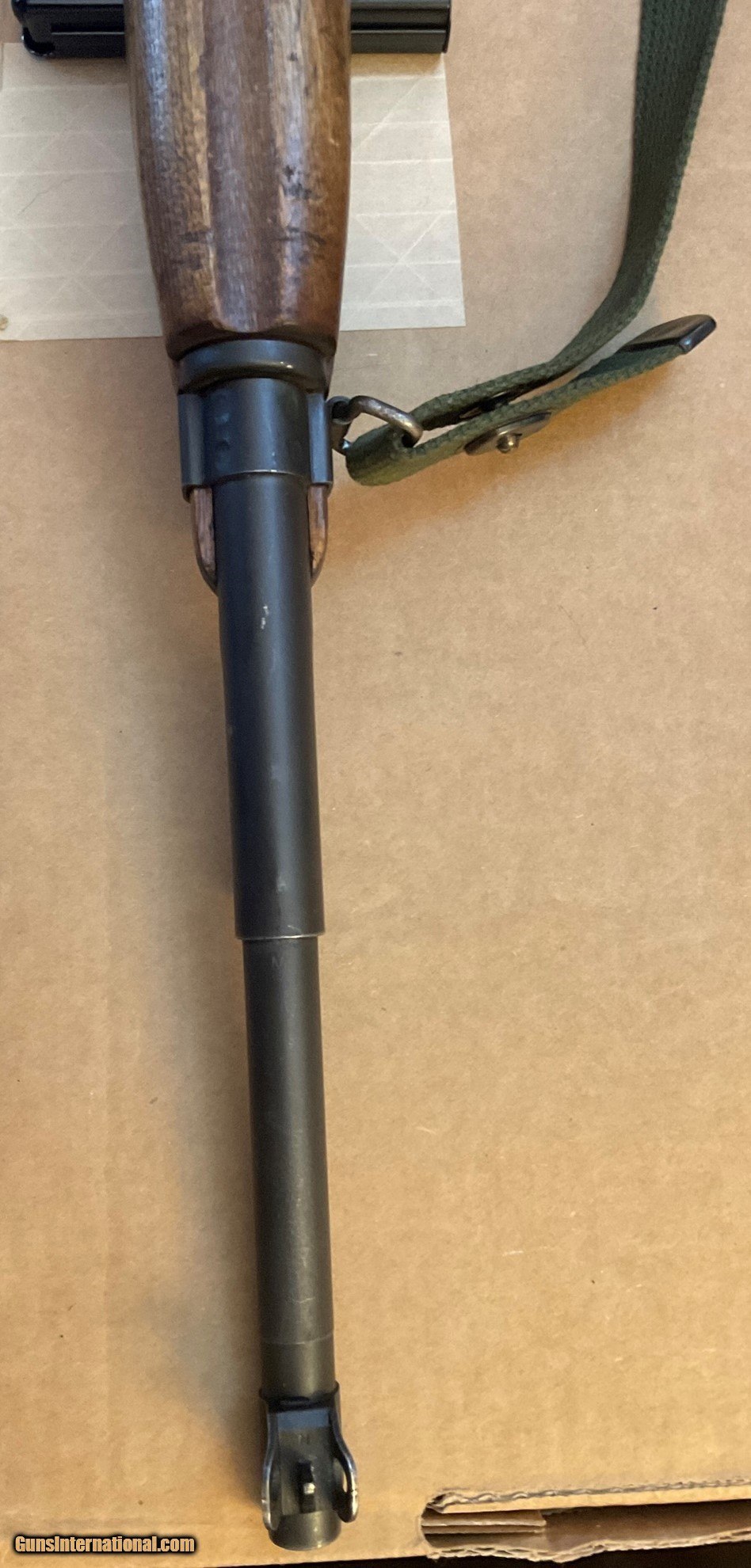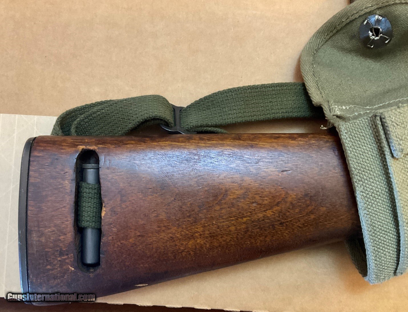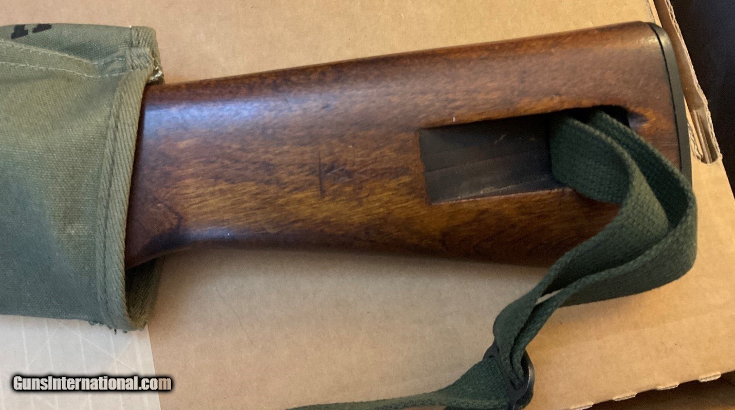 Description: WWII M1 Carbine manufactured by Winchester in March 1944, serial #56453xx, in very good condition. It comes with two recent manufacture 15-round magazines, and replica mag pounch, sling and oiler. This rifle is a CMP Italian return, as indicated by the "Star-FAT-68" cartouche on the left side of the buttstock. FAT stands for Fabbrica d'Armi a Terni, which is the Italian arsenal where the rifle was inspected in 1968. It was subsequently returned to the CMP in the U.S. There are no import markings. The bore and rifling are good. Other markings and characteristics include: Bolt: Early to mid-war flat bolt Sights: P.I.-marked (Inland) Type II milled adjustable rear sight, N-marked front sight Magazine Release: M-marked Type II magazine release Other: Type III barrel band with bayonet lug and the initials J.M.Q. and late-war rotary style safety The stock is a Type III late war low wood version in very good shape with normal wear and usage marks. There is a small scrape/dimple on the bottom side of the stock towards the barrel band (see pictures of underside of rifle). The stock has the oval-shaped oiler recess in the rear portion of the buttstock that doubles as a rear sling mount point. Both a replica oiler and replica sling are included in this listing. The handguard is a 4-rivet version. SHIPPING: Shipping is $65 (USPS Priority Mail only, Signature Required, Insured) within contiguous U.S. 48 states. Shipping to Alaska is billed at actual cost. No shipping to the states listed in Restrictions & Limitations, below. RESTRICTIONS & LIMITATIONS: The following restrictions and limitations apply to this listing. • All firearms are required to be shipped to a FFL in the State of the buyer's residence. No C&R licenses accepted for this rifle. • No International Sales • Must be 21 years old or older to purchase any handgun. • Must be 21 years old or older to purchase a long gun (rifle, shotgun) in Colorado, Delaware, Florida, New York, Rhode Island, Vermont and Washington. • This item is not for sale to the following states and locales: California, Colorado, Connecticut, District of Columbia, Hawaii, Illinois, Maryland, Massachusetts, New Jersey, New York, Rhode Island, Vermont, Washington or U.S. Territories. PAYMENT: Accepted forms of payment include VISA, M/C, Discover and AMEX. No credit card fee. Please call us to arrange payment. SOLD Rifle Caliber: .30 Carbine Manufacturer: Winchester Model: U.S. Carbine M1 Serial Number: 5645387 Condition: Very good Bore Condition: Good |