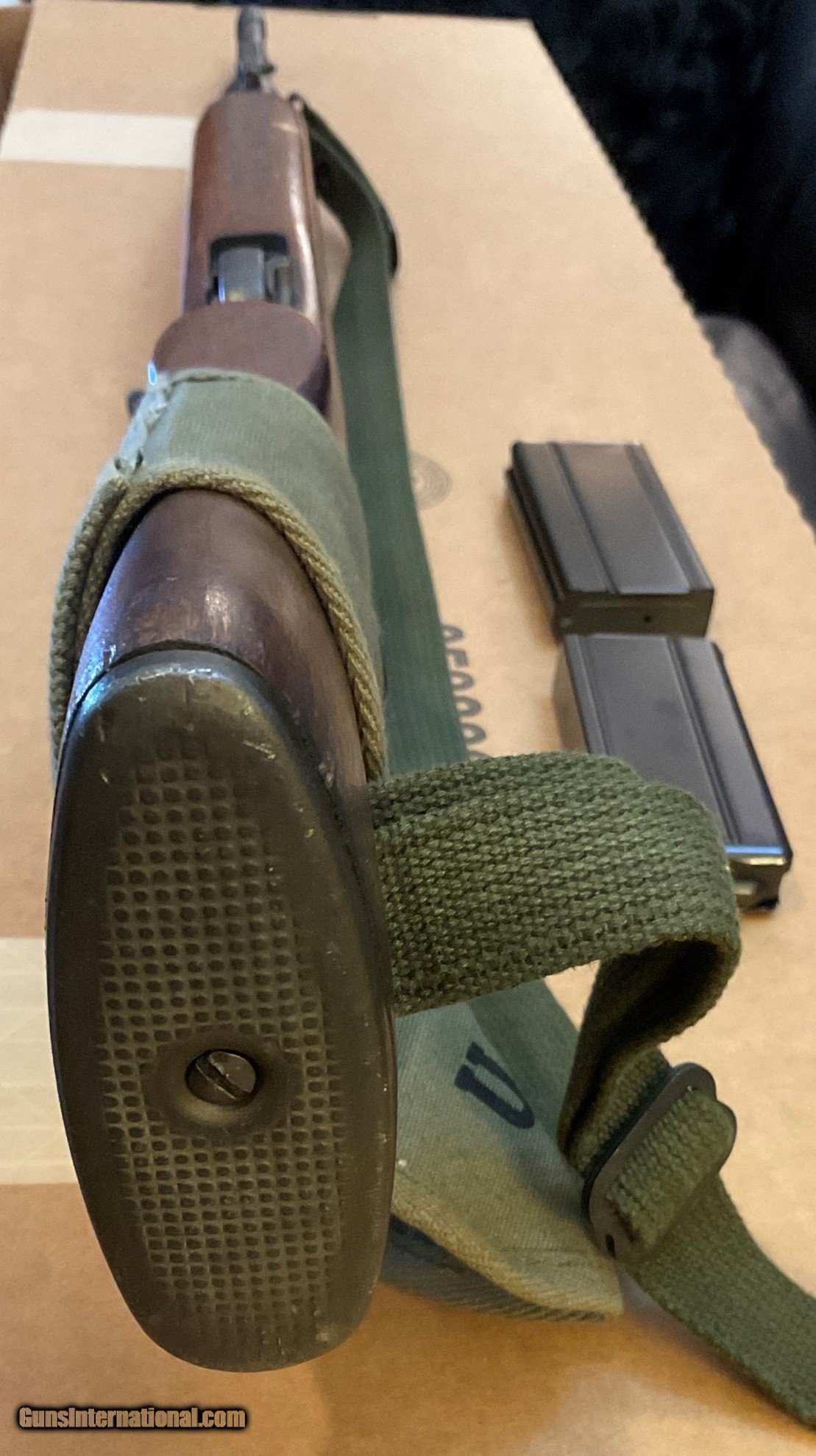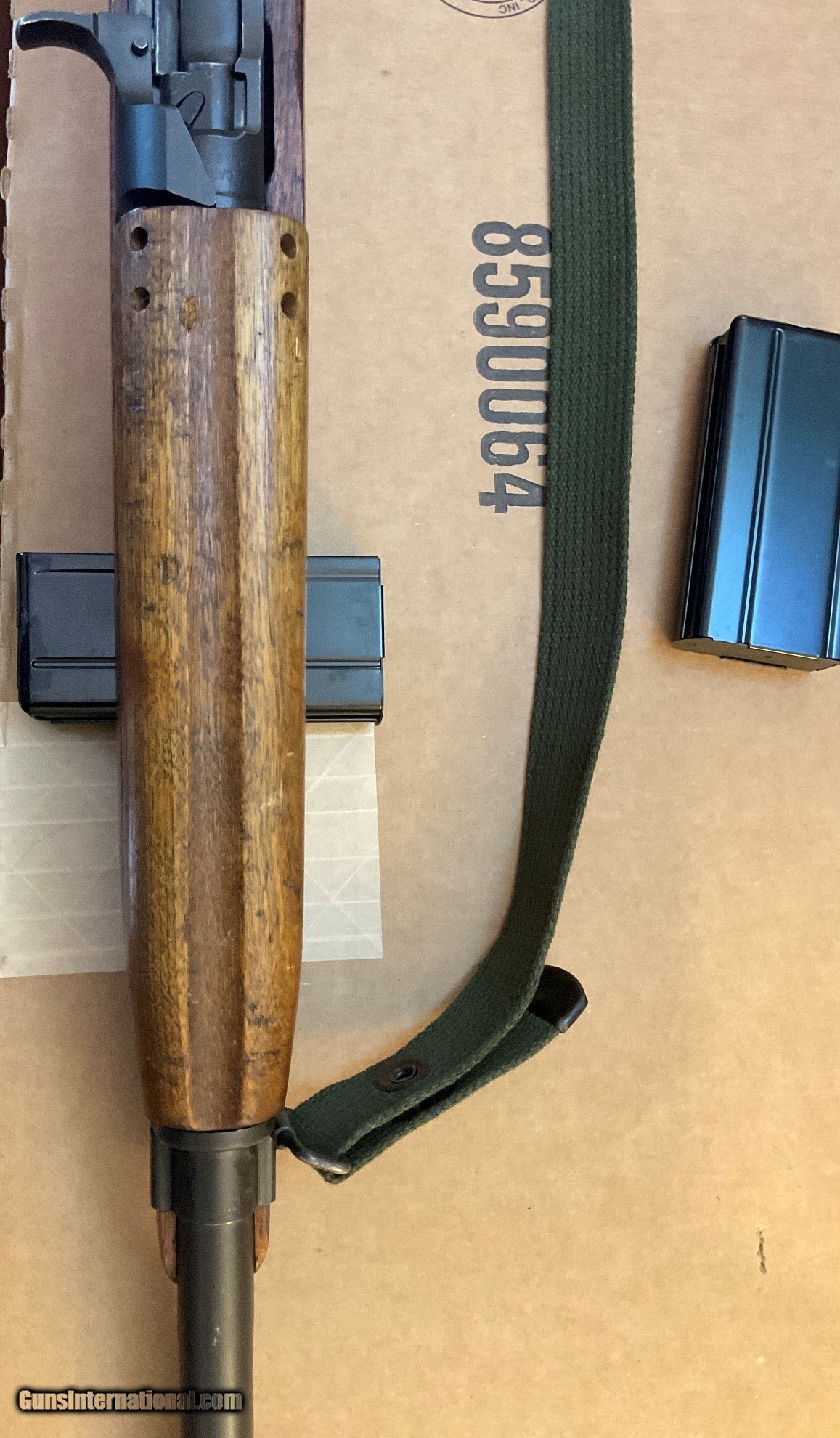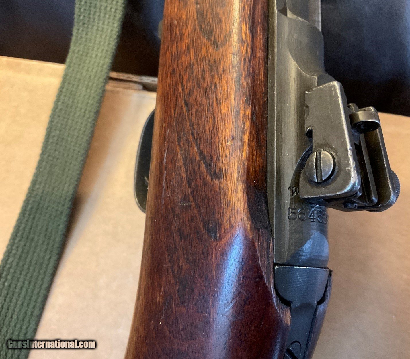 Description: WWII M1 Carbine manufactured by Winchester in March 1944, serial #56453xx, in very good condition. It comes with two recent manufacture 15-round magazines, and replica mag pounch, sling and oiler. This rifle is a CMP Italian return, as indicated by the "Star-FAT-68" cartouche on the left side of the buttstock. FAT stands for Fabbrica d'Armi a Terni, which is the Italian arsenal where the rifle was inspected in 1968. It was subsequently returned to the CMP in the U.S. There are no import markings. The bore and rifling are good. Other markings and characteristics include: Bolt: Early to mid-war flat bolt Sights: P.I.-marked (Inland) Type II milled adjustable rear sight, N-marked front sight Magazine Release: M-marked Type II magazine release Other: Type III barrel band with bayonet lug and the initials J.M.Q. and late-war rotary style safety The stock is a Type III late war low wood version in very good shape with normal wear and usage marks. There is a small scrape/dimple on the bottom side of the stock towards the barrel band (see pictures of underside of rifle). The stock has the oval-shaped oiler recess in the rear portion of the buttstock that doubles as a rear sling mount point. Both a replica oiler and replica sling are included in this listing. The handguard is a 4-rivet version. SHIPPING: Shipping is $65 (USPS Priority Mail only, Signature Required, Insured) within contiguous U.S. 48 states. Shipping to Alaska is billed at actual cost. No shipping to the states listed in Restrictions & Limitations, below. RESTRICTIONS & LIMITATIONS: The following restrictions and limitations apply to this listing. • All firearms are required to be shipped to a FFL in the State of the buyer's residence. No C&R licenses accepted for this rifle. • No International Sales • Must be 21 years old or older to purchase any handgun. • Must be 21 years old or older to purchase a long gun (rifle, shotgun) in Colorado, Delaware, Florida, New York, Rhode Island, Vermont and Washington. • This item is not for sale to the following states and locales: California, Colorado, Connecticut, District of Columbia, Hawaii, Illinois, Maryland, Massachusetts, New Jersey, New York, Rhode Island, Vermont, Washington or U.S. Territories. PAYMENT: Accepted forms of payment include VISA, M/C, Discover and AMEX. No credit card fee. Please call us to arrange payment. SOLD Rifle Caliber: .30 Carbine Manufacturer: Winchester Model: U.S. Carbine M1 Serial Number: 5645387 Condition: Very good Bore Condition: Good |