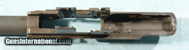 Description: EARLY WW2 SPRINGFIELD U.S. M-1 OR M1 GARAND RIFLE ACTION RECEIVER & BARREL, CIRCA JAN. 1942. Serial number "4536XX" and in it's original parkerized finish now fading but crisp stampings, barrel threads and edges. Drawing markings on receiver leg "D 28291-14 S A" along with crips heat treat stamps. Aftermarket parkerized new barrel already properly grooved and drilled for Garand rebuild having mint unused bore and stamped "30-06" on top 4" from receiver. All original cuts, slots and grooves for parts on action are sound and edges crisp so should make a nice platform for early war rebuild. SOLD Curio/Relic: Yes |