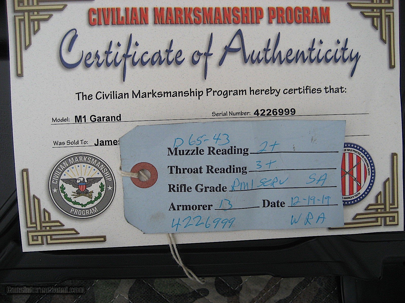 Description: Springfield M1 Garand manufactured during Korean War in 1952. Meets Civilian Marksmanship program RM1 Service certification requirements as shown in included documents. Springfield arms serial numbers on all mechanical functional parts including barrel, operating rod and trigger housing group. Stock has been replaced with CMP logoed new stock. SN 4226999. Comes with CMP Literature and CMP marked gun case. Barrel shiny throughout with no rust or pitting. No rust on rifle. CMP authenticated. Comes with hard carrying and storage case, CMP instruction booklet, Enblock clip and safety flag device. Ships by USPO. Accept PayPal, Cashiers Check or Money order for payment. Shipping $50.00. Insurance $1.00 per hundred$. FFL or C&R License OK. Helmet in pictures not included. SOLD Curio/Relic: Yes Manufacturer: Springfield Armory Model: M1 Garand Serial Number: 4226999 Caliber Info: 30.06 Bore: 2+ Chambers: 3+ Condition: CMP Service Metal Condition: Good Wood Condition: New Bore Condition: Fine Action: Semi-automatic Stock: Wood Weight: 9.5 Item Location: 77136 |