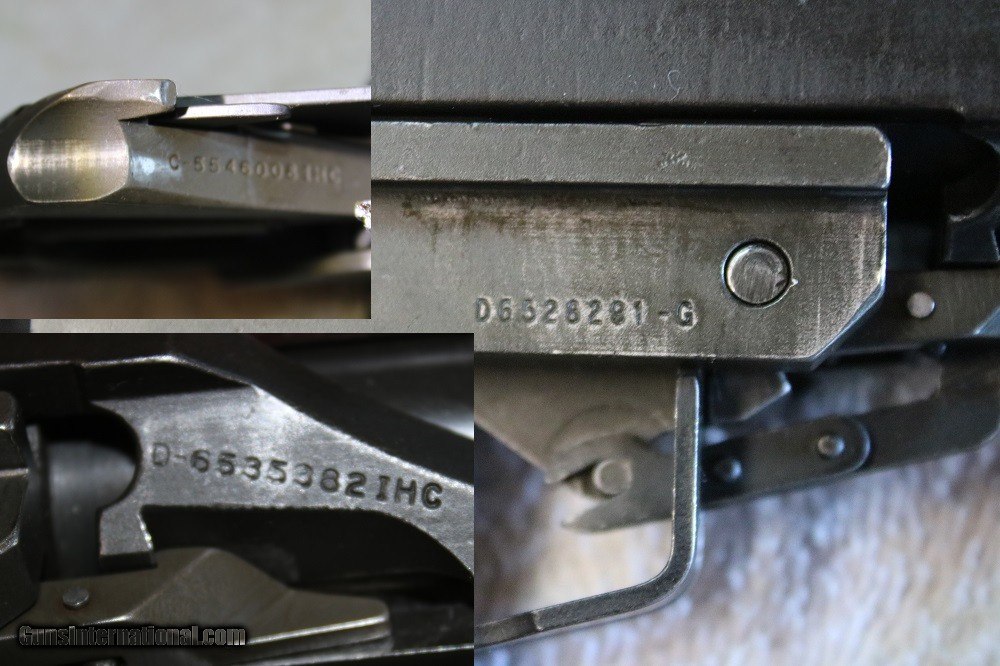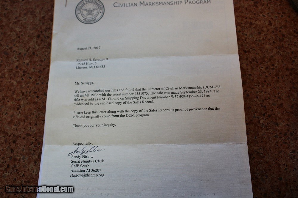 Description: For your consideration is a "Postage Stamp" International Harvestor DCM rifle sold December, 1984 with Provenance, MRT sling, CMP owner's manual and 2 new clips. This Garand was a "once in a lifetime" rifle until 1995 when rifles began returning from foreign countries. This M1 has a LMR(Line Material Corp) barrel dated 5 53 with a ME of 1.9 and a bright, excellent bore. All major parts are marked IHC and include the trigger housing, windage knob, trigger, operating rod, hammer, bolt and gas cylinder plug. The stock has the proper DOD cartouche that was struck on it's side(it happened), a circle P on the grip and Julian date 3502 inside of the barrel channel. The stock was manufactured by the S. E. Overton Company on Dec 15, 1952. The stock and handguards are nicely color matching and the metal is outstanding. I test fired this rifle some years ago and it operated flawlessly. $1900 buy it now delivered fully insured to your FFL/C&R, $50 rebate for First Responders and Veterans. SOLD Curio/Relic: Yes |